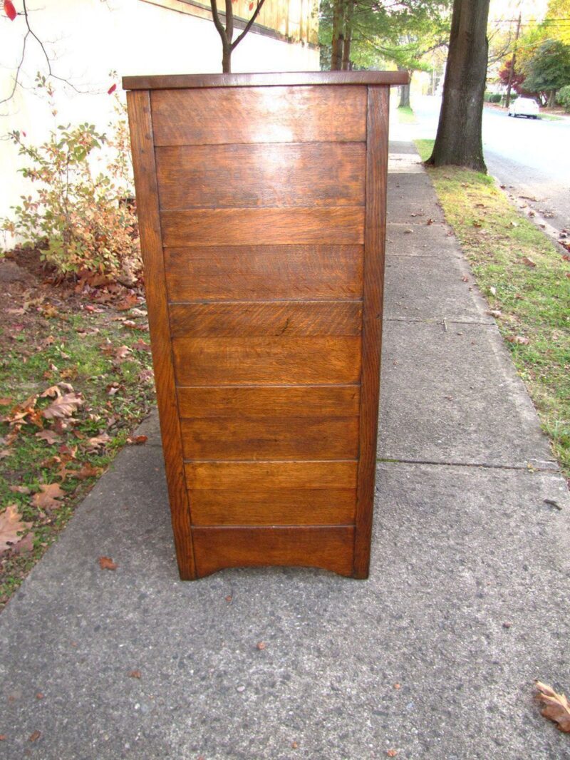 The piece is made of very good selection of quart sawn oak?with light overcoat over clean original finish.