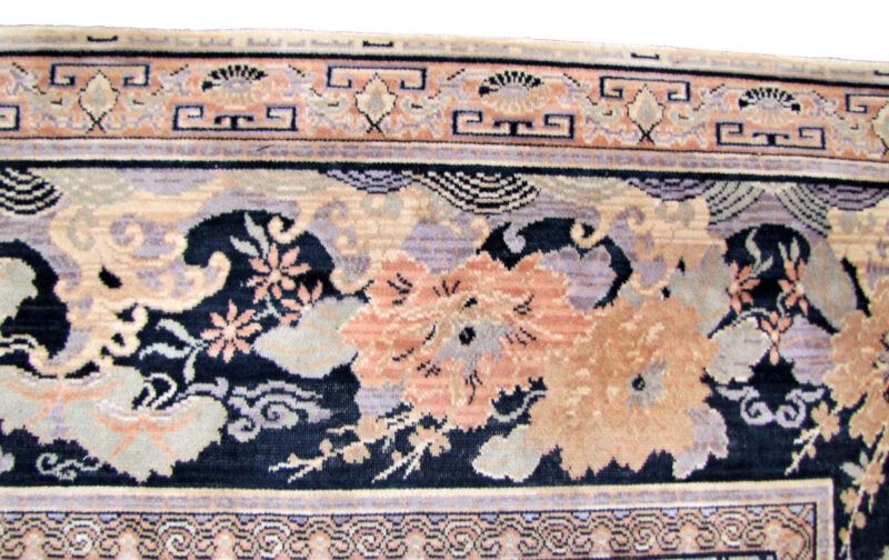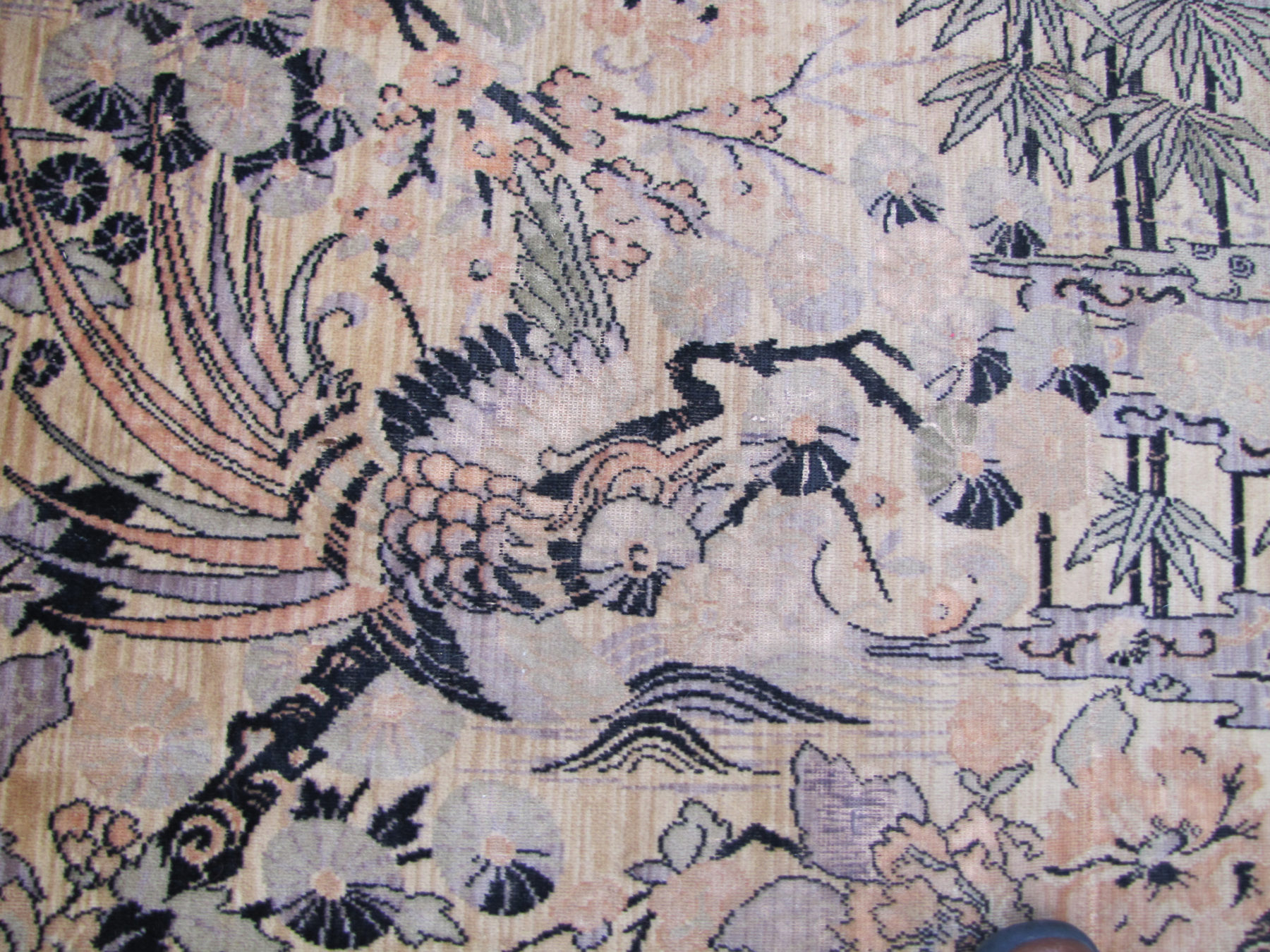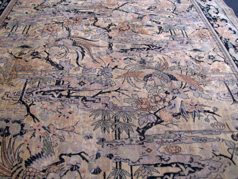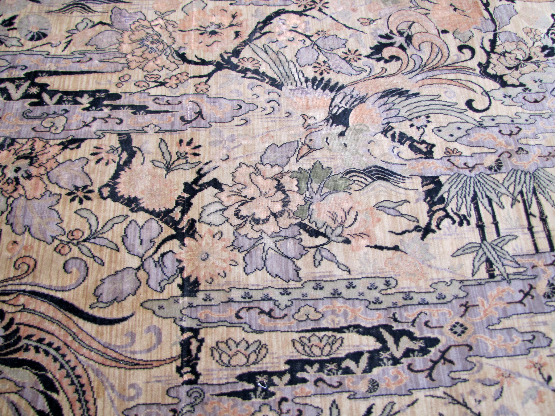 This is Antique ANGLO PERSIAN rug from the early 1900s in good condition with no missing but with low area. The rug is in BIRD of PARADISE Arts&Crafts design with great antique soft colors.