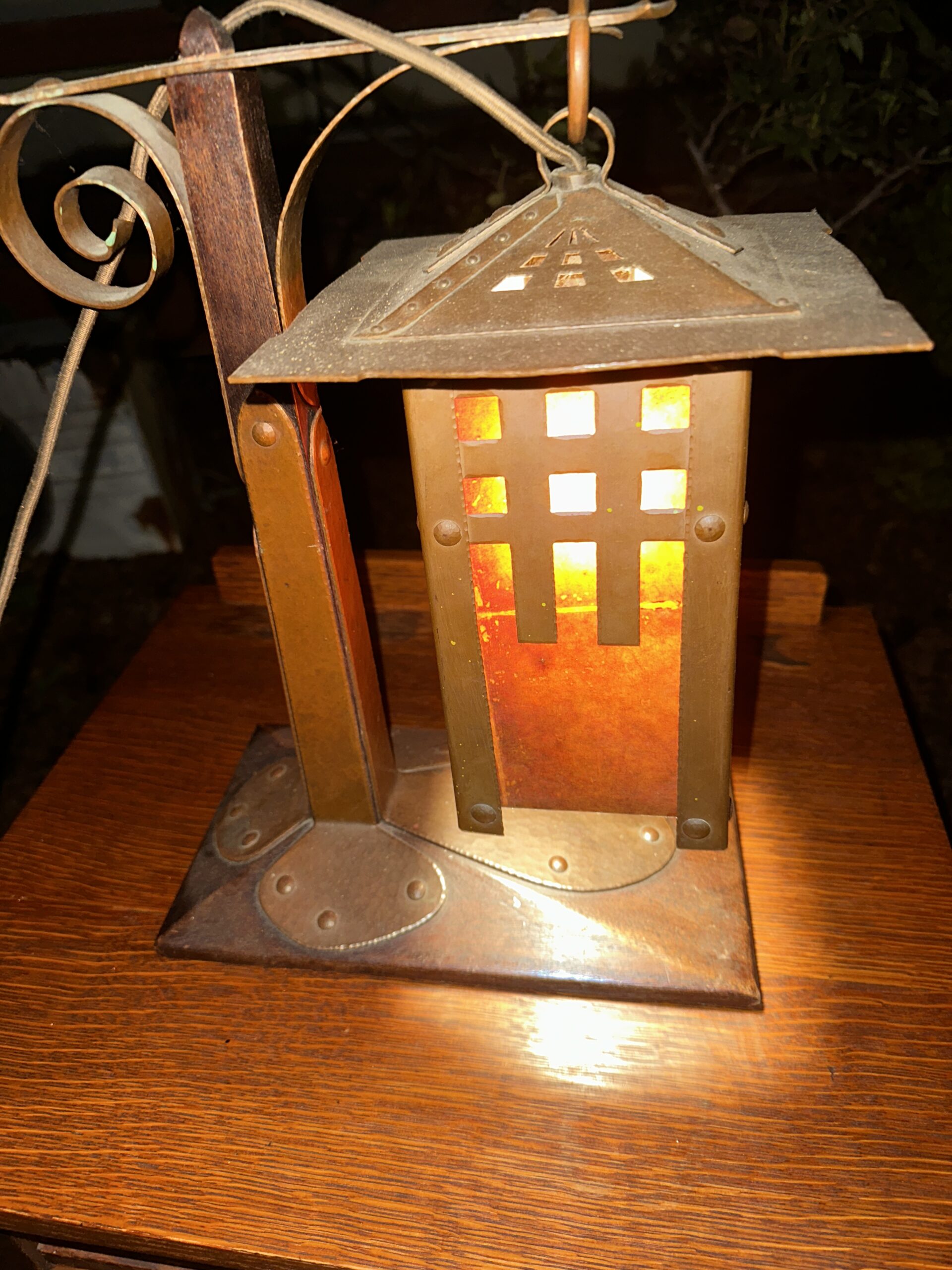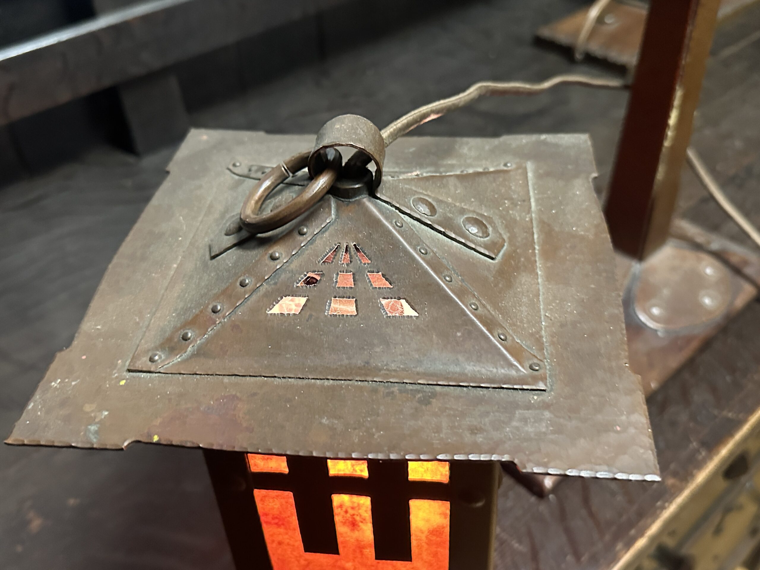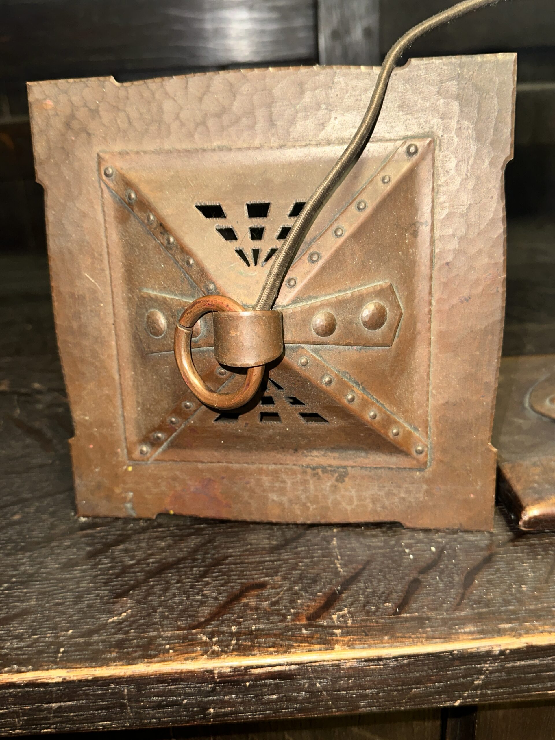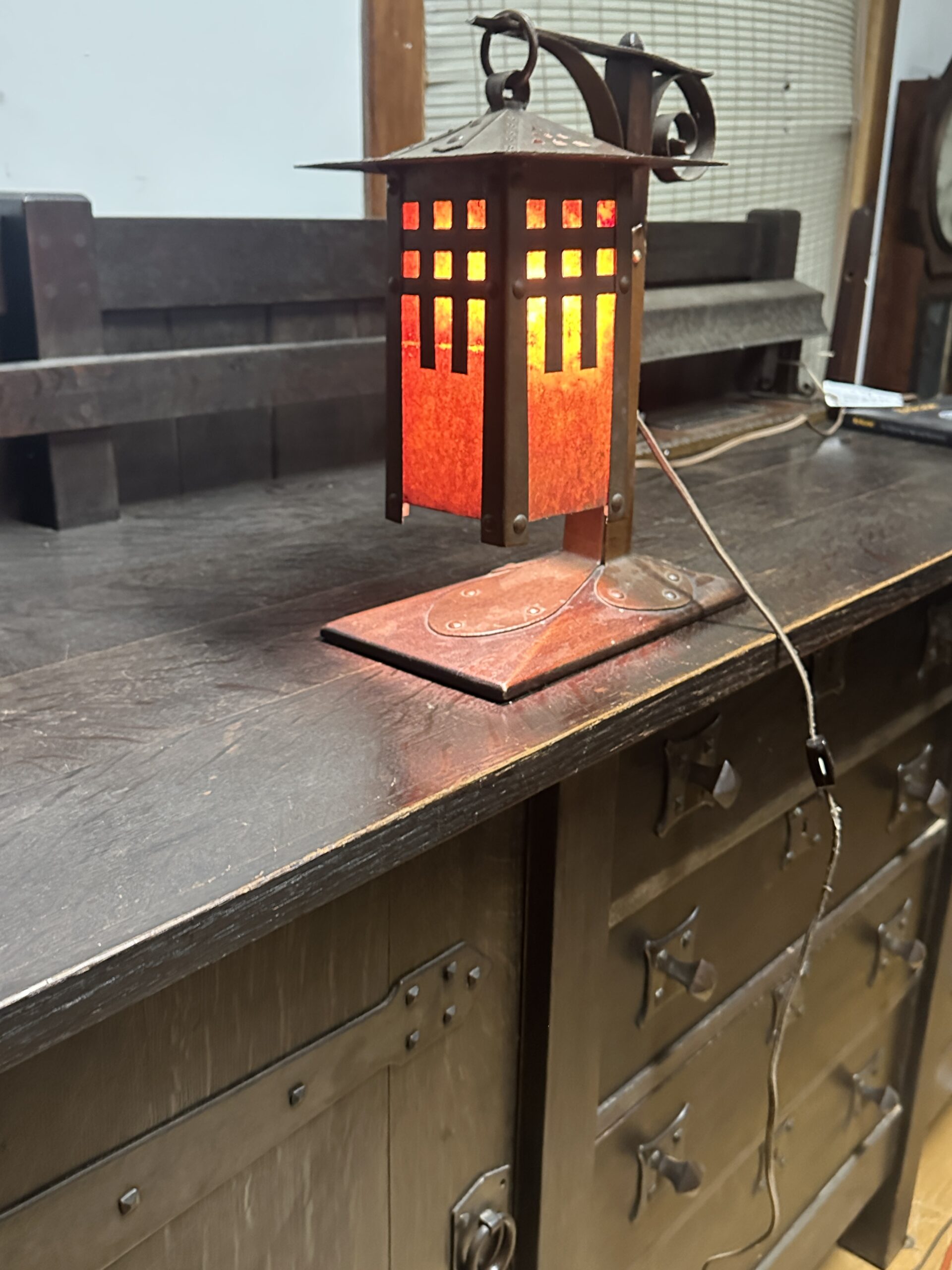 This is one of the nicest Benedict Studio Hand Hammered Lamps we’ve seen in the past 50 years. The hand-hammered base has great hammering and the mica shade has period glass, not modern, new glass. It is all original.