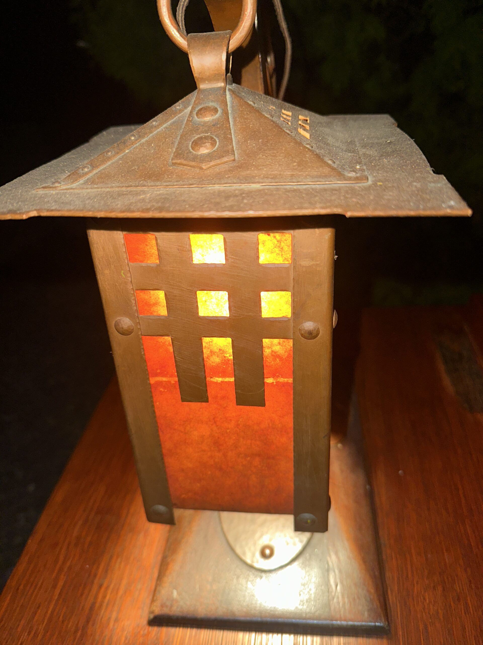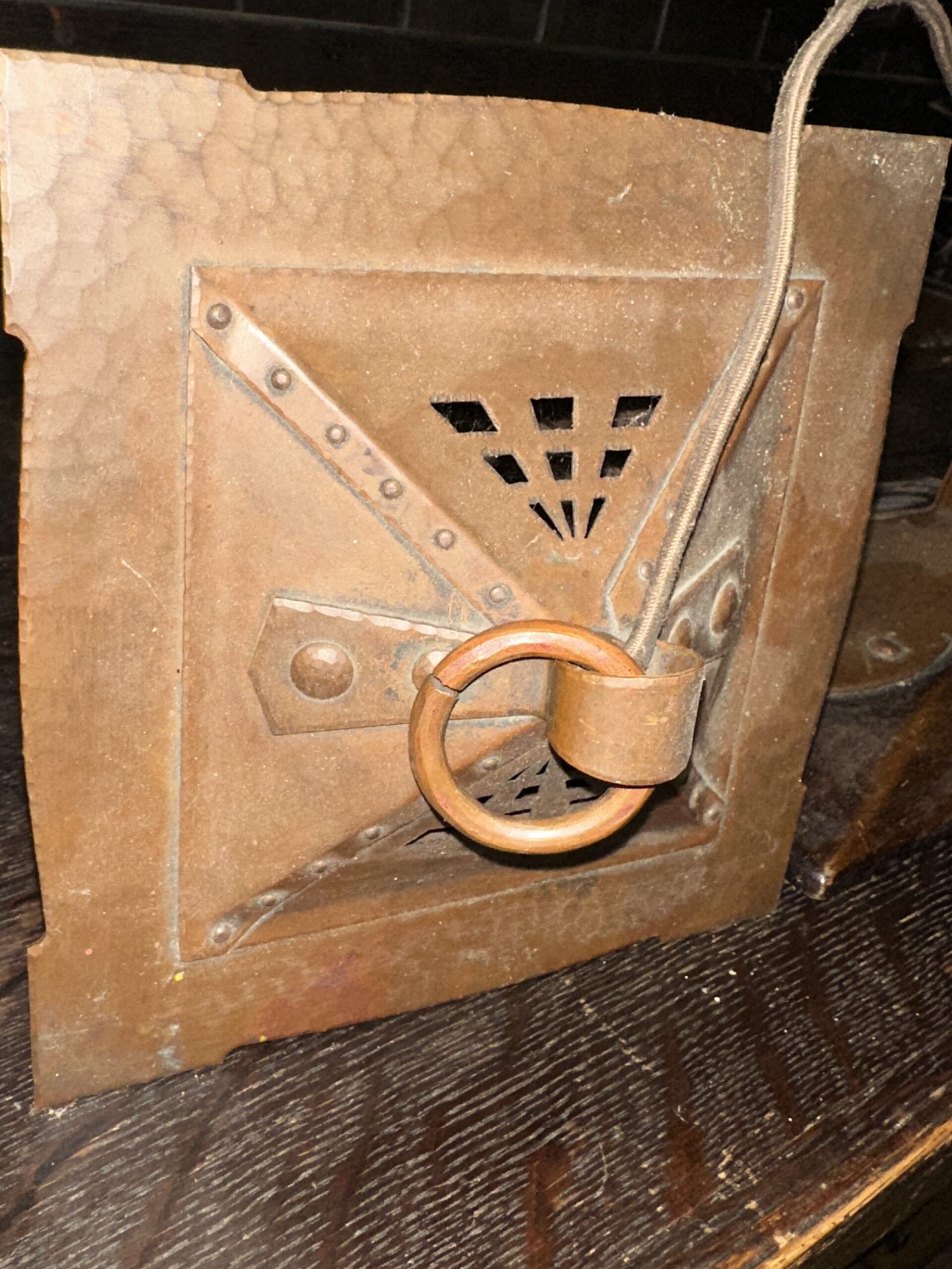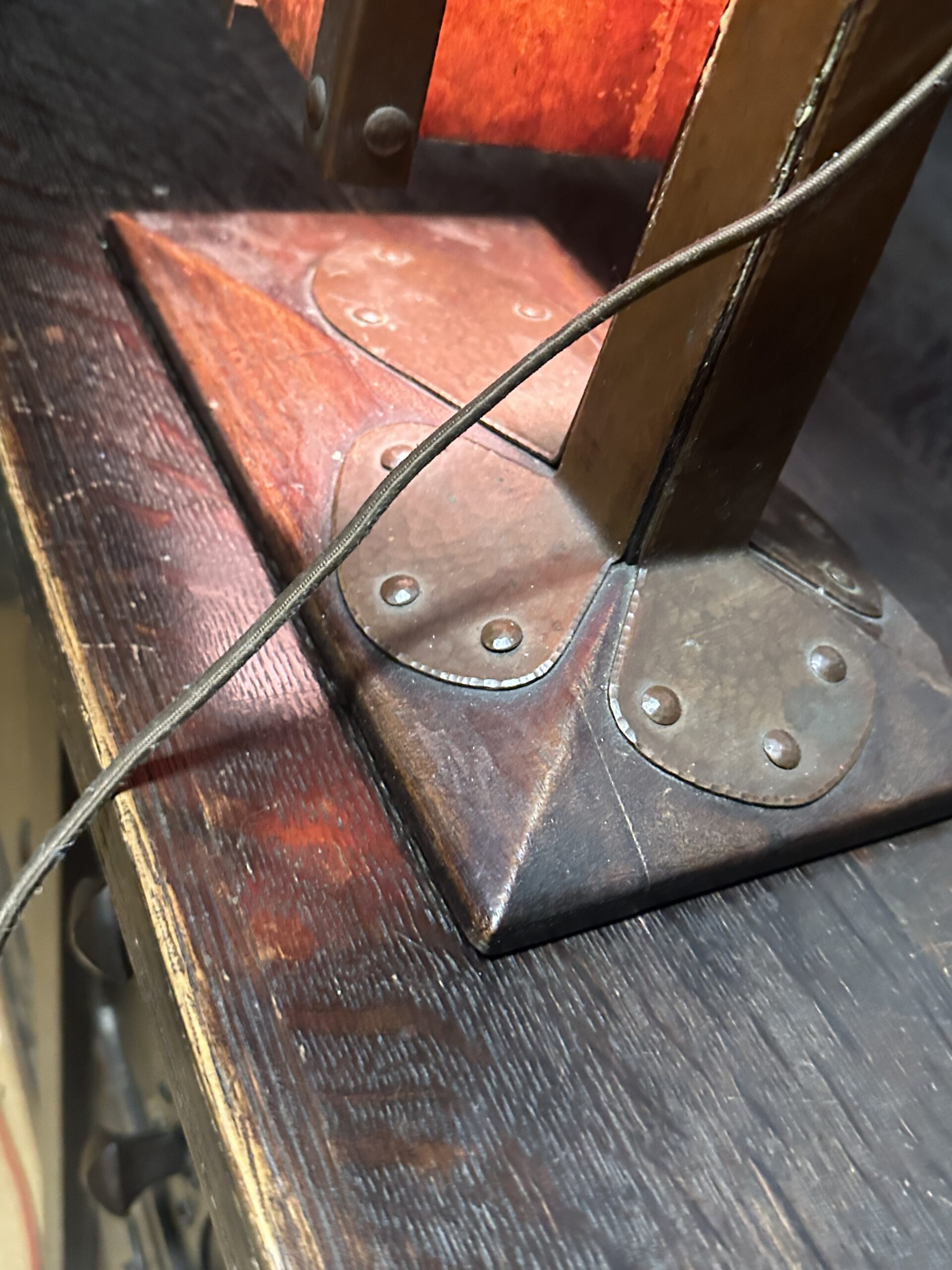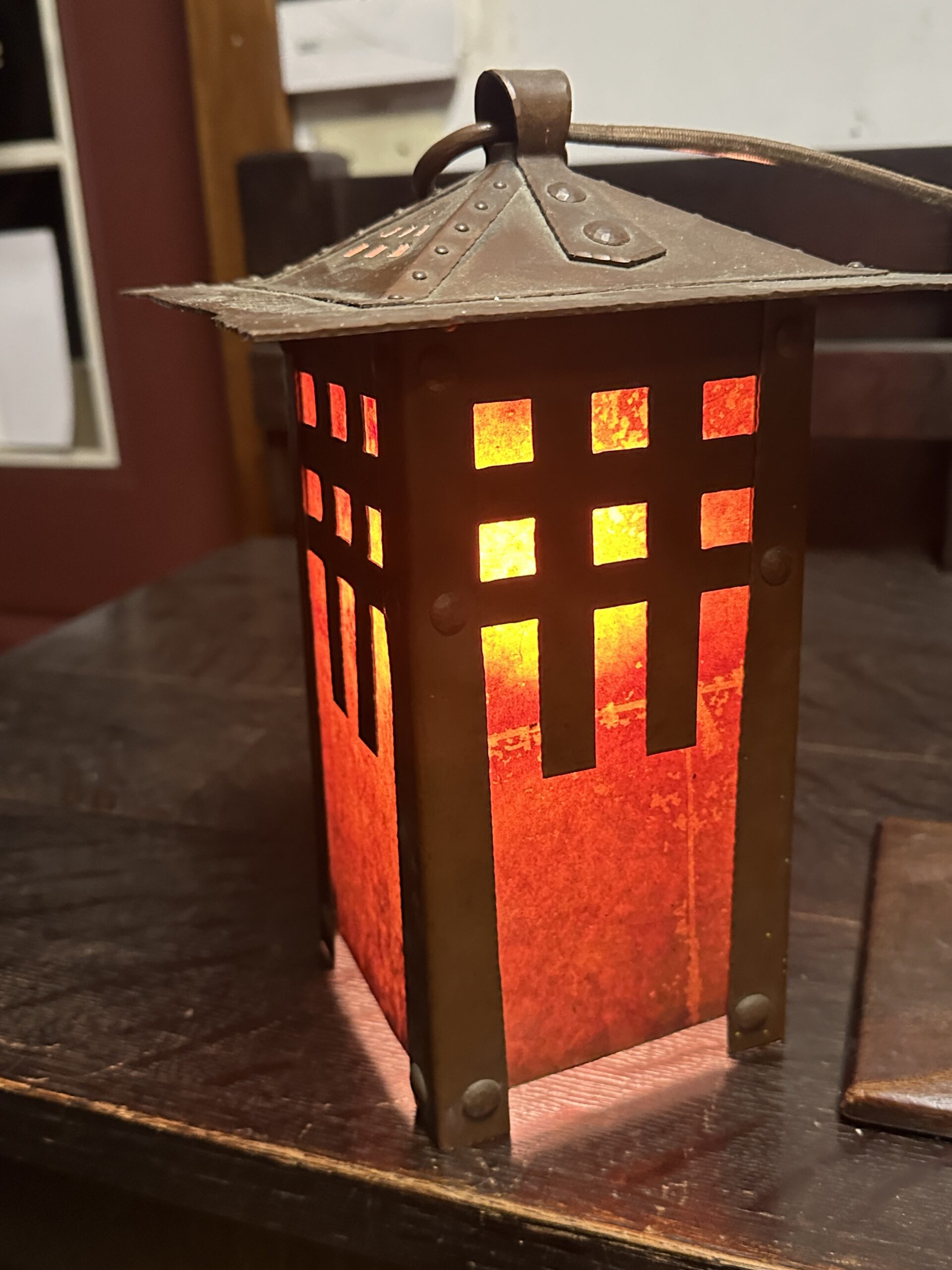 This is one of the nicest Benedict Studio Hand Hammered Lamps we’ve seen in the past 50 years. The hand-hammered base has great hammering and the mica shade has period glass, not modern, new glass. It is all original.
