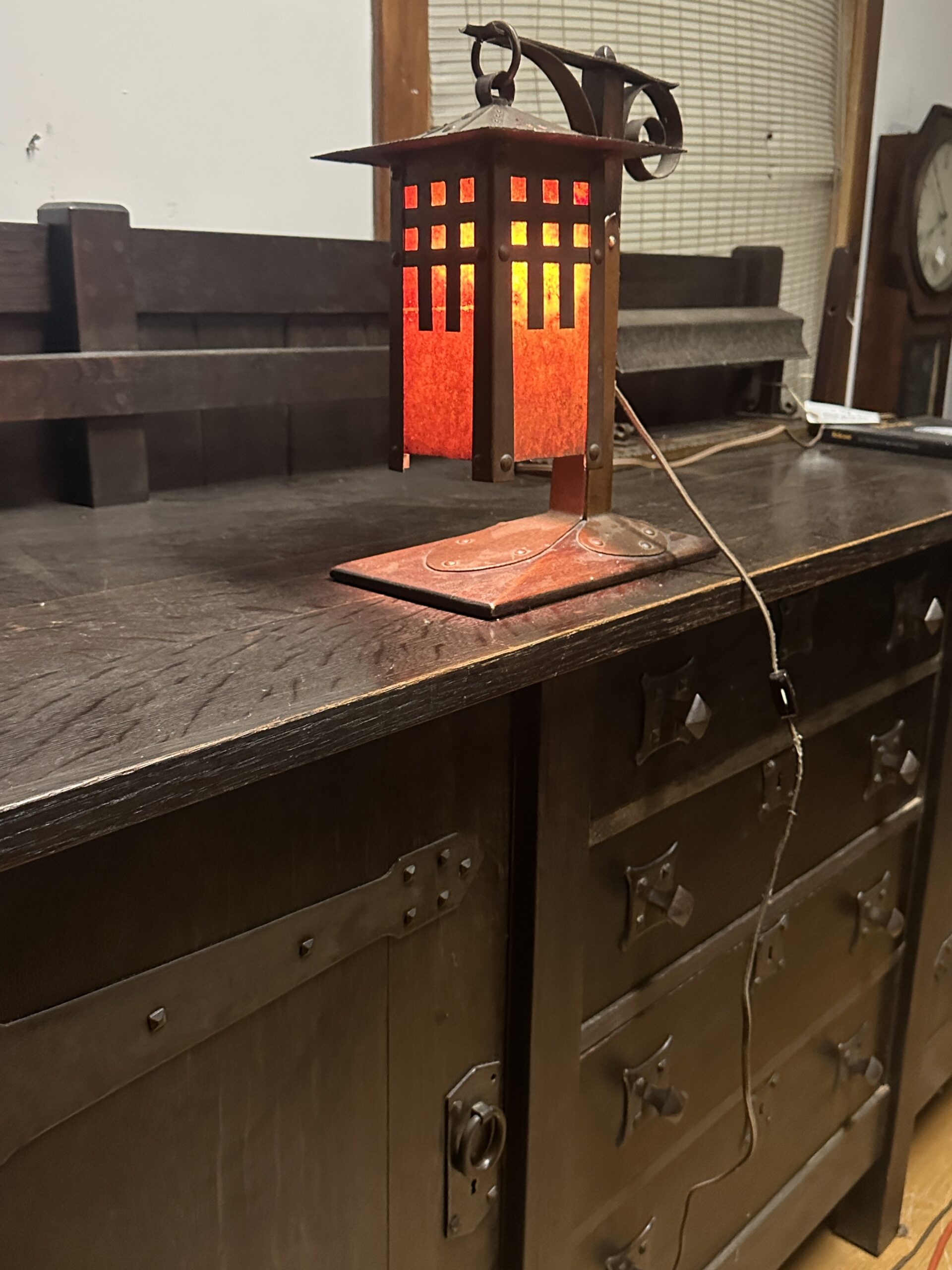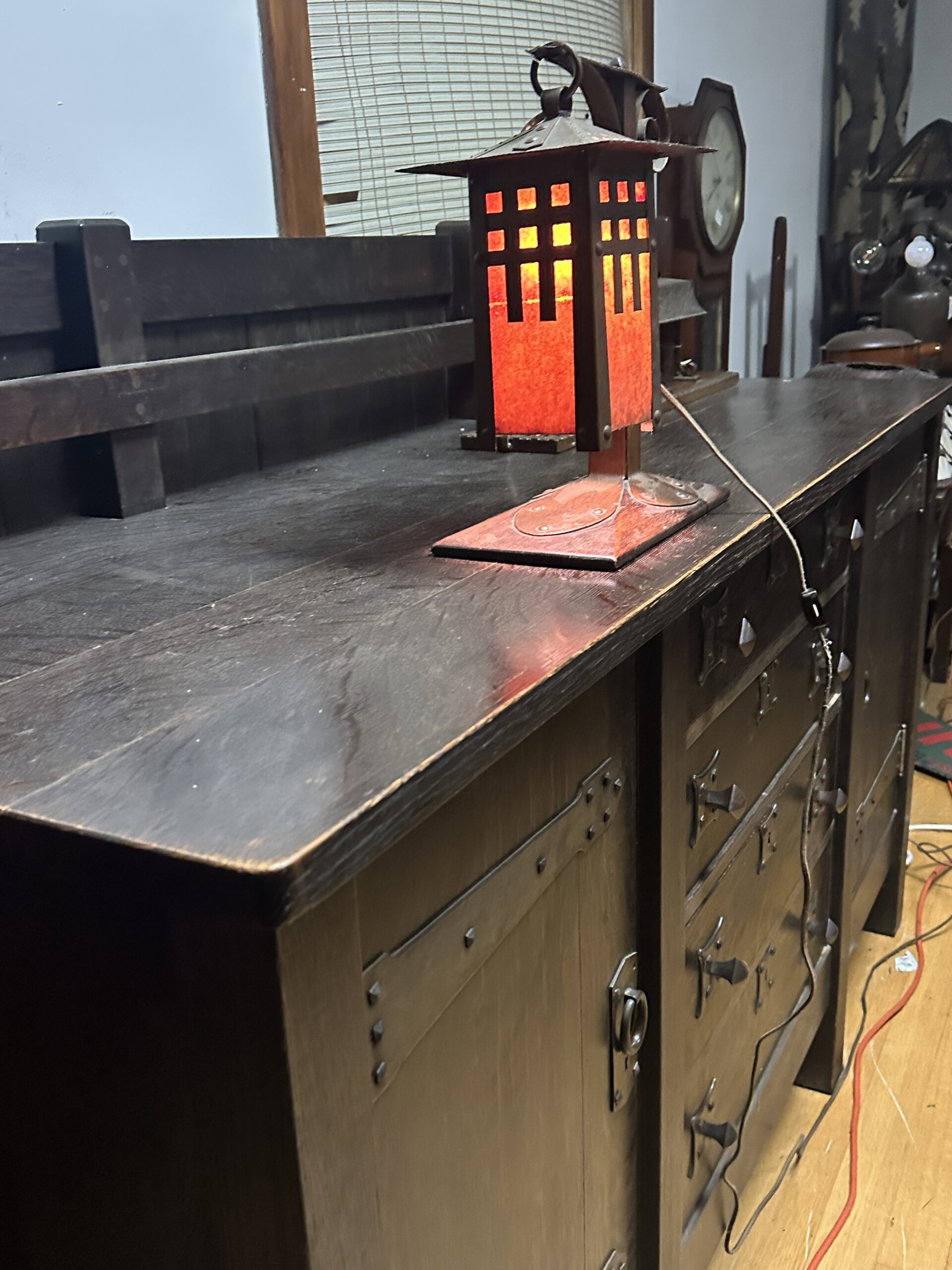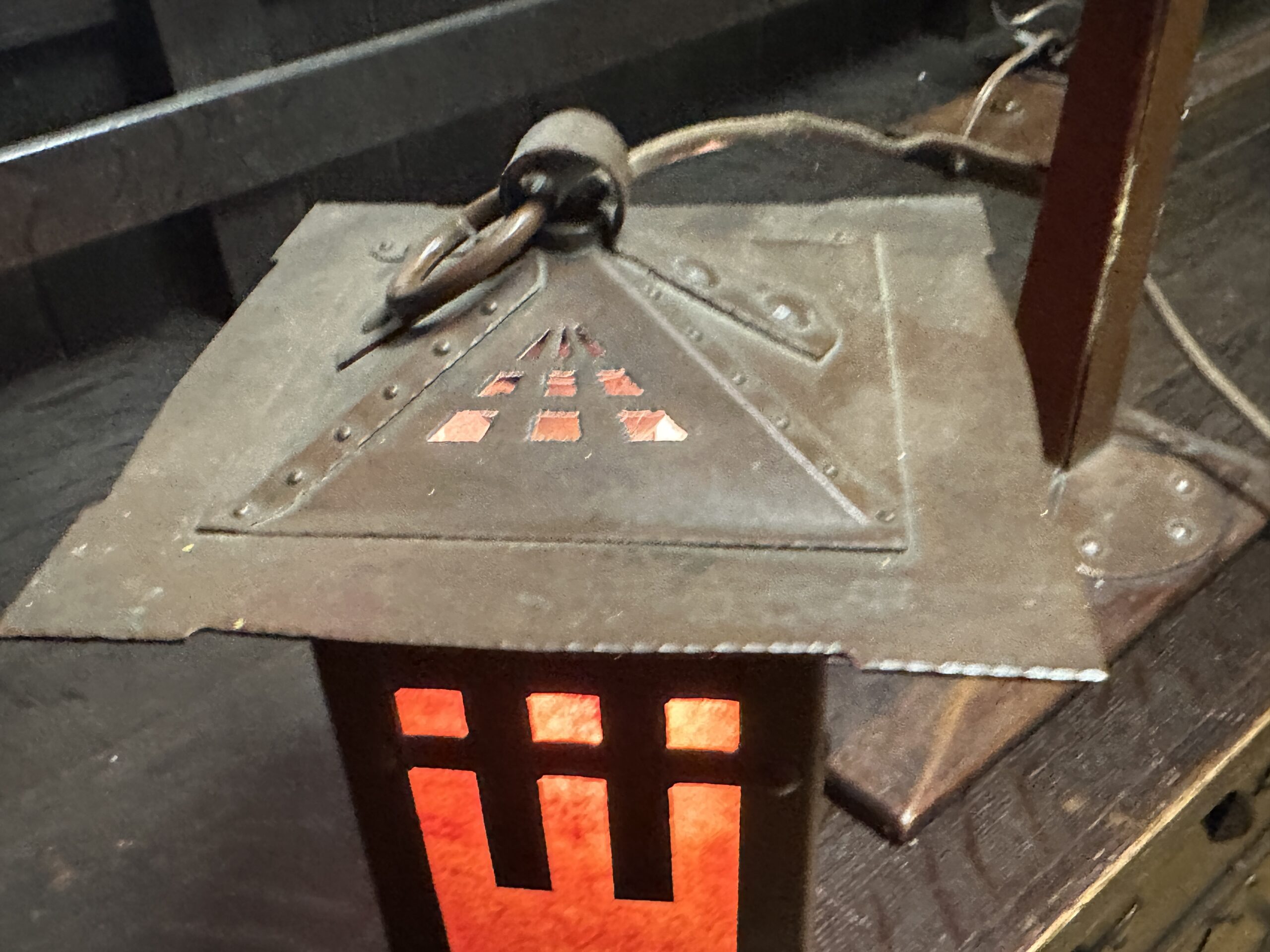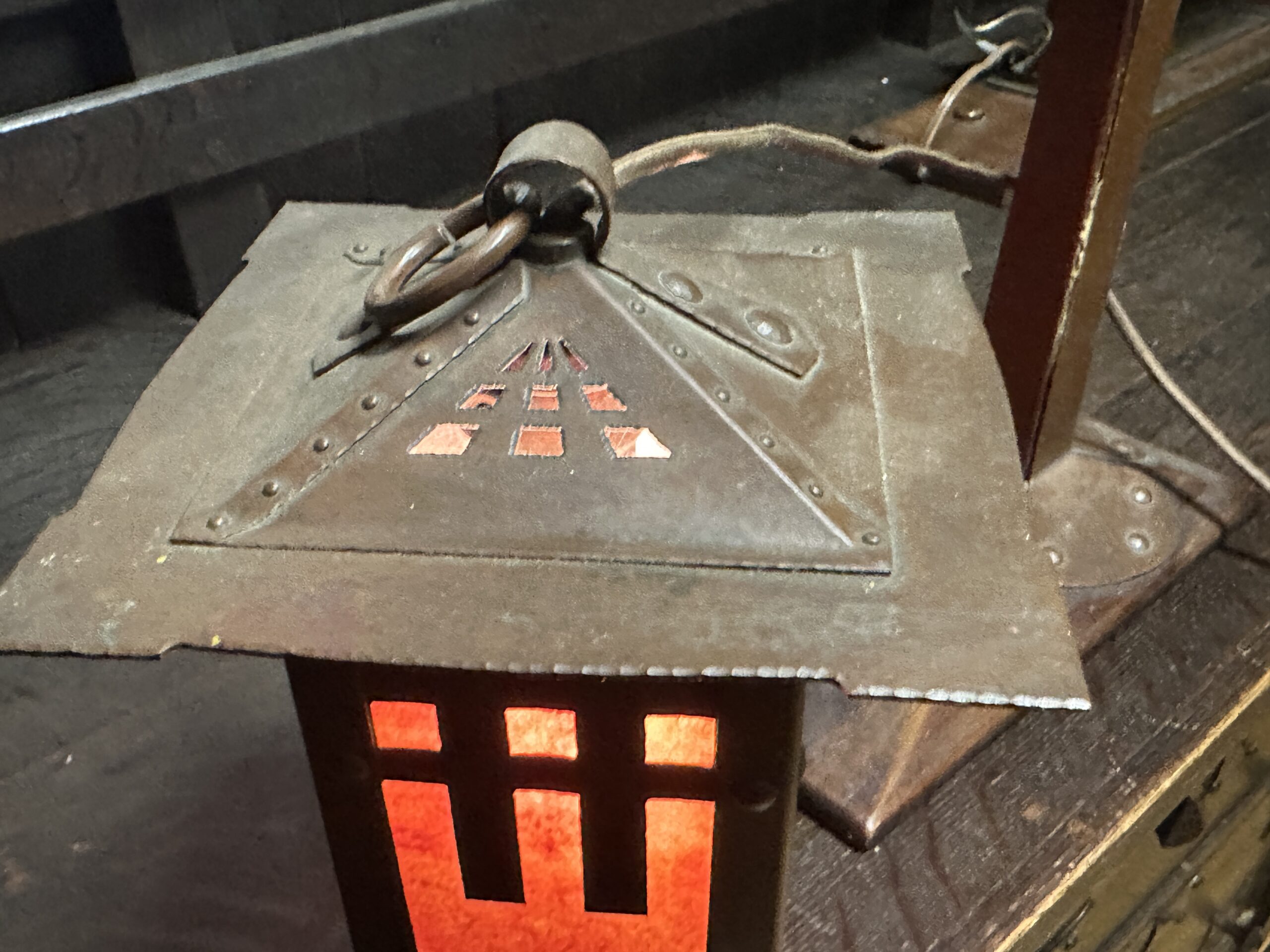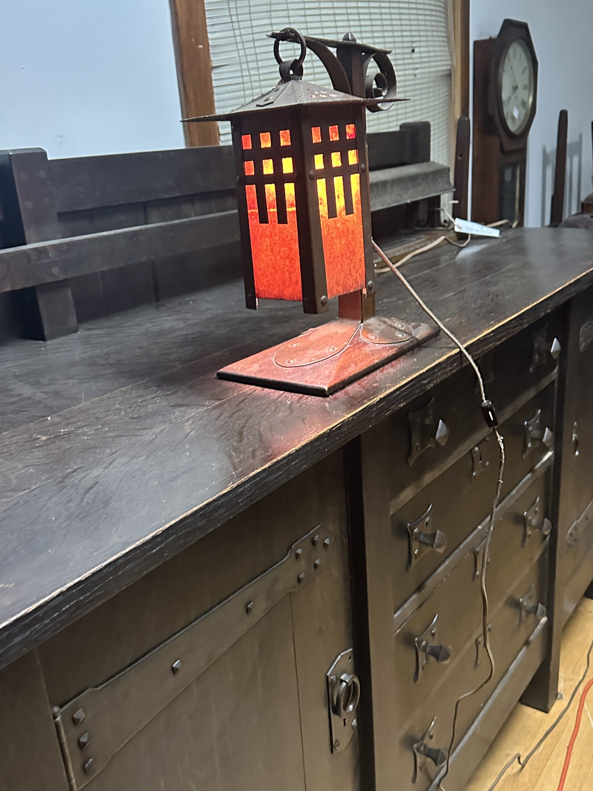 This is one of the nicest Benedict Studio Hand Hammered Lamps we’ve seen in the past 50 years. The hand-hammered base has great hammering and the mica shade has period glass, not modern, new glass. It is all original.
