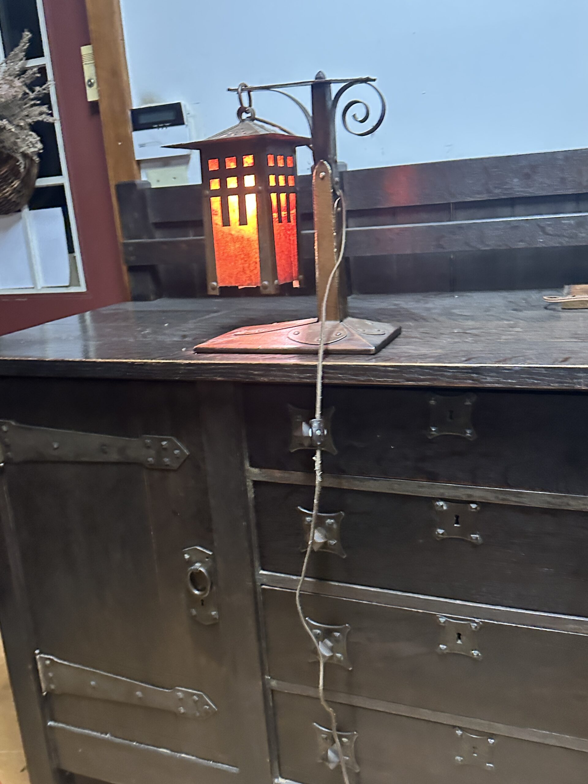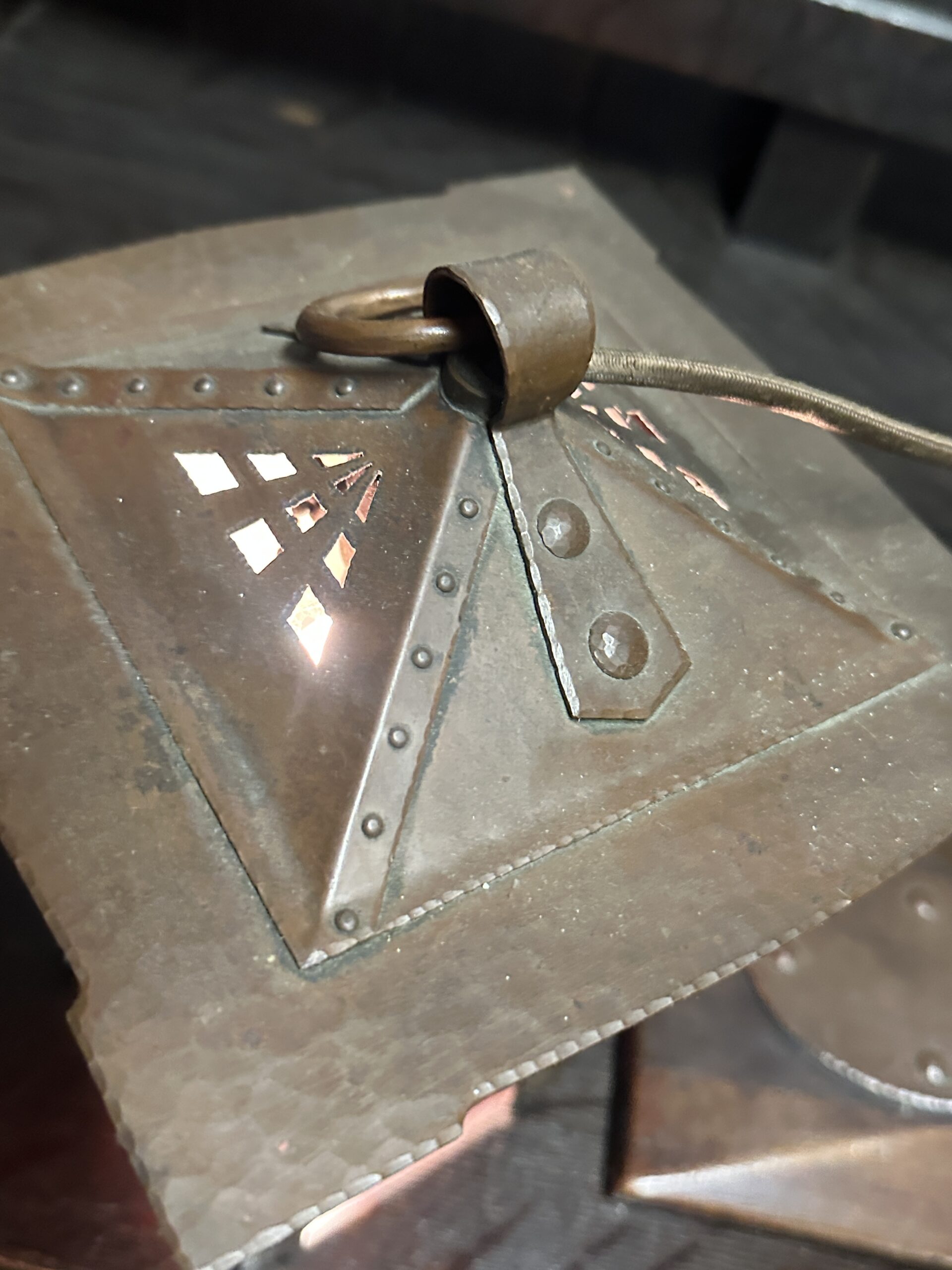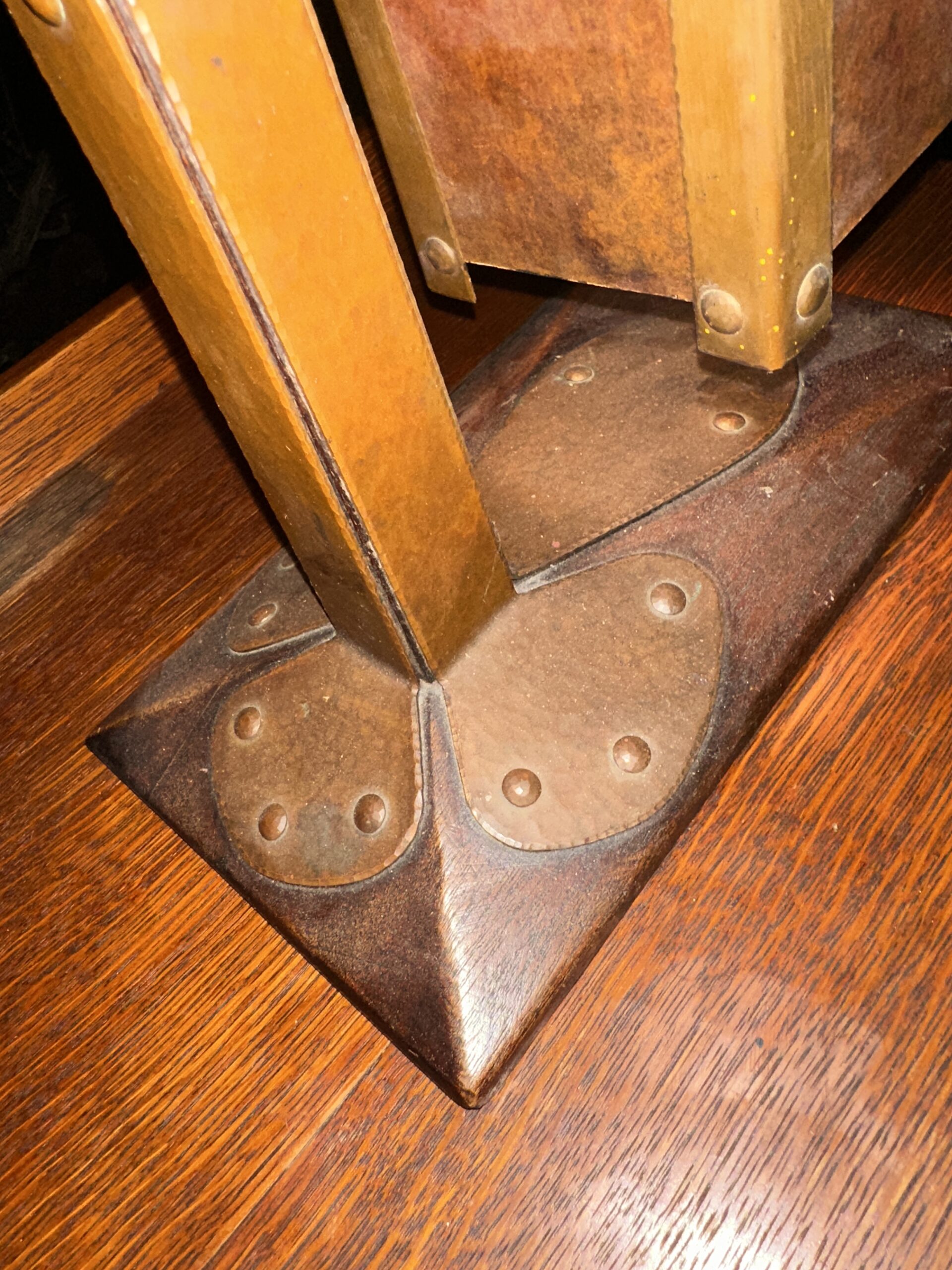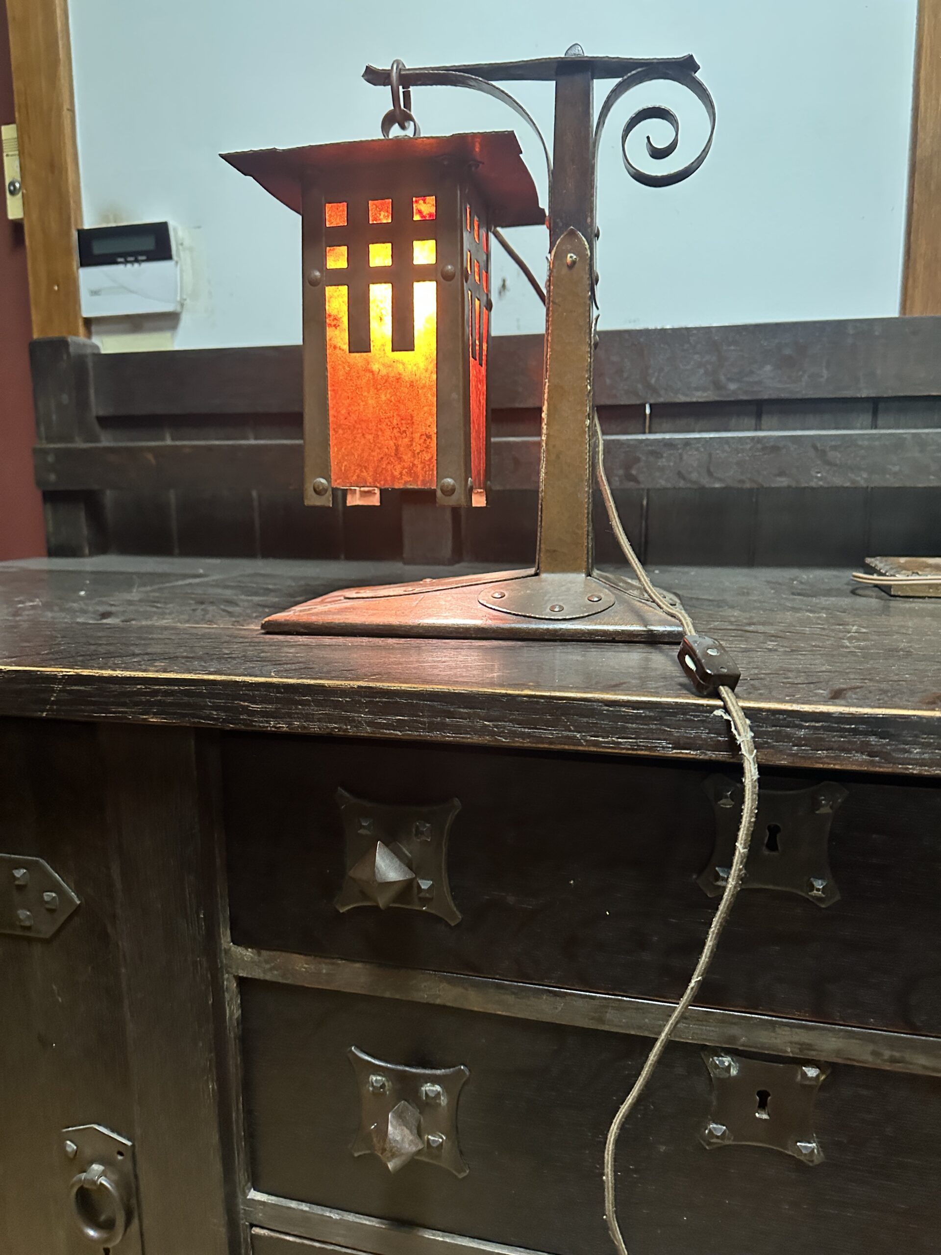 This is one of the nicest Benedict Studio Hand Hammered Lamps we’ve seen in the past 50 years. The hand-hammered base has great hammering and the mica shade has period glass, not modern, new glass. It is all original.