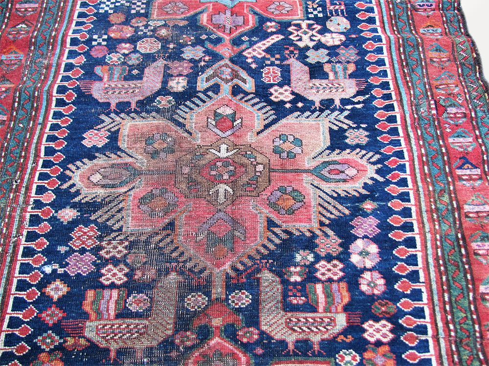 This is an antique caucasian Kazak rug from the 1930’s with wear. There is some loss on the two ends and the 2 sides are intact.