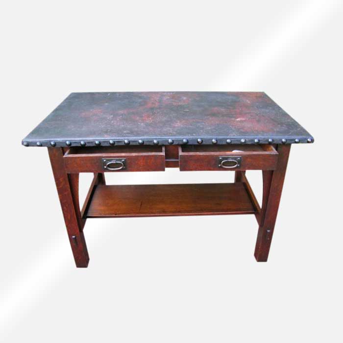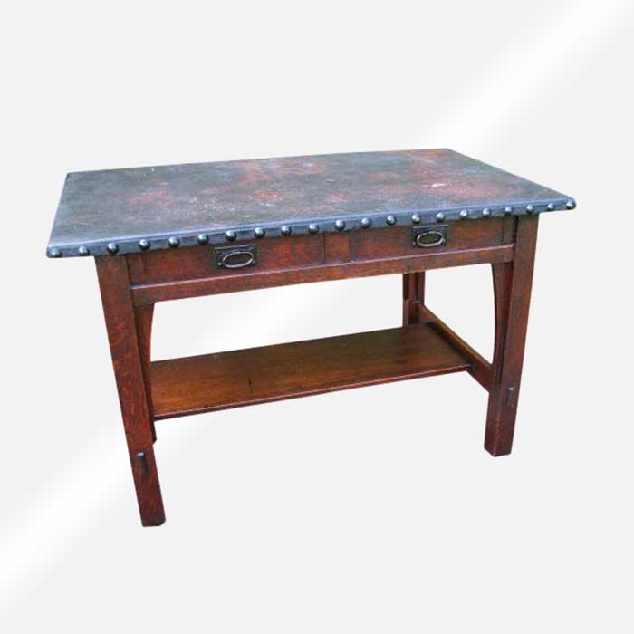 Early GOOD GUSTAV STICKLEY Lib table with original leather top and tacks. the table is with original pull with original patina normal use.
