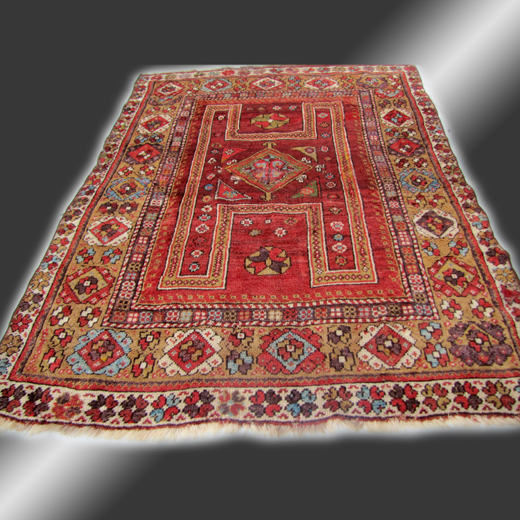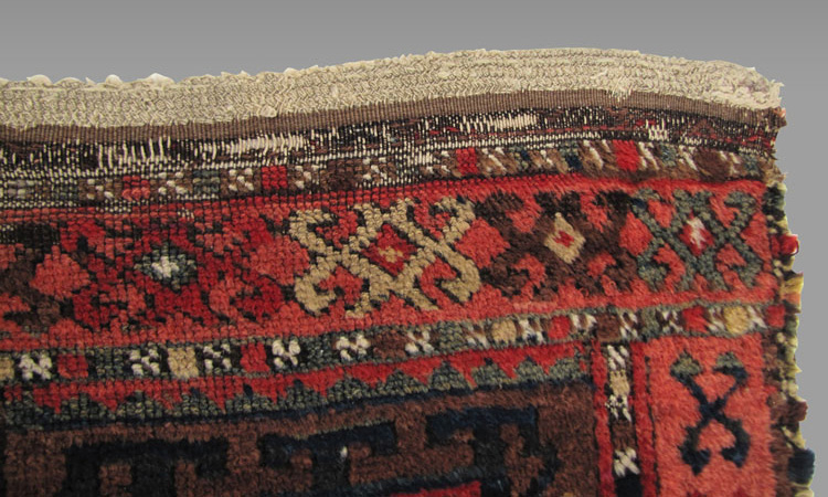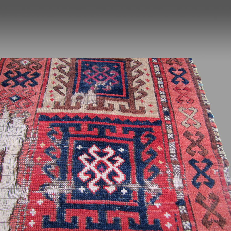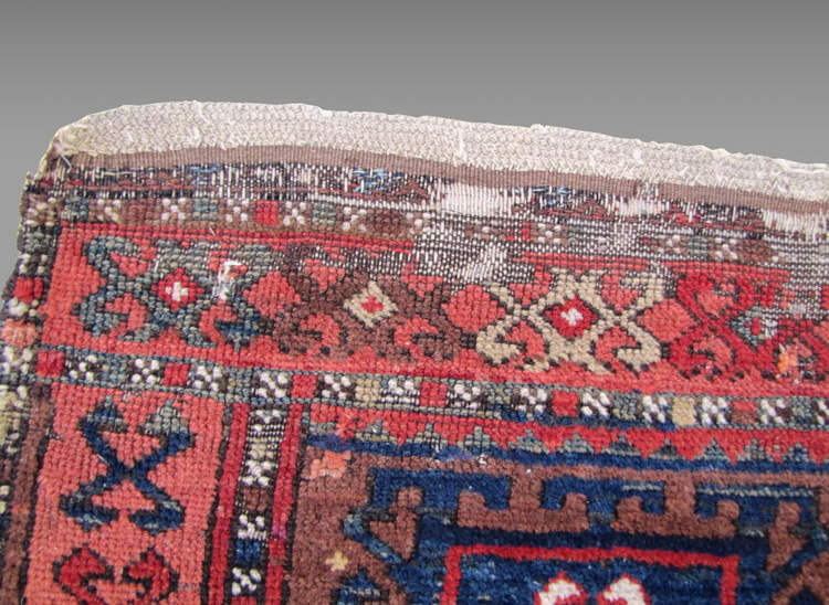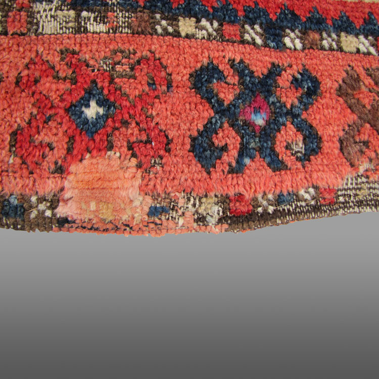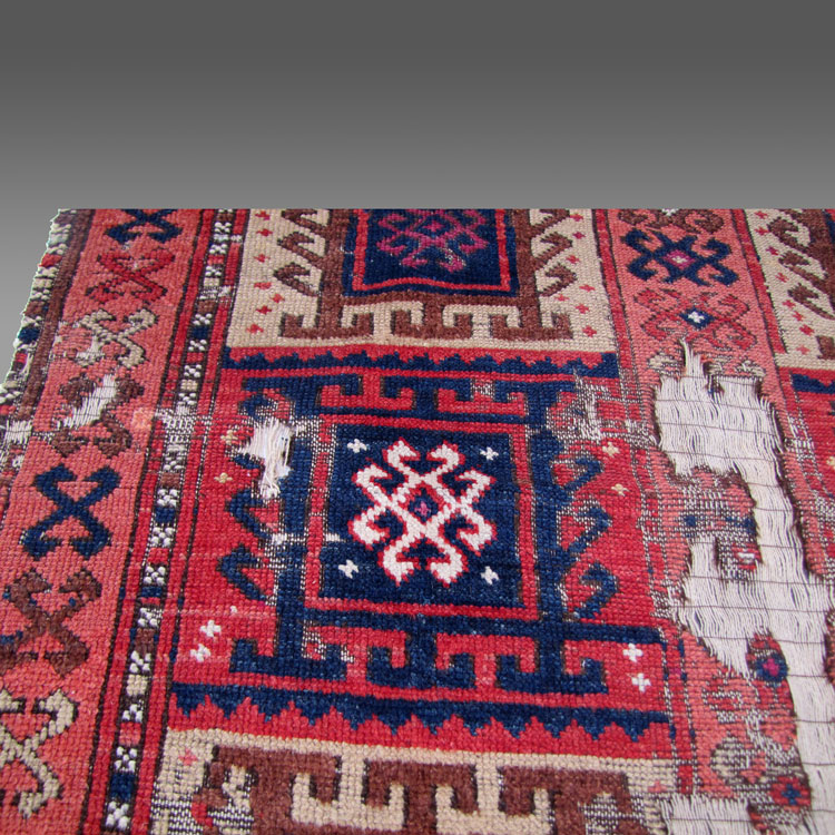 The rug is more or less complete, but has several area with missing wool. The cotton foundation is mostly intact makes restoration less costly.