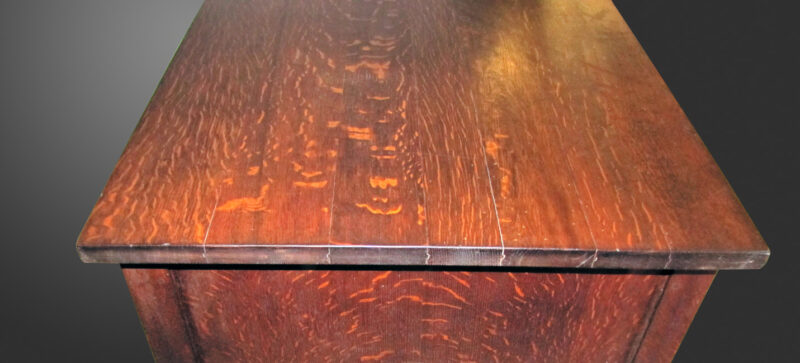 The piece is made of excellent quarter sawn oak with an old refinish with a good dark brown color.