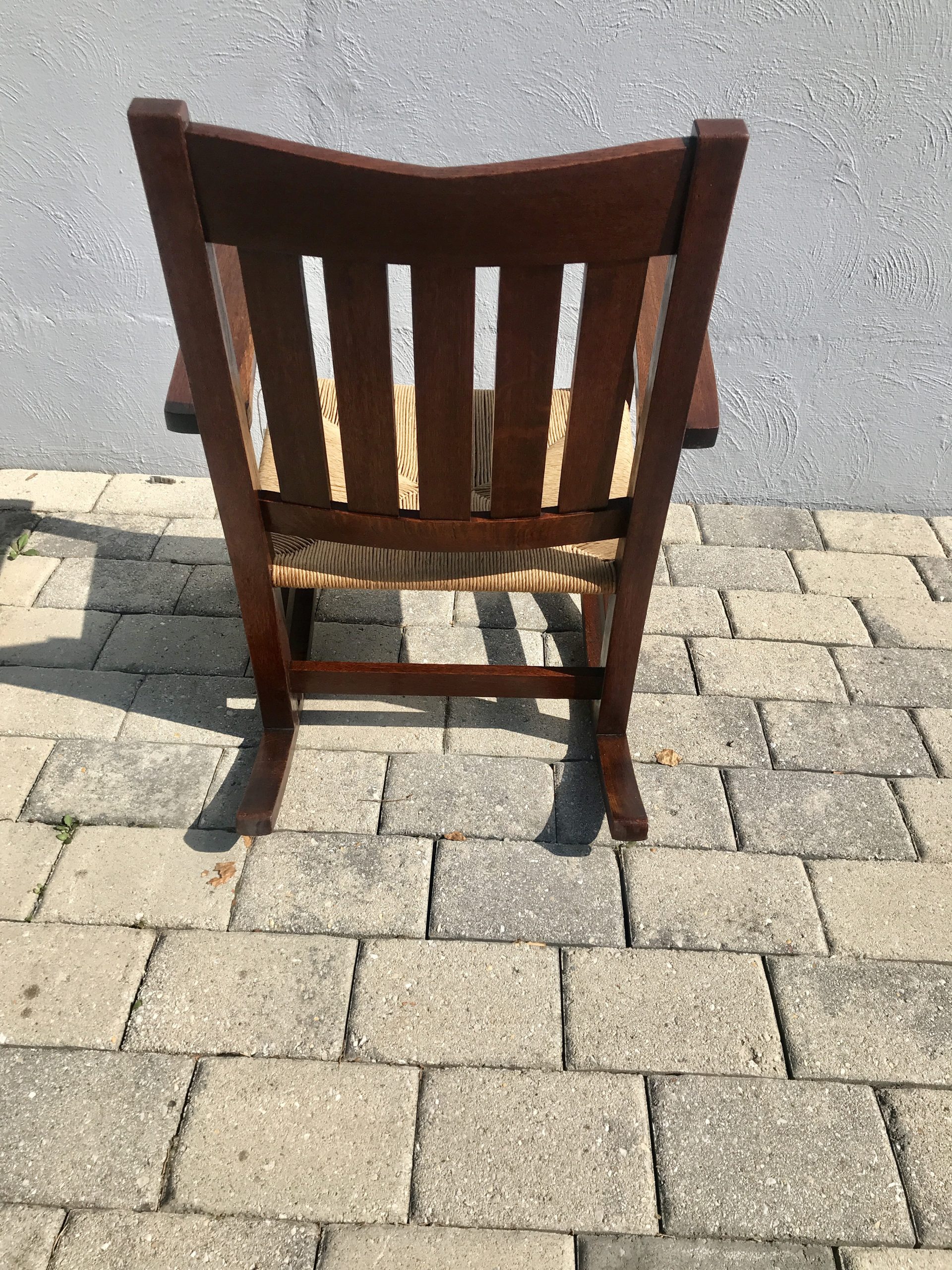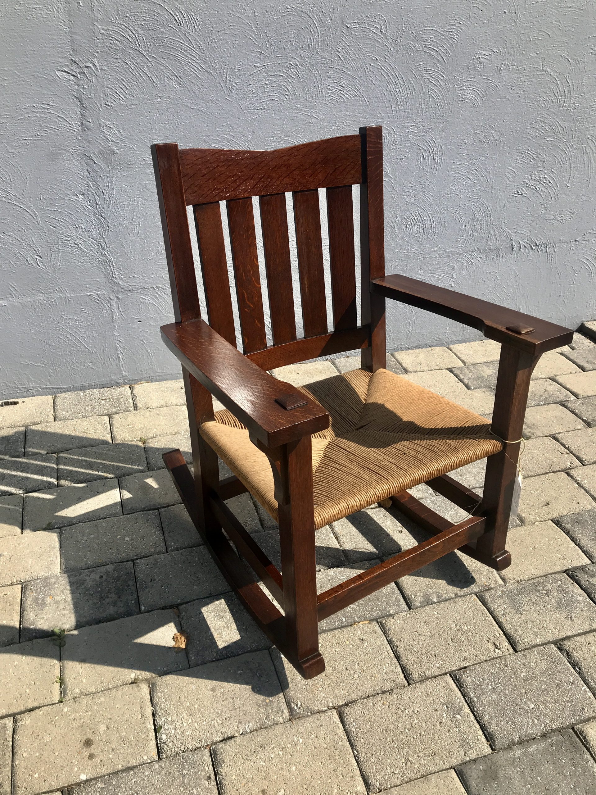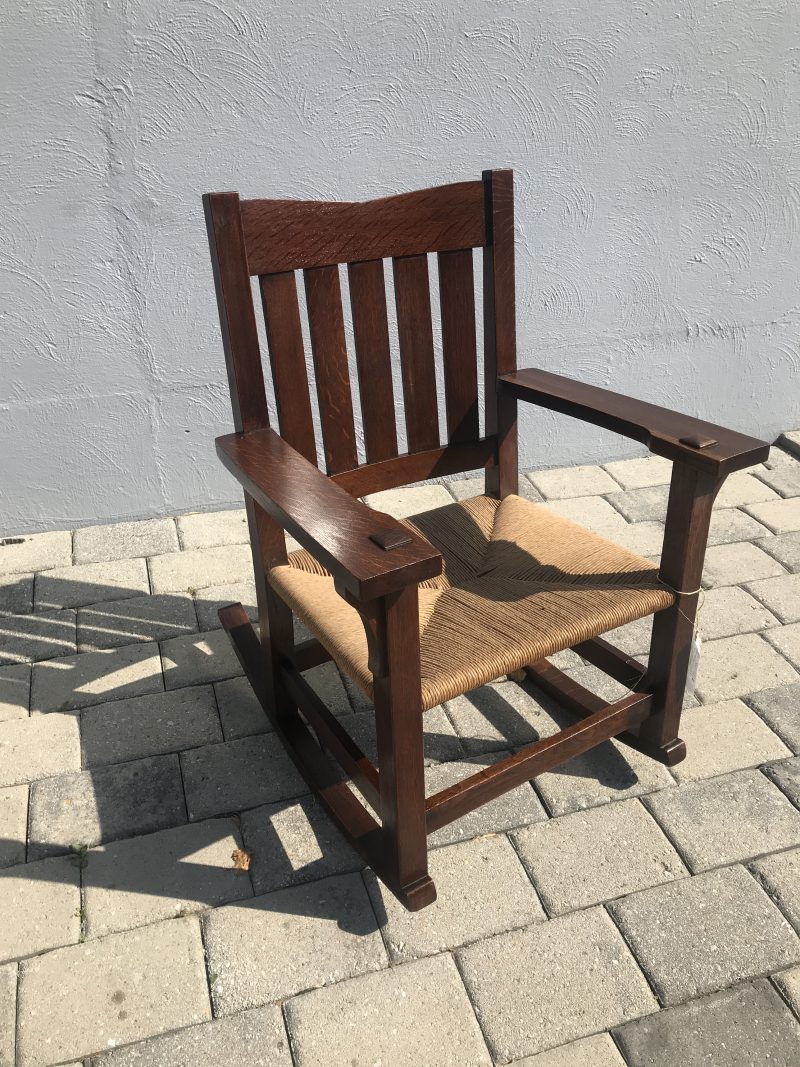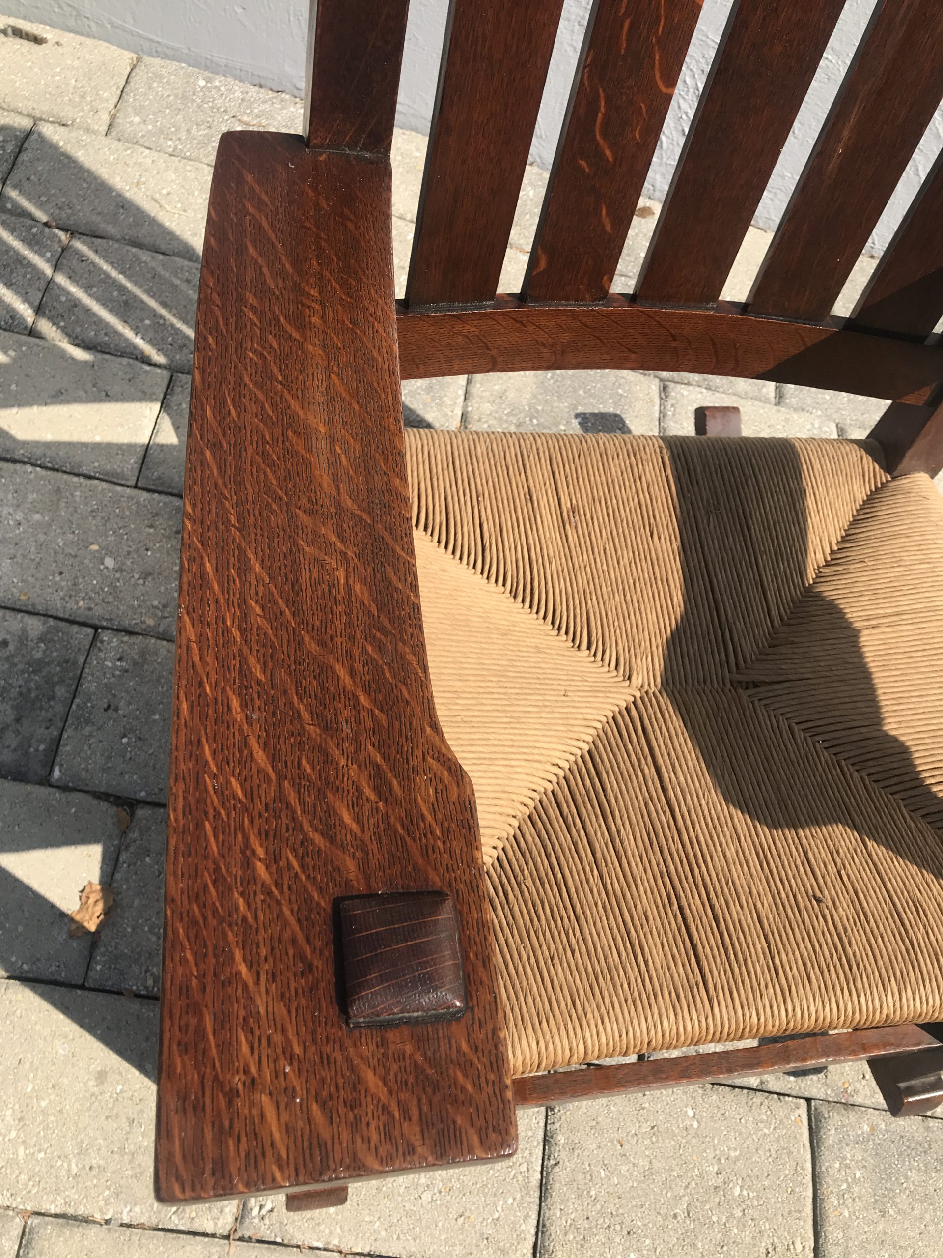 This is a great looking Gustav Stickley arm rocker from 1902/03 with the decal, in pristine condition. We sold and we are still selling many rocking chairs. This is the best we have ever had in this condition, with a caning seat. Over the years, we have sold hundreds of chairs and rocking chairs. None of them was of the quality of this chair. We purchased that chair in an estate sale where we also purchased an arm chair and chaise lounge. This is the best estate we have ever purchased from in all the years we have been in business. You just don’t find many of this quality. The chair is extremely heavy and well done. It is sturdy and strong and ready to use in your home. We will be listing the rest of our purchases from that estate.
