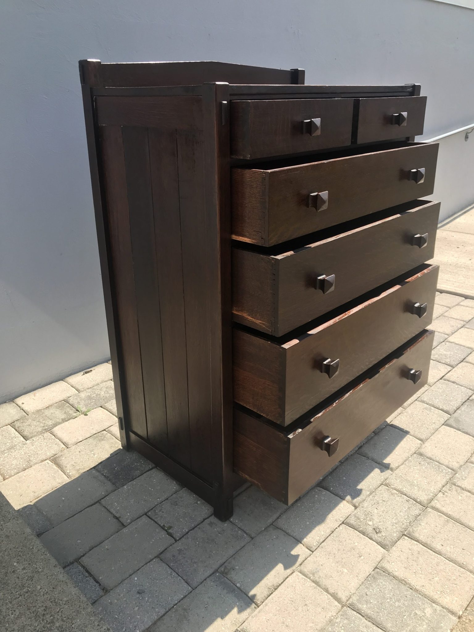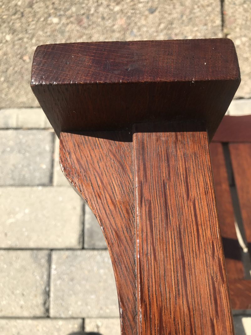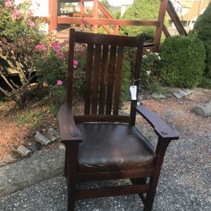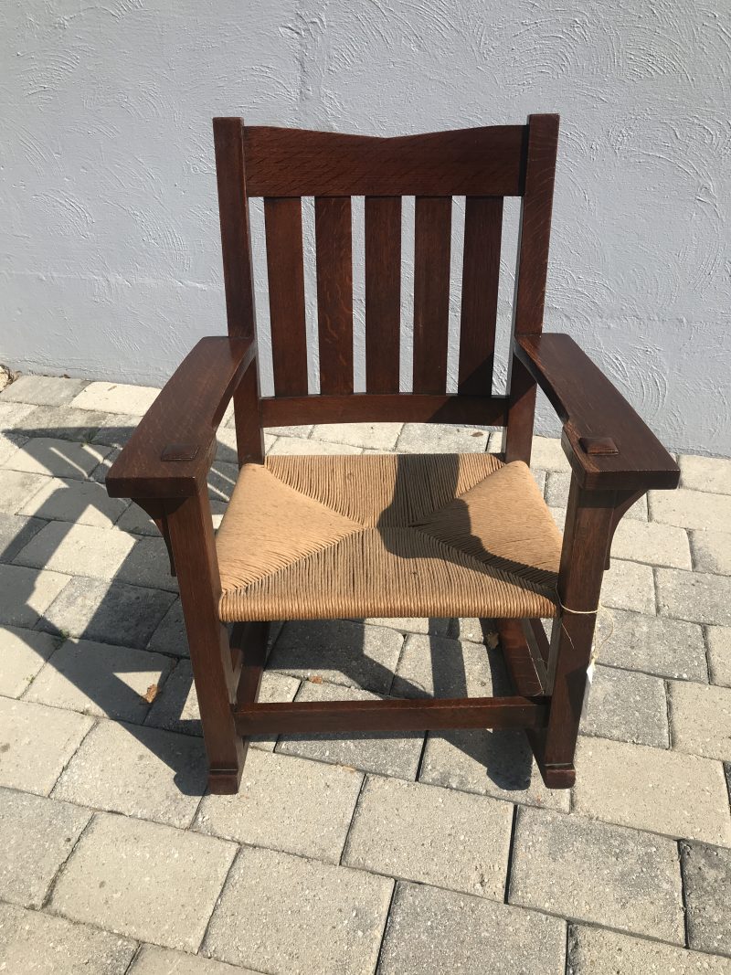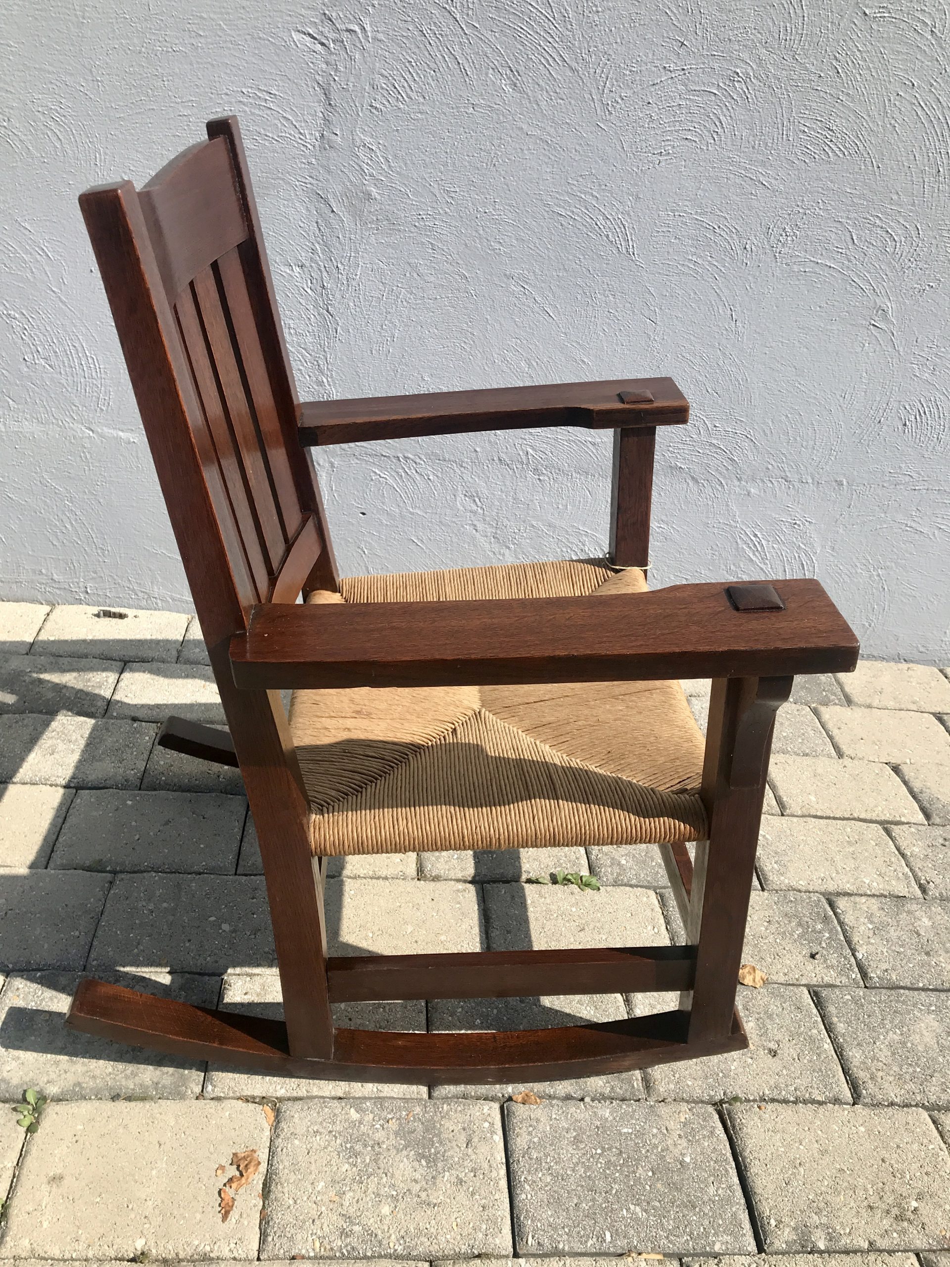 This is a great looking Gustav Stickley arm rocker from 1902/03 with the decal, in pristine condition. We sold and we are still selling many rocking chairs. This is the best we have ever had in this condition, with a caning seat. Over the years, we have sold hundreds of chairs and rocking chairs. None of them was of the quality of this chair. We purchased that chair in an estate sale where we also purchased an arm chair and chaise lounge. This is the best estate we have ever purchased from in all the years we have been in business. You just don’t find many of this quality. The chair is extremely heavy and well done. It is sturdy and strong and ready to use in your home. We will be listing the rest of our purchases from that estate.