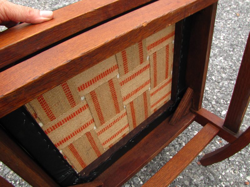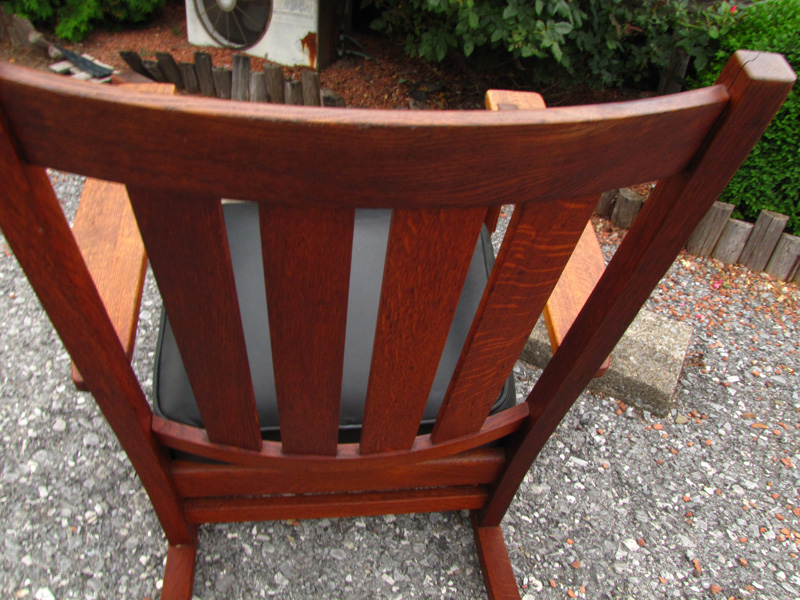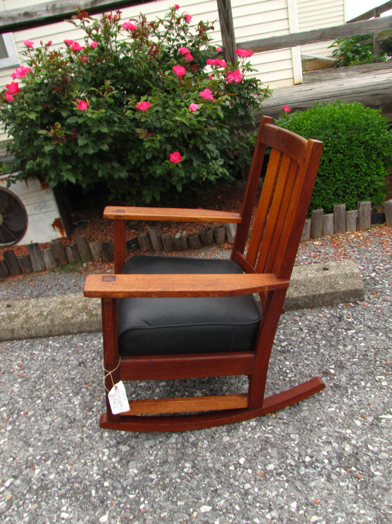 This is a L&jG Stickley arm rocker mission arts&crafts period from the early 1900s in good condition. The chair is with no nicks or gouges or breaks or replace parts, pinned. Recovered seat with top quality black leather with 100% cotton fill with hair.