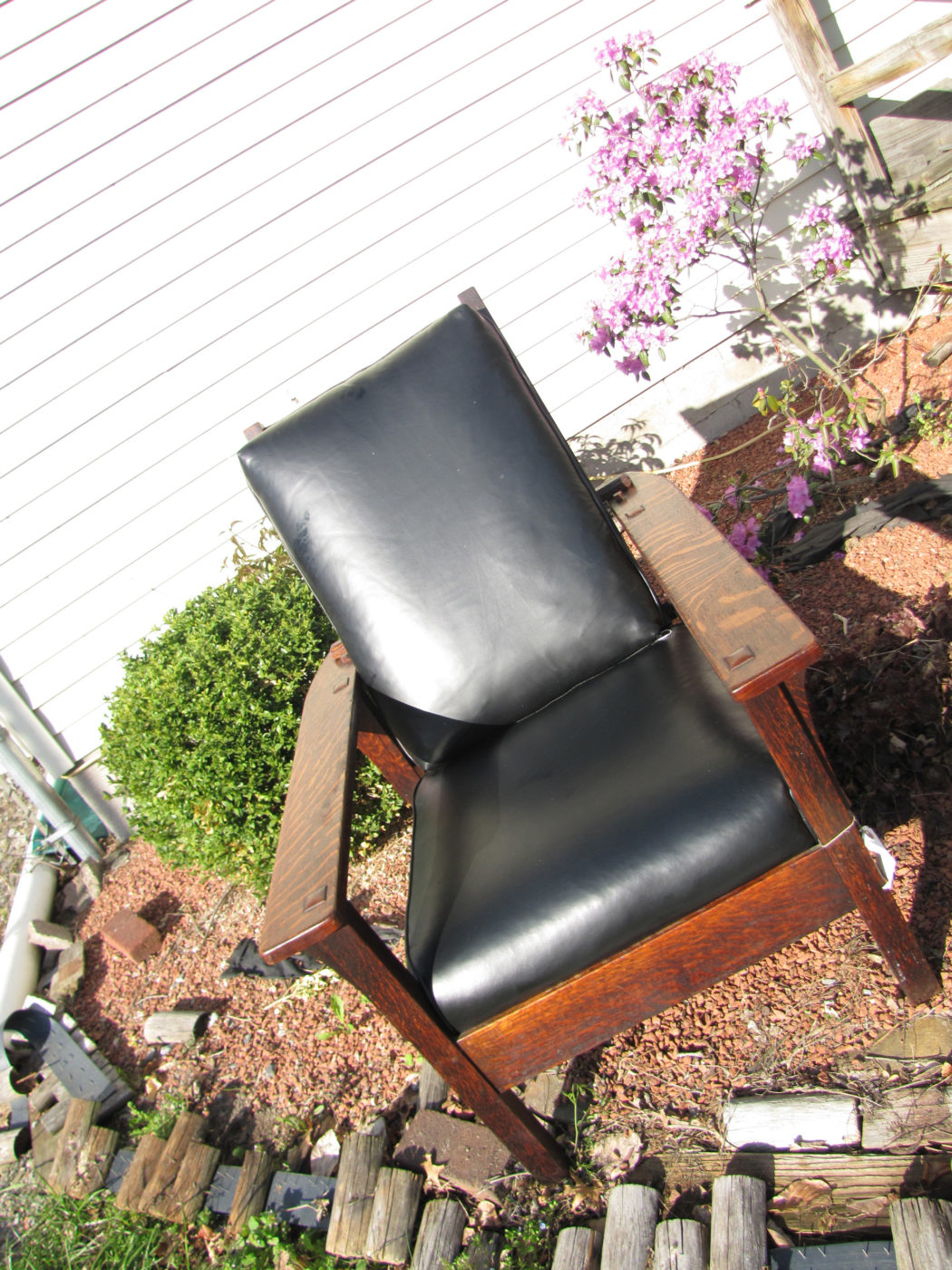 Back is ORIGINAL to the chair and do the BACK BAR. Please note: We see many Stickley Morris chairs in LIVE well know auctions with replace back of chair and back bar with no word in auction catalog?.