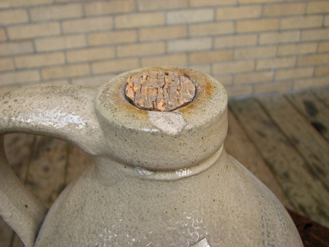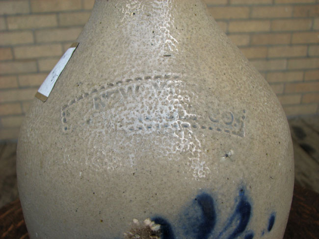 This is a very decorative antique primitive Folk Art jug marked with a maker name in New York in good condition with a spot of wear on the face.