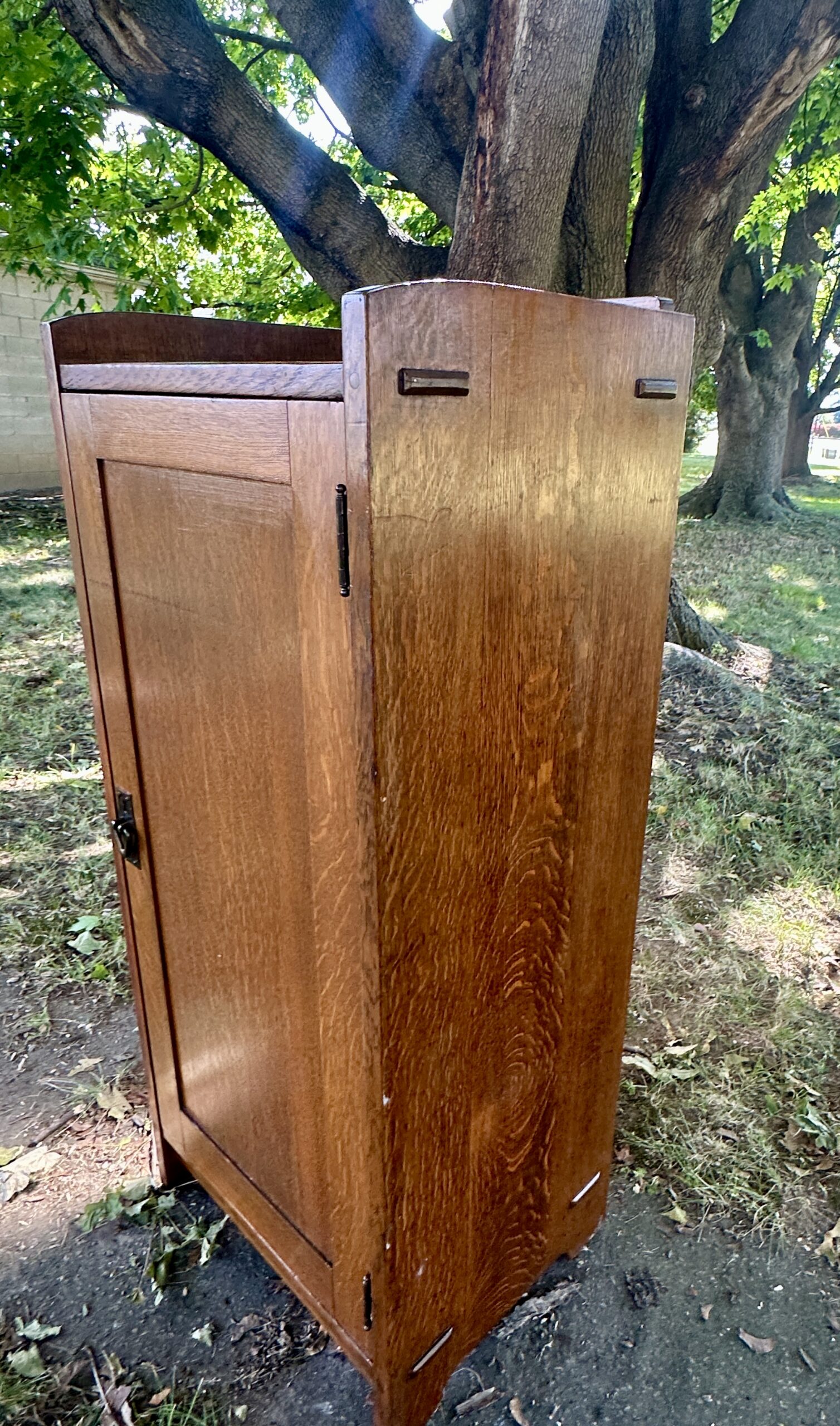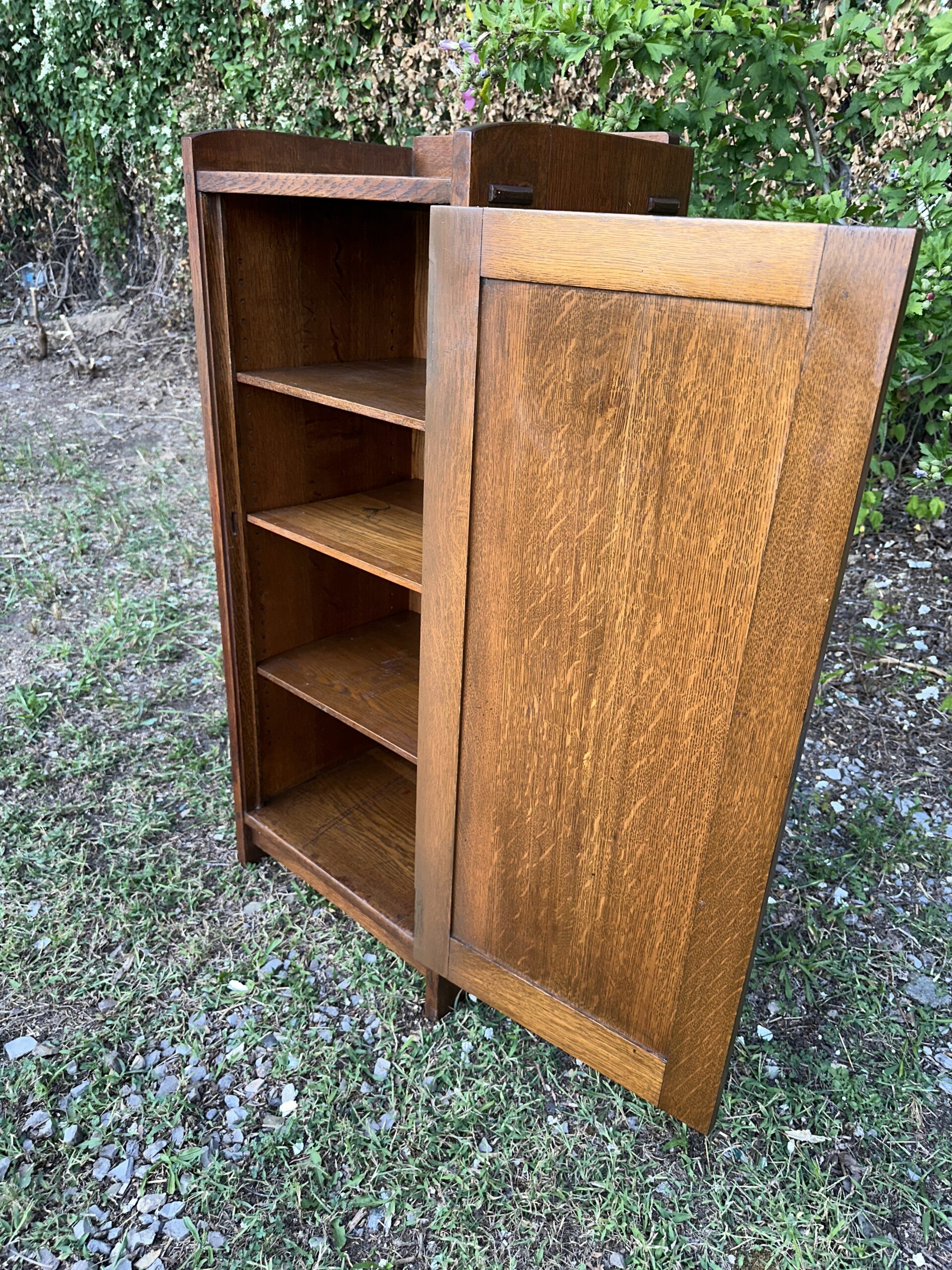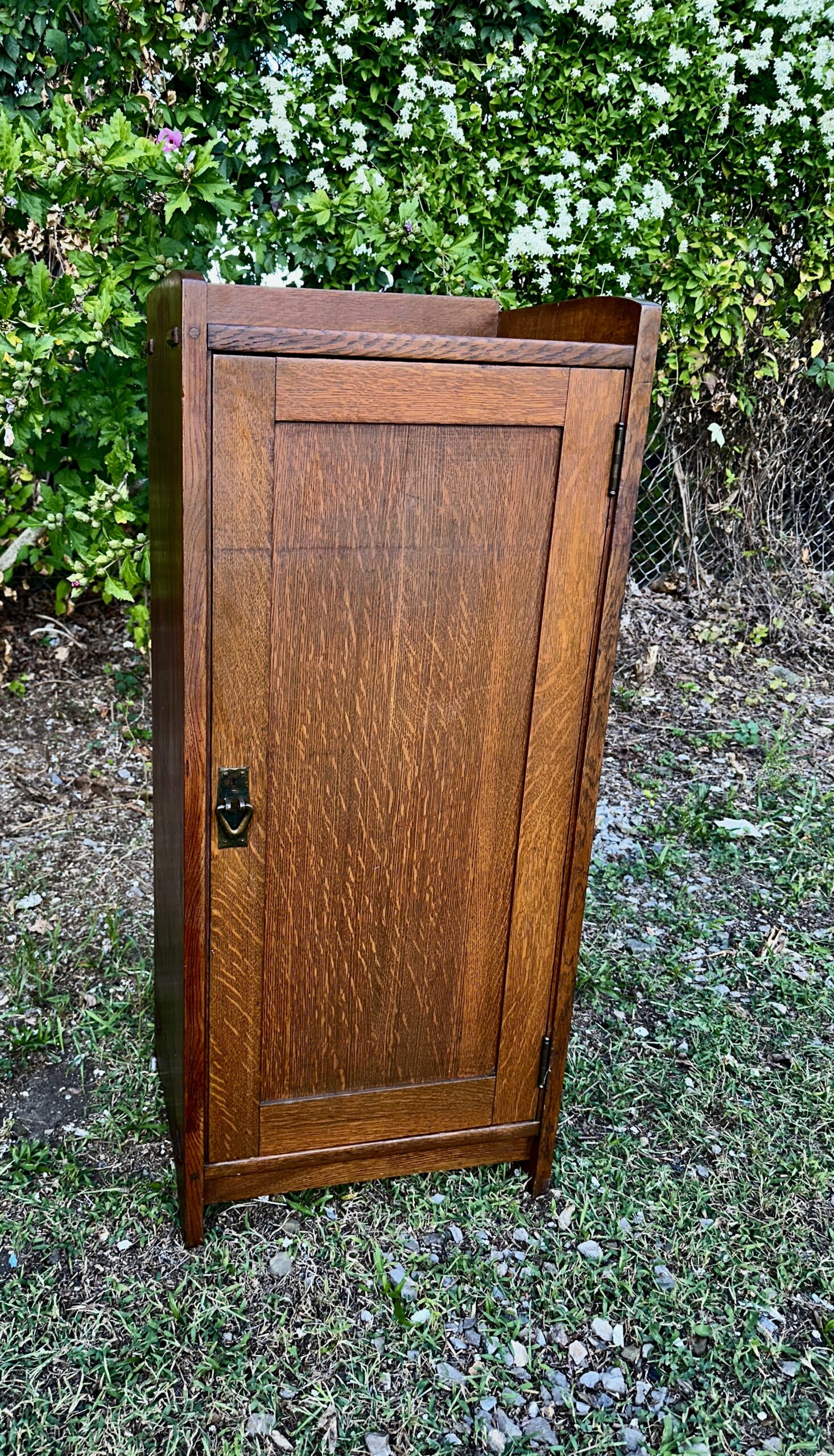 This is a great One-Door Cabinet by Gustav Stickley in 1914-1916 in very good condition. This cabinet has through Tenon construction on both sides (double through tenon). Great selection of oak. The original pull has the original patina. There are three shelves and a great selection of quarter-sawn oak. It looks like the cabinet arrived with an older refinishing job.