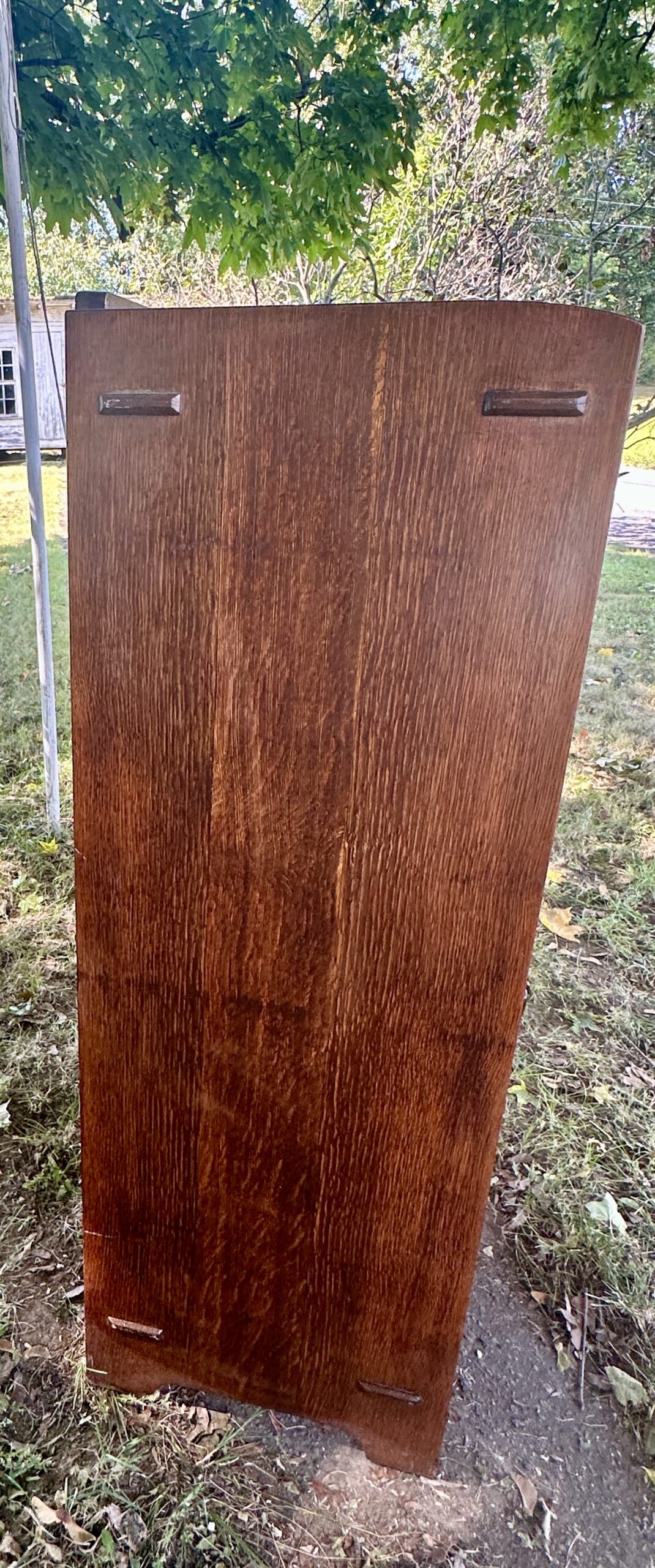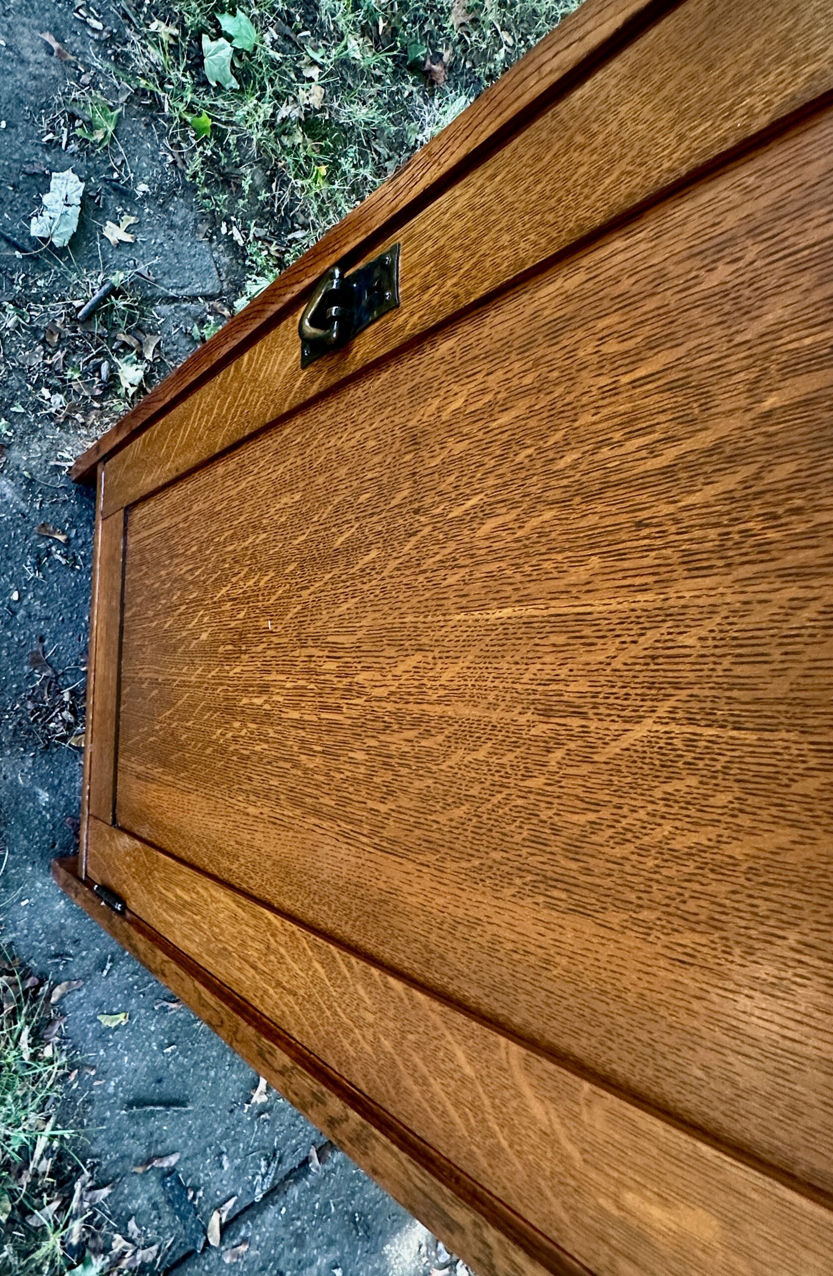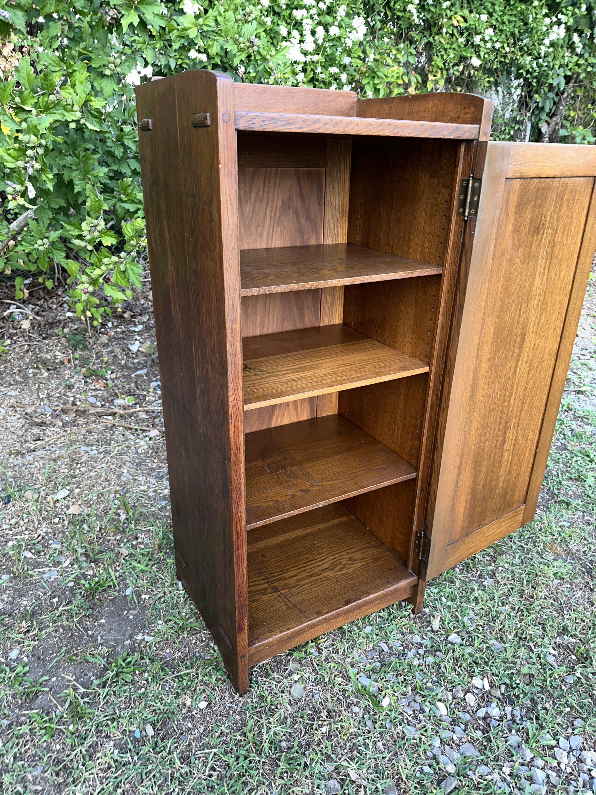 This is a great One-Door Cabinet by Gustav Stickley in 1914-1916 in very good condition. This cabinet has through Tenon construction on both sides (double through tenon). Great selection of oak. The original pull has the original patina. There are three shelves and a great selection of quarter-sawn oak. It looks like the cabinet arrived with an older refinishing job.