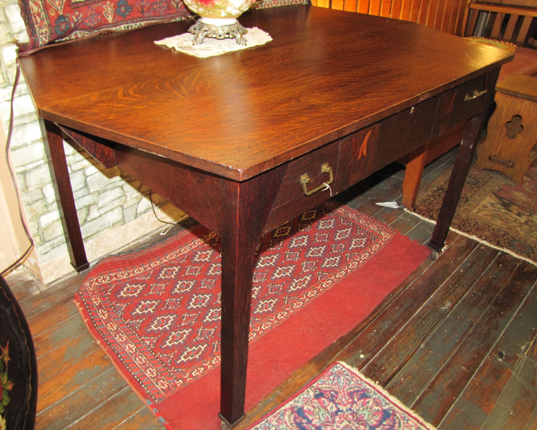 This is a nice looking Stickley Brothers table from the early 1900’s in very good condition. ?The inlay on the front is in excellent condition with no repairs or damage. ?The top is 6 sided and has a light overcoat and original finish. ?The table is on casters and the hardware is all original. This is sturdy and strong and ready to use in your home.