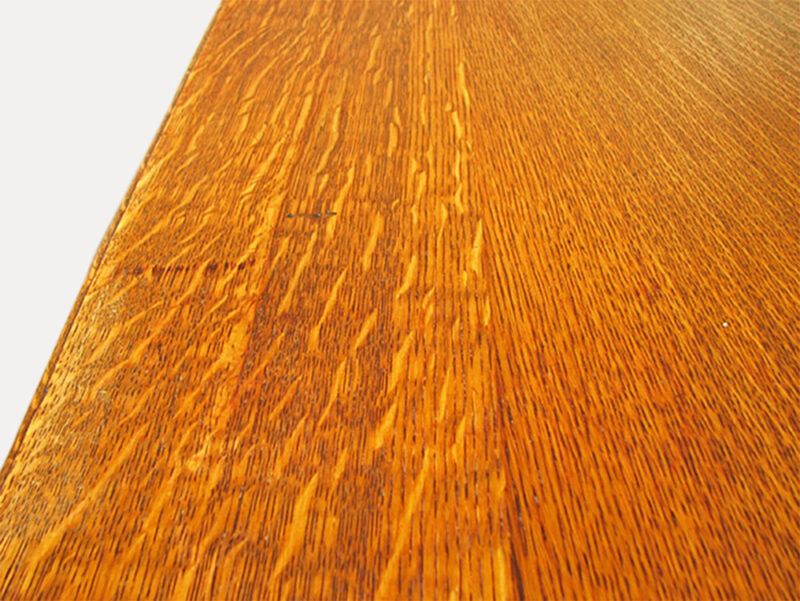 The piece is made of good quarter sawn oak with an old refinish.