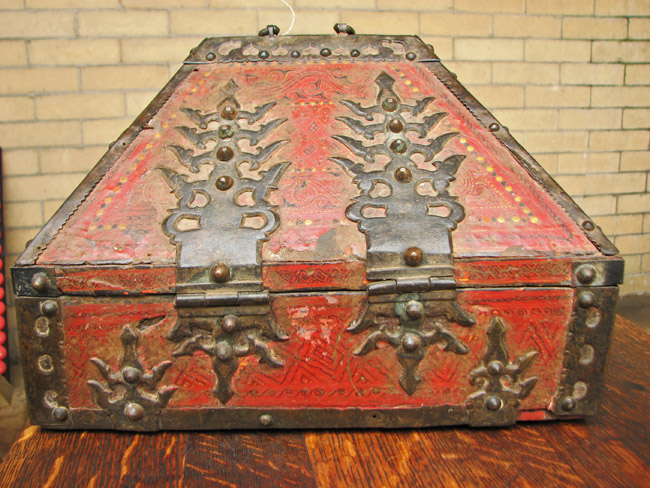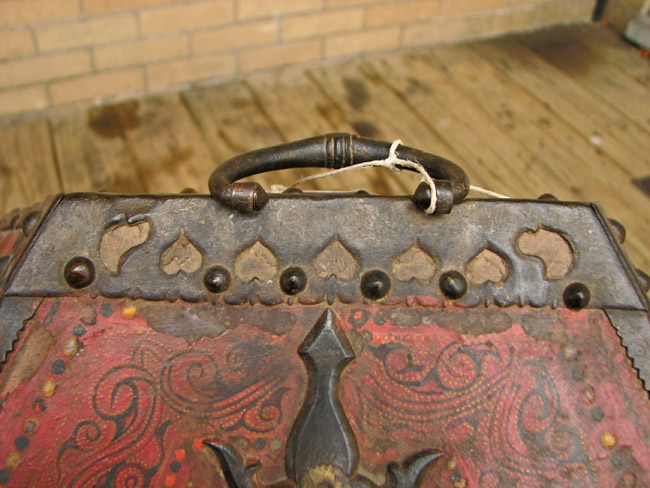 The piece is made of wooden panels with superb metal (probably brass) hardware all over.