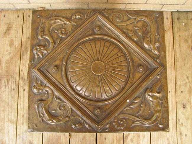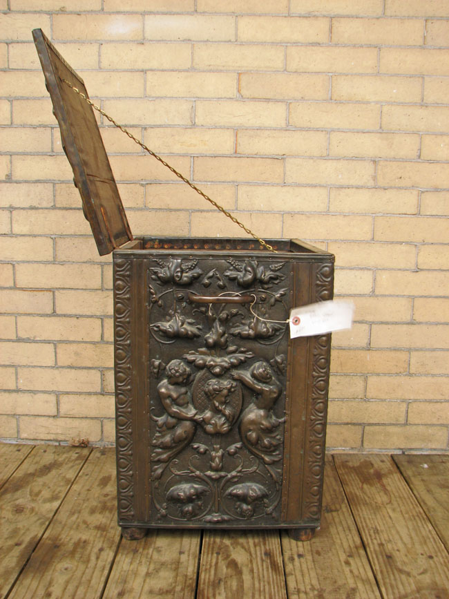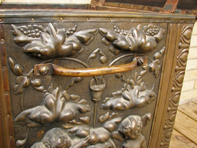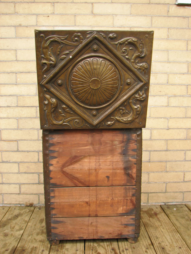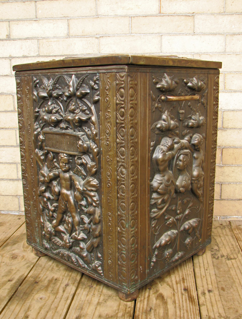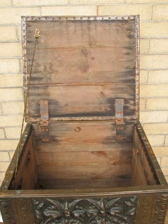 The piece has a great embossed brass exterior over a wooden structure.