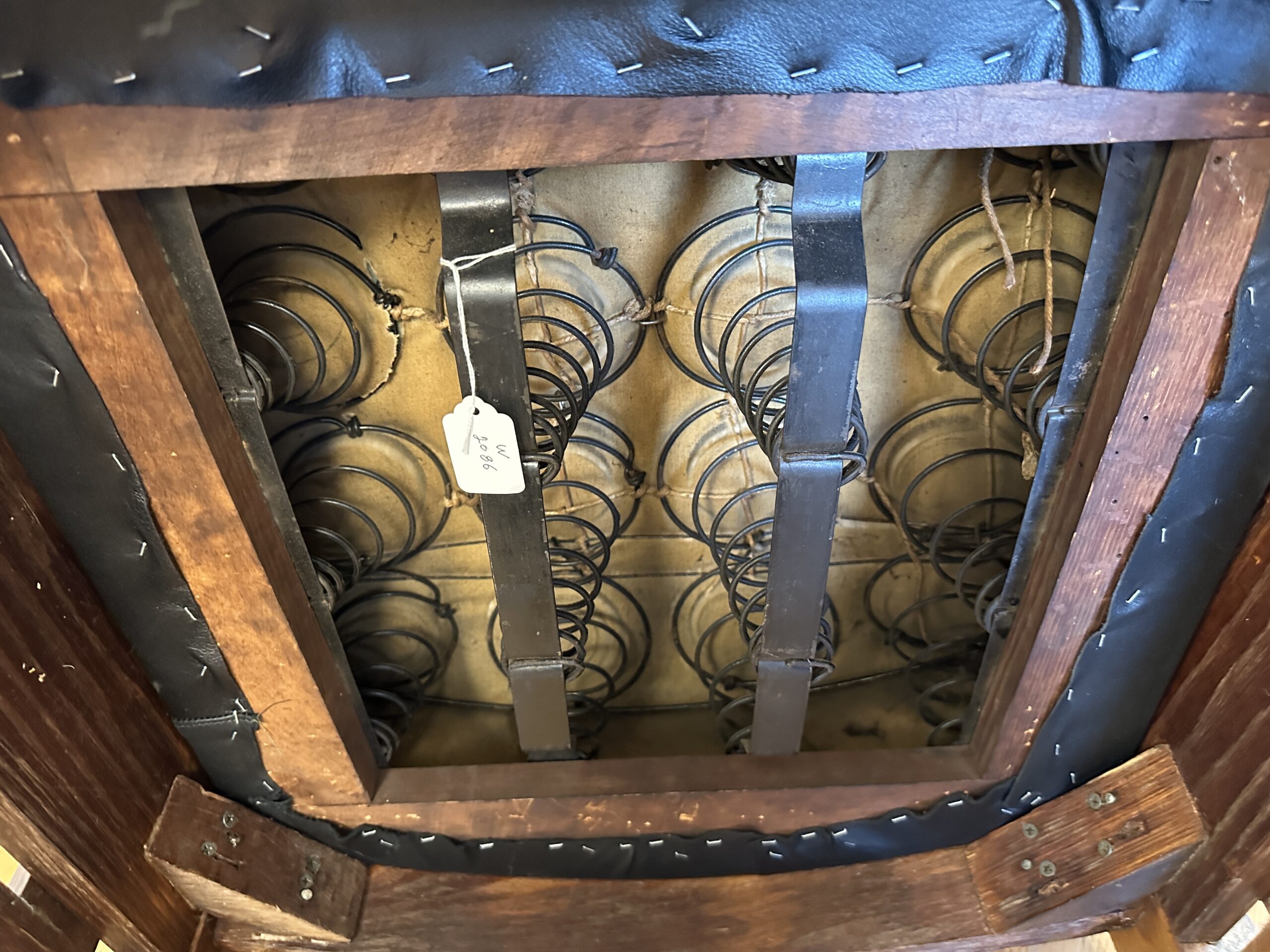 This chair has the original spring seat covered in top quality black leather with cotton and hair filling (no sponge)