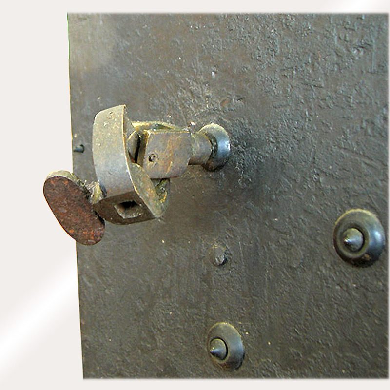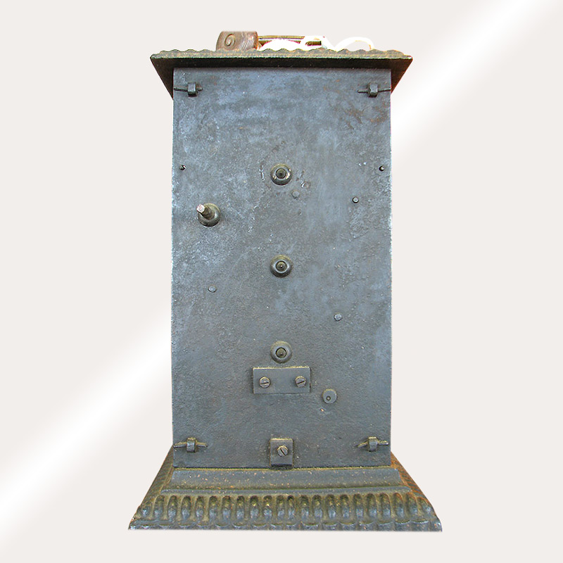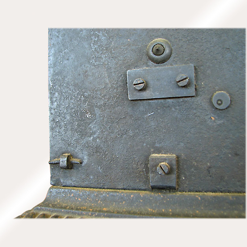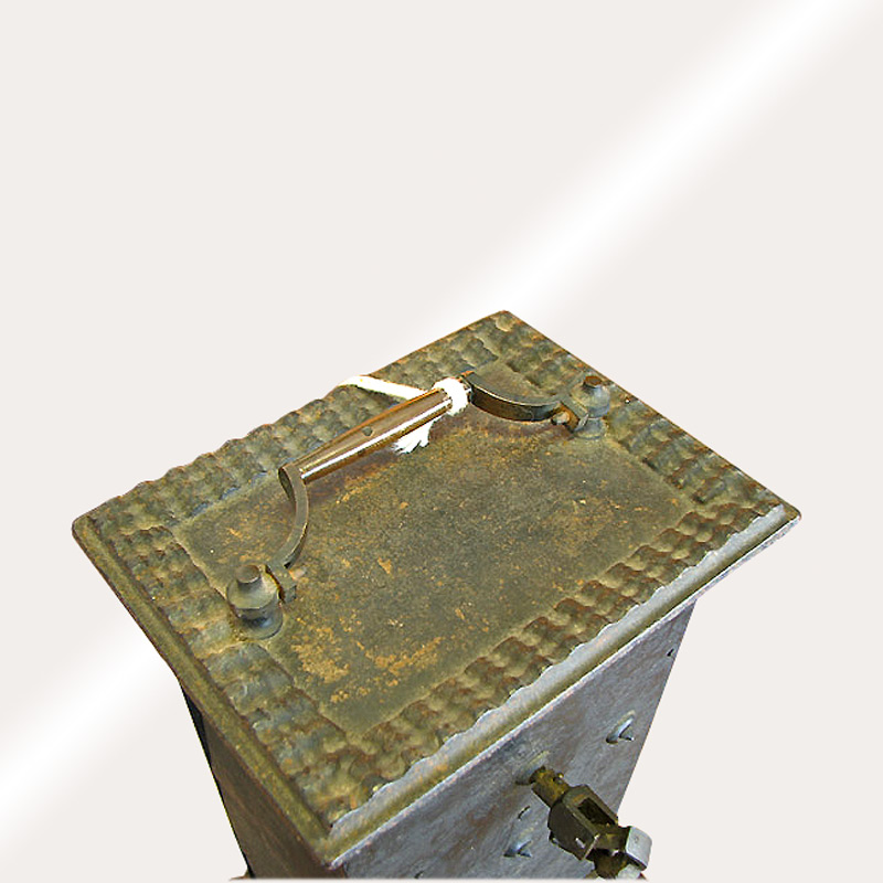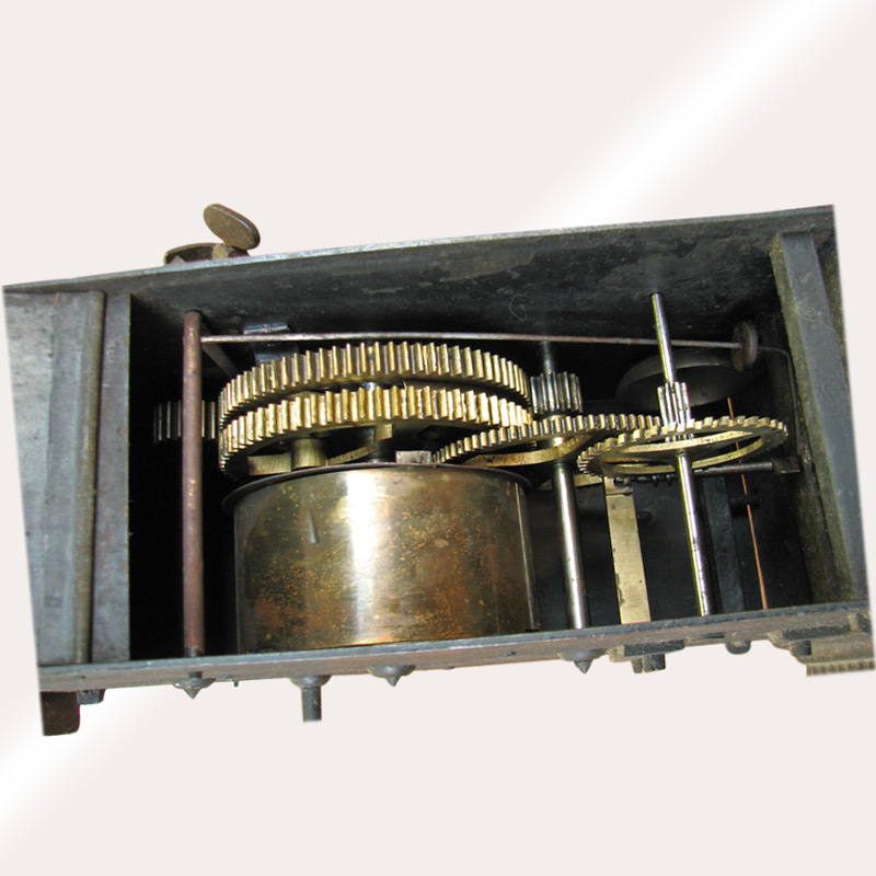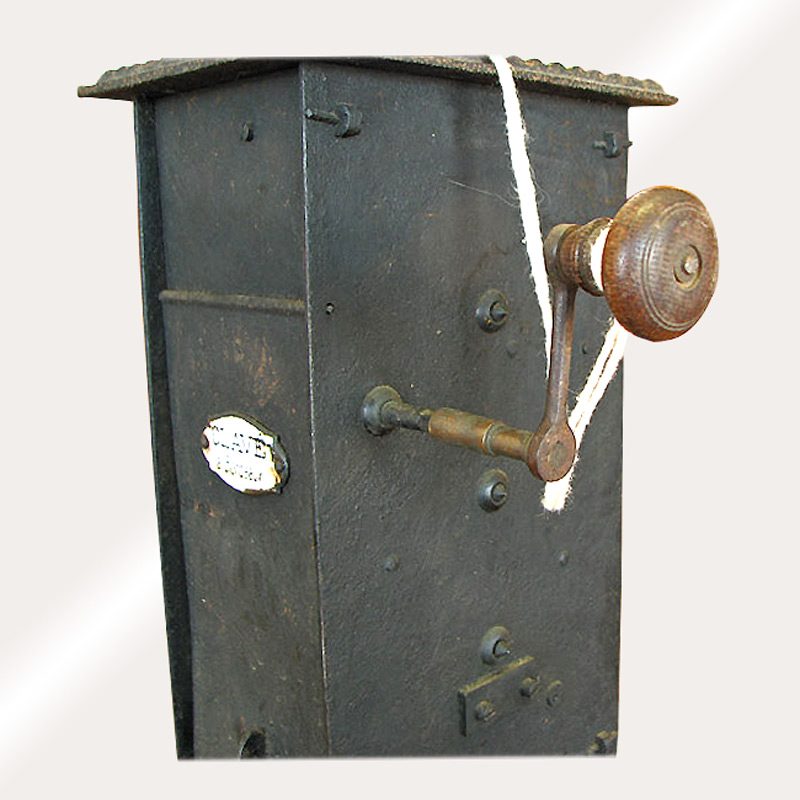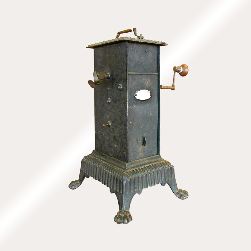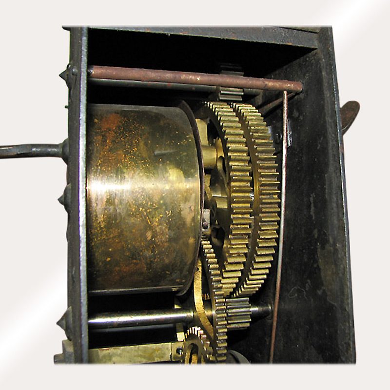 It is meant to attach to a spit over a hearth fire and is cranked to time the cooking of food.