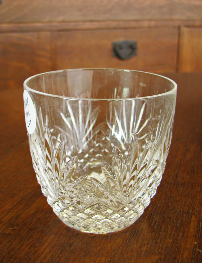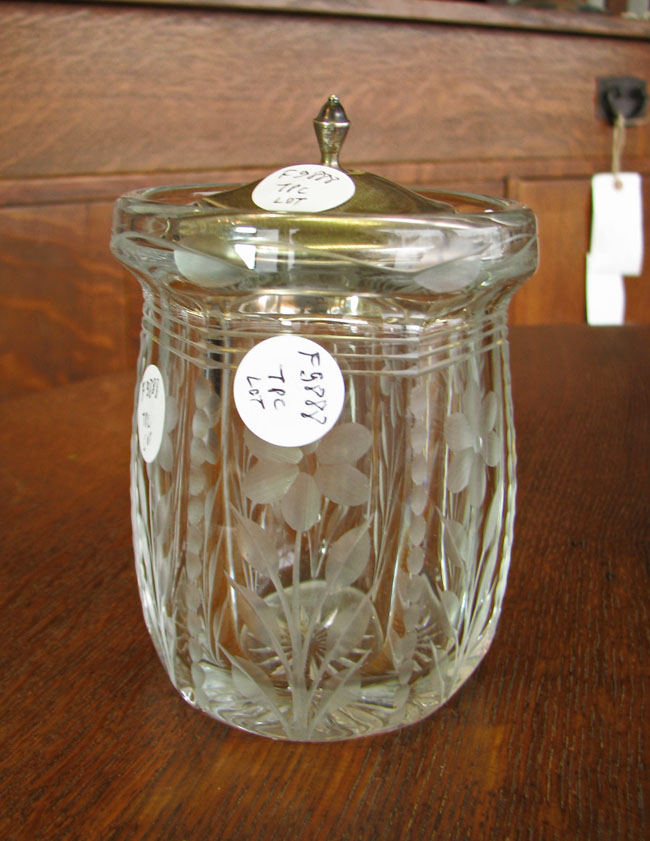 This is a 7 piece collection of good, high quality cut glass from the early 1900’s in excellent condition. There is one cup, a vase, a decanter, a lidded dish, a lidded dish with silver lid, an ashtray, and a column or prism. All are excellent except for the prism which has a chip on the base as pictured. The items have an excellent pattern and are very solid and heavy.