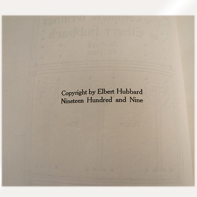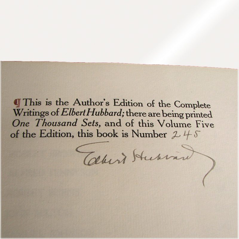“This is the Author’s Edition of the Complete Writings of Elbert Hubbard; there are being printed One Thousand Sets, and of this Volume Five of the Edition, this book is Number 245.”