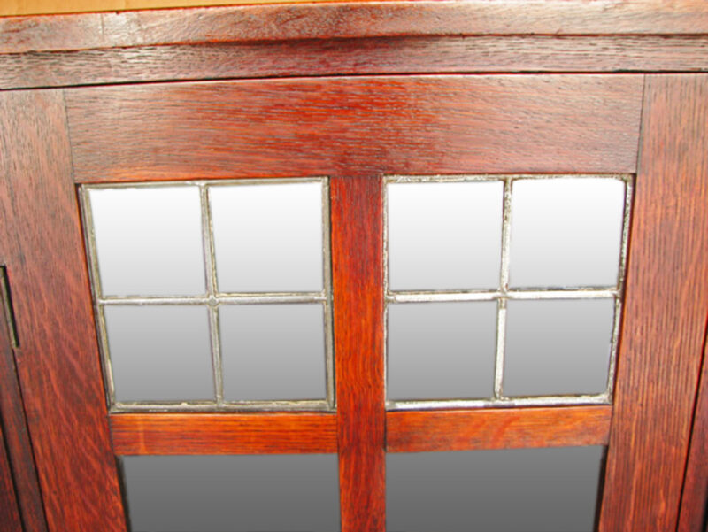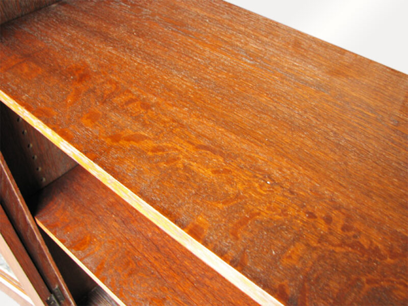 The interior is divided in two with 3 adjustable quarter sawn oak shelves in each side.