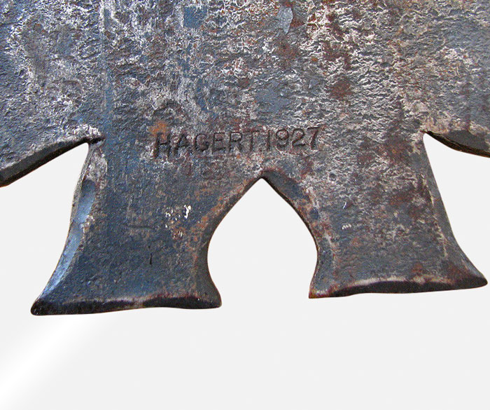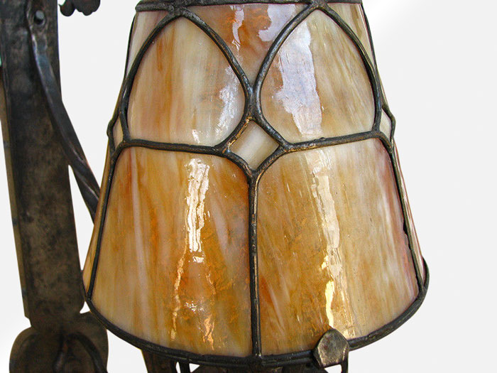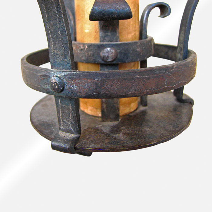 The piece is made of thick hand wrought iron with a hammered texture in some areas. There is particularly fine workmanship in the fixture area where many rivets hold together the wrought iron.