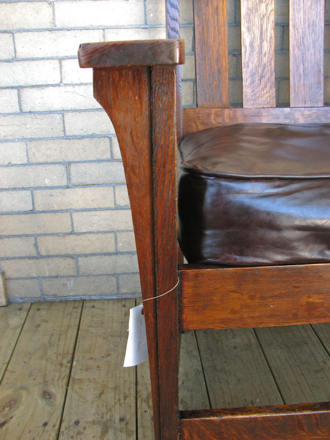 The piece has a good original finish over excellent quarter sawn oak with minor wear from normal use on the back and arms.