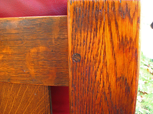 There are through tenons at the sides and the cushions are covered in quality maroon vinyl.