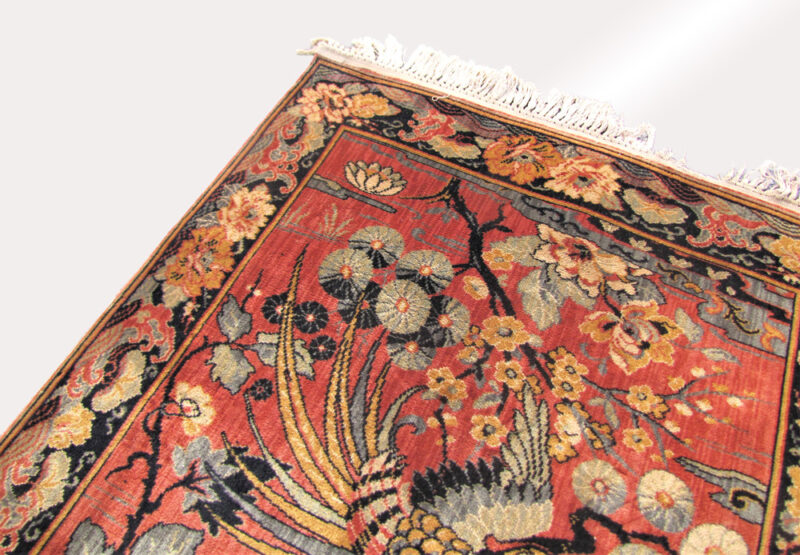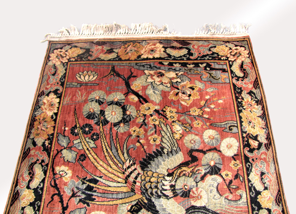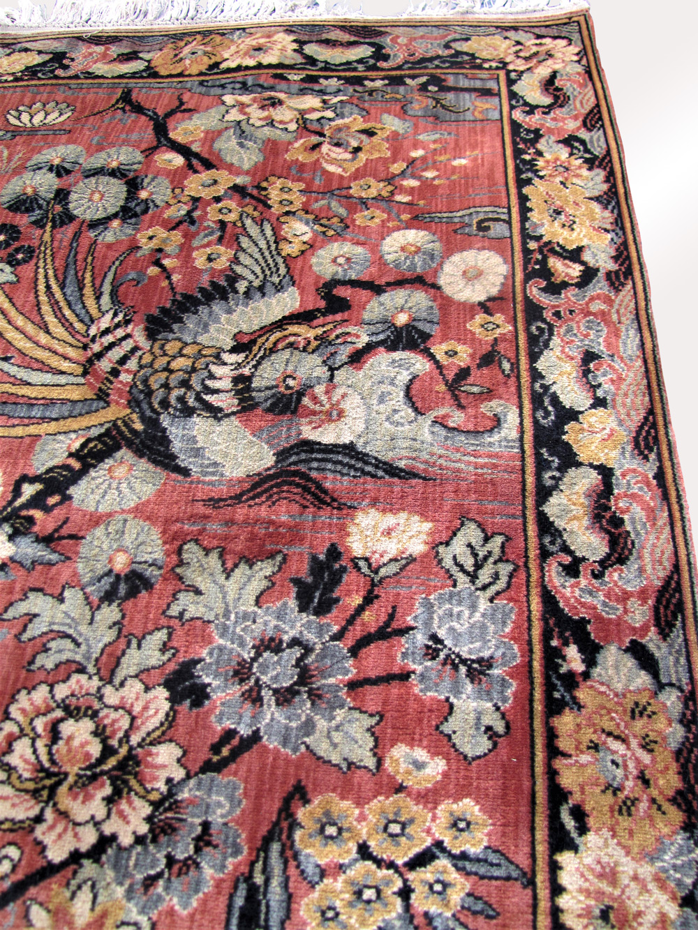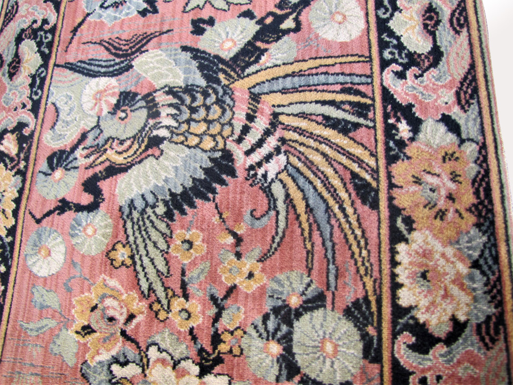 This is an antique Anglo Persian Wilton rug with a Bird of Paradise design.