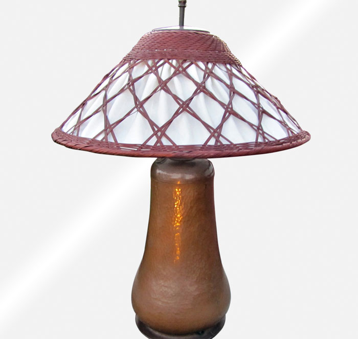 The cup on this lamp is original and there are no repaired or replaced parts on this lamp. The shade is a Japanese wicker shade and it does come with the lamp. This lamp needs to be rewired but would be an easy project. This table lamp is much larger than most Gustav Stickley table lamps that you see around.