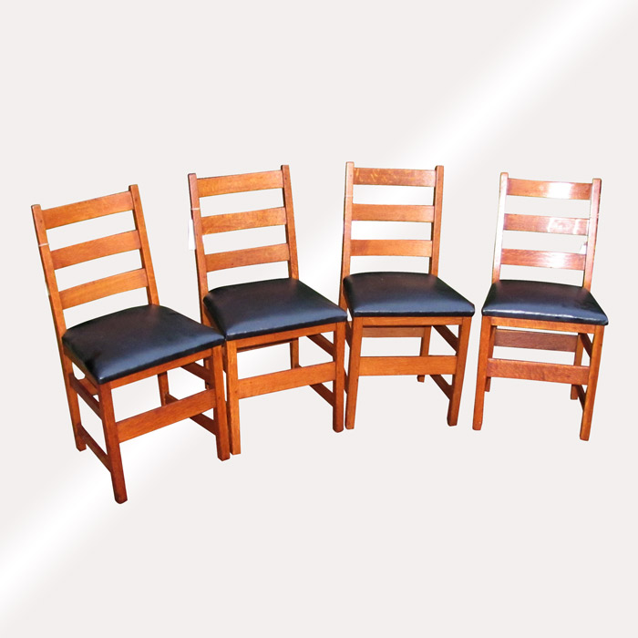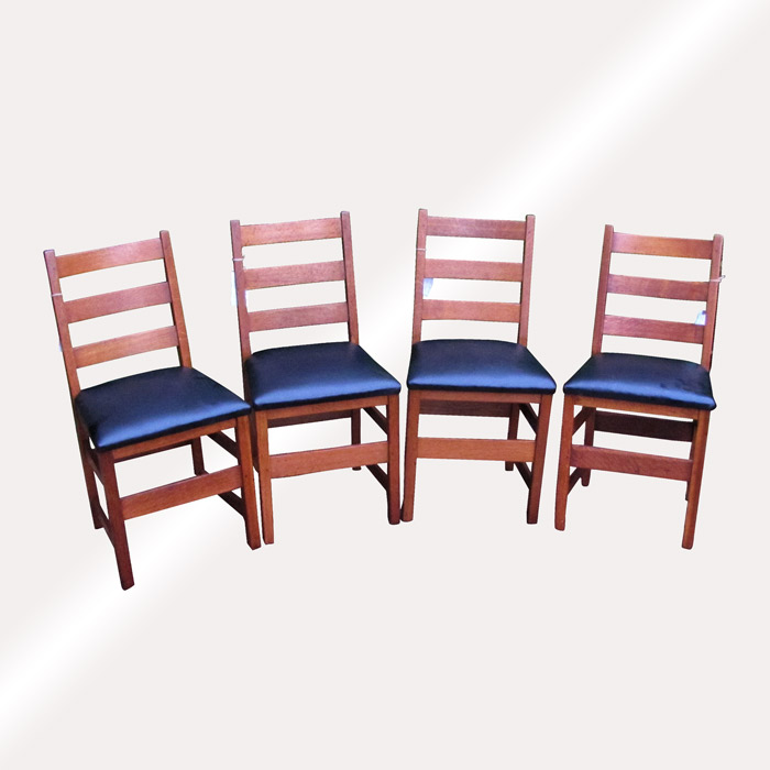 This is a Superb Antique Set of 4 L&jG Stickley Side Chairs from the early 1900s. These chairs are in very good condition with a beautiful original finish and color! The chairs are pinned all around and they are marked. The seats have been recovered with a top quality black hand-rubbed leather filled with cotton and hair.