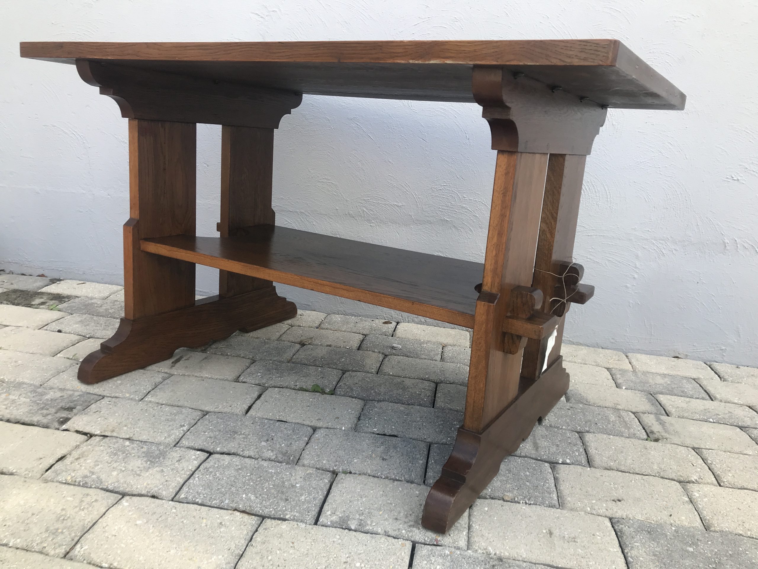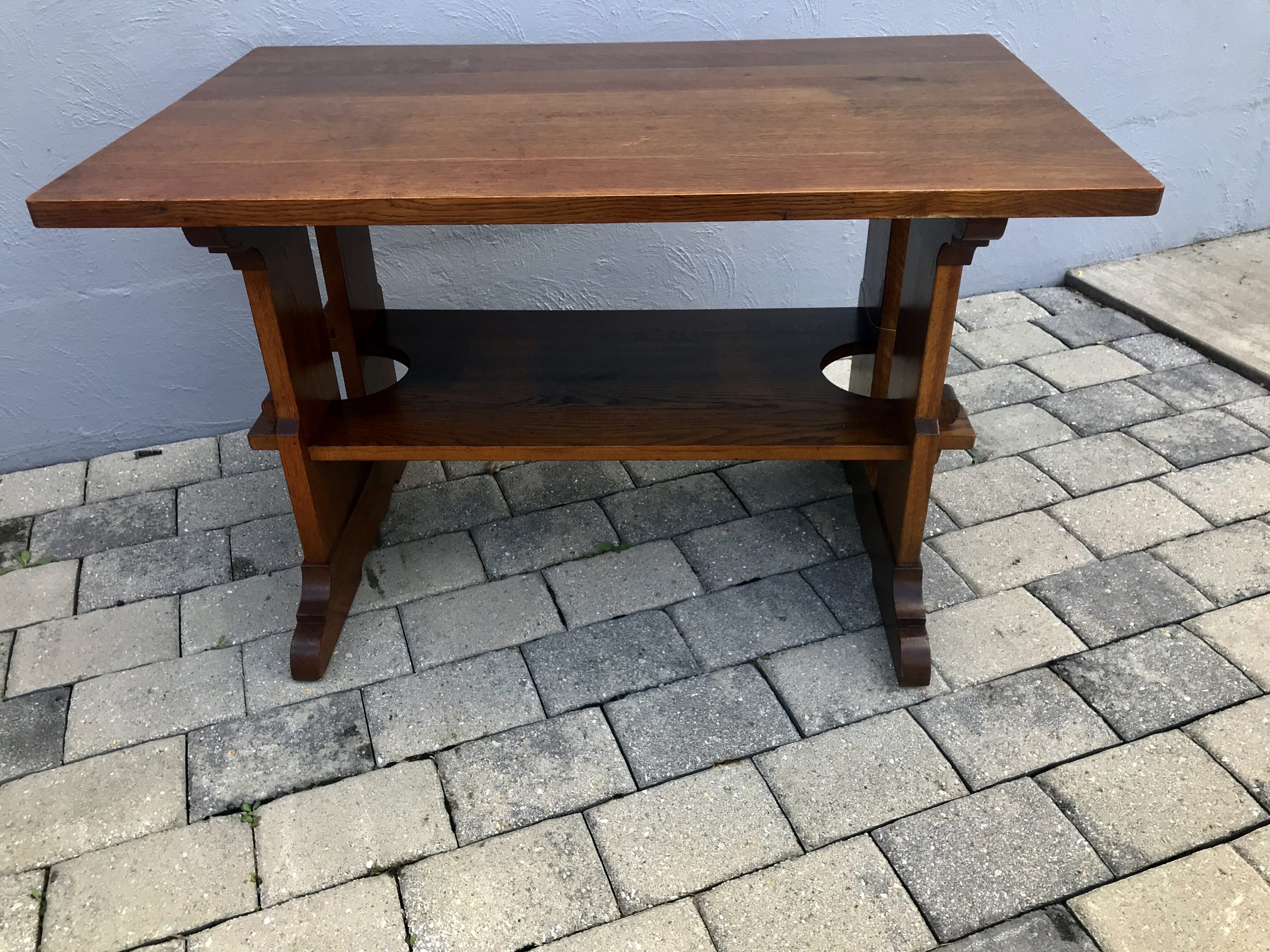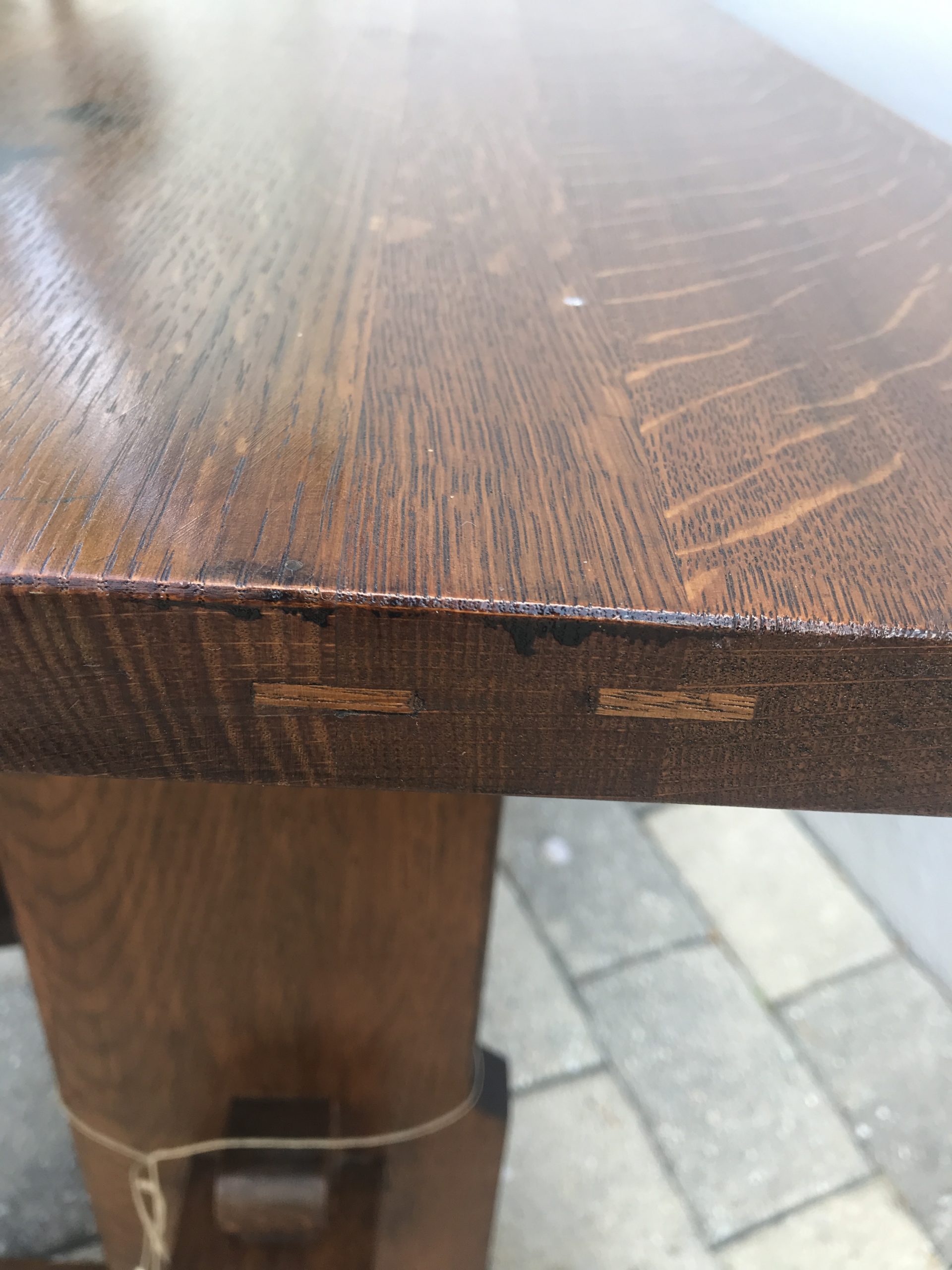 This is a SUPERB L&G Stickley Antique Trestle Table. This is a great looking, early L&G Stickley trestle table with 2 keys through tenon construction on each side with excellent originbal color and finish. The top has some wear from normal use. The top is splined in several places as you can see from the pictures. It is marked with the decal, as most people want. The table is bulky, sturdy, strong with no repairs or replaced parts, and ready to use in your home.