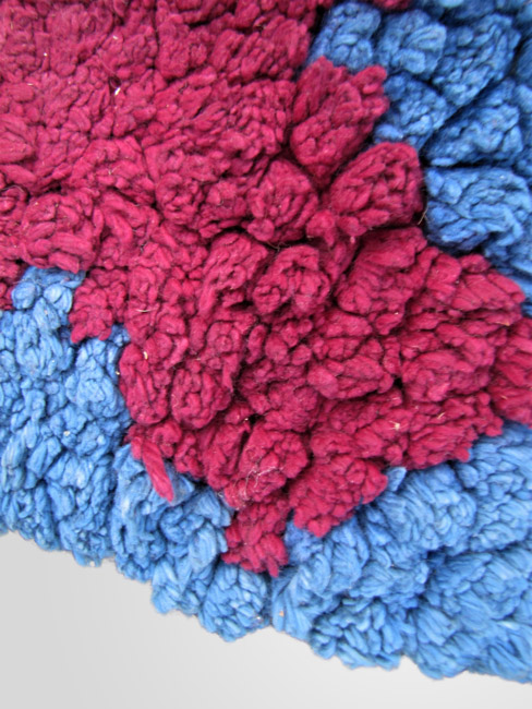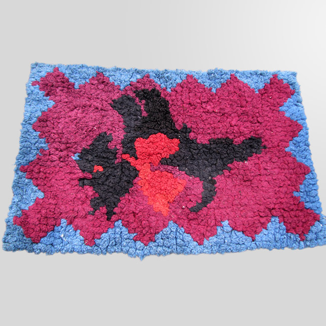 It looks like it is a home made rug. The background of the rug is purple with the other colors being black, red, and blue.