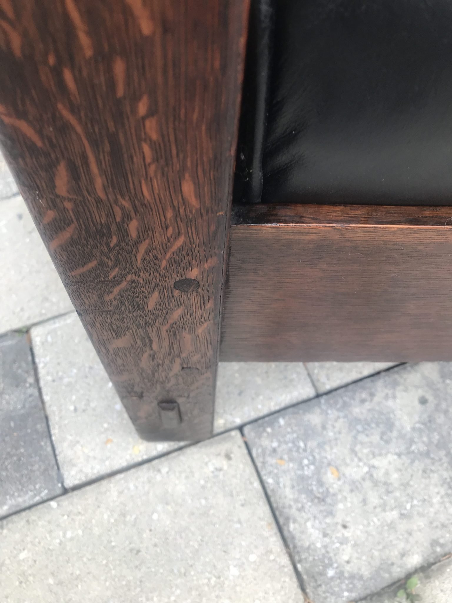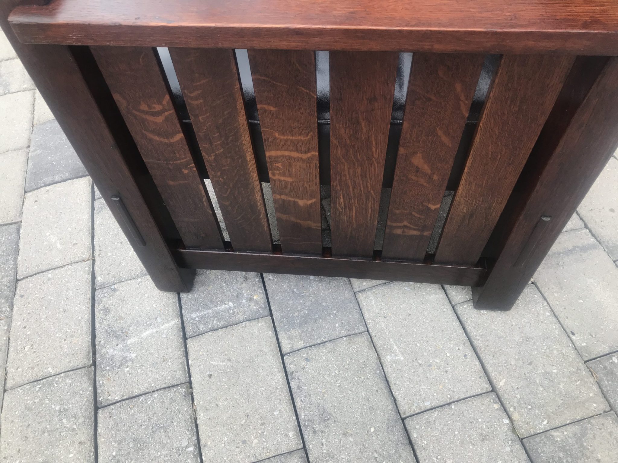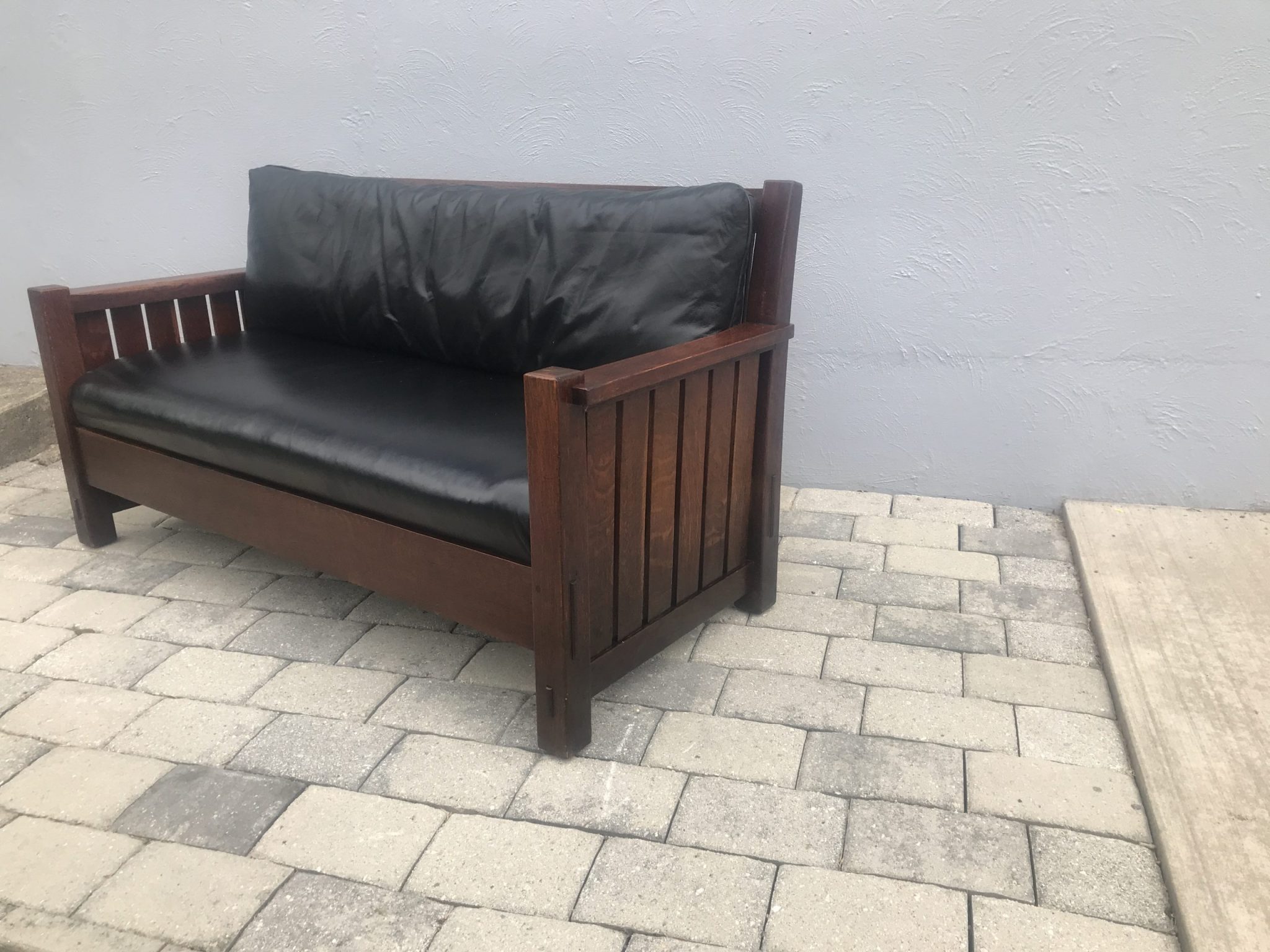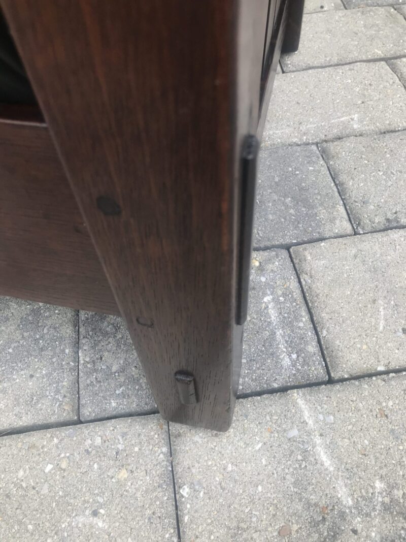 This is a great looking antique L&G Stickley settle in excellent condition. The design is from the early 1900’s. The settle is with through tenant construction all around, as well as pinned all around. In our opinion, this is one of the nixest L&G Stickley made. You don’t see many like this, and this is only the second we have ever sold. This is usually sold in a set of 3 with an arm chair and rocker. This settle is not big and bulky, and is good for smaller spaces. The whole back is bent, as you can see from our pictures. Beside the original seat, we have a back cushion that you can use. It looks nicer with the curved slats in back without it. This is made with quarter linear post on each leg, as you can see in the pictures. We sell special items that others don’t. Most are bought from collections in NYC in excellent condition, as other people buy as is. We pay more for the best. We try to post as many photo studio pictures so you know exactly what you are buying. We offer special pieces that you can’t find any where else. We have a fantastic selection of anqitue, Persian and other rugs. Prices for rugs from 40 or 50 years ago are down sometimes as much as 90%.