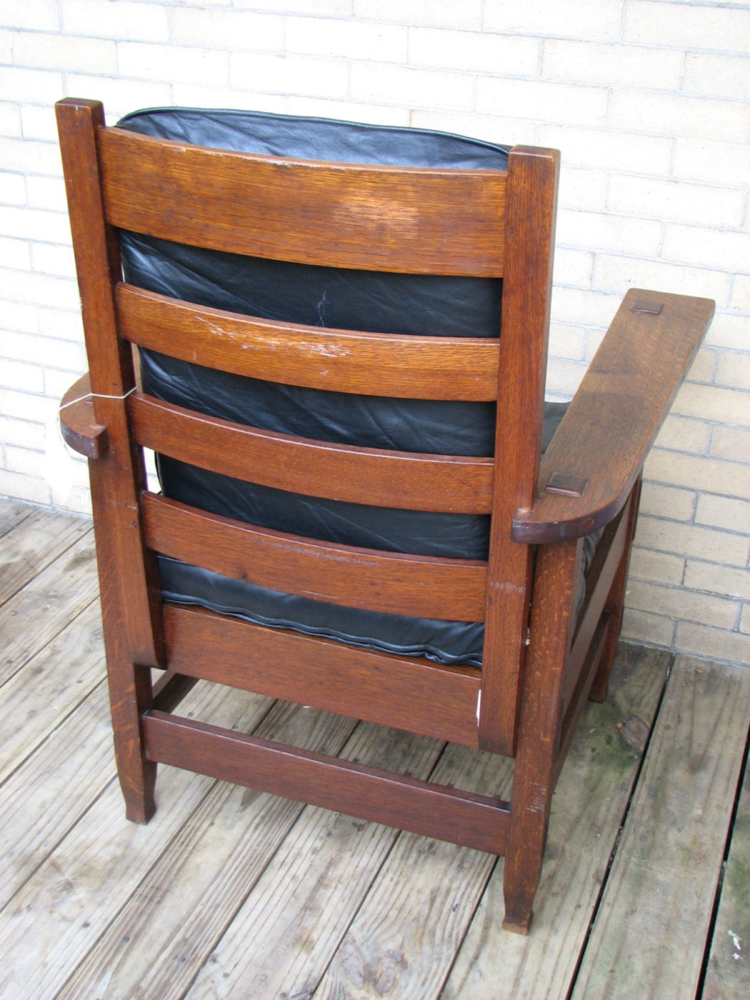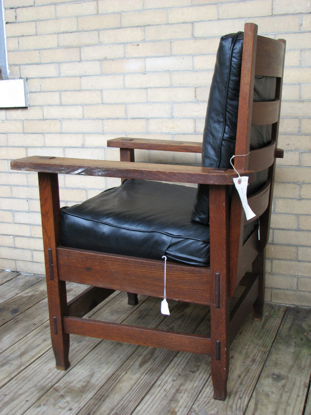 This is a heavy duty large antique Stickley?brothers arm chair in very good condition. ?The seat is recovered with high-quality hand rubbed black leather. There are no repairs or replaced parts. This is sturdy and strong ready to be used in your home.