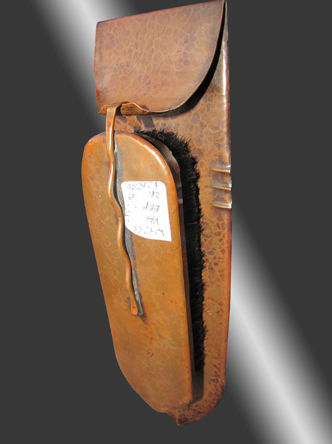 This is a very interesting piece. We believe this is Van Erp but there are no markings for us to be sure. ?This is hammered copper with a stiff horsehair?bristles. ?There is a?hole to mount this to the wall and the brush hangs from the curved lip. This has original patina and is with no repairs or replaced parts.