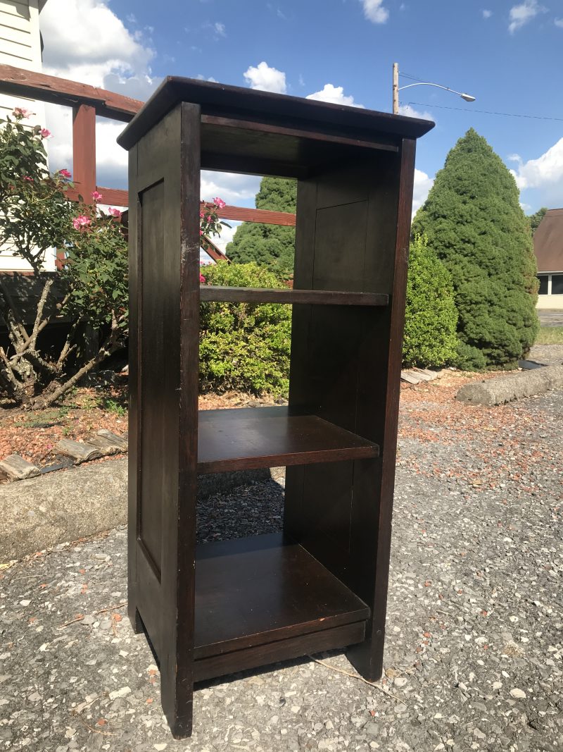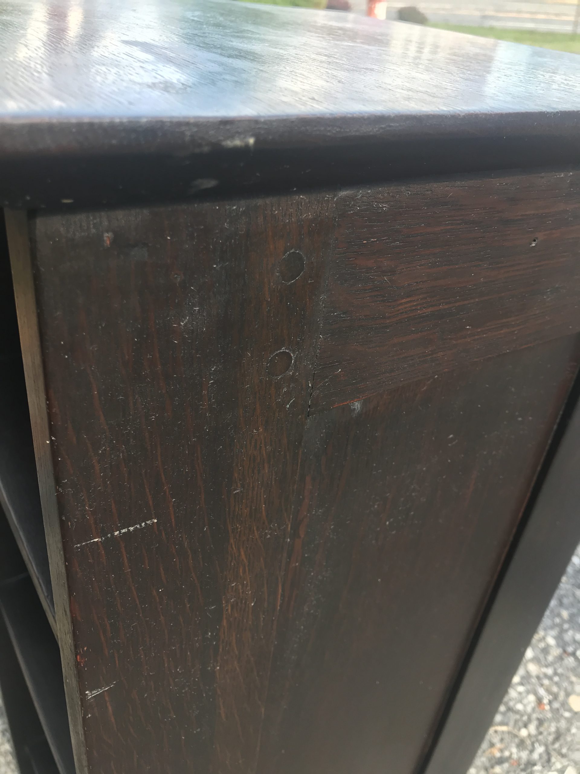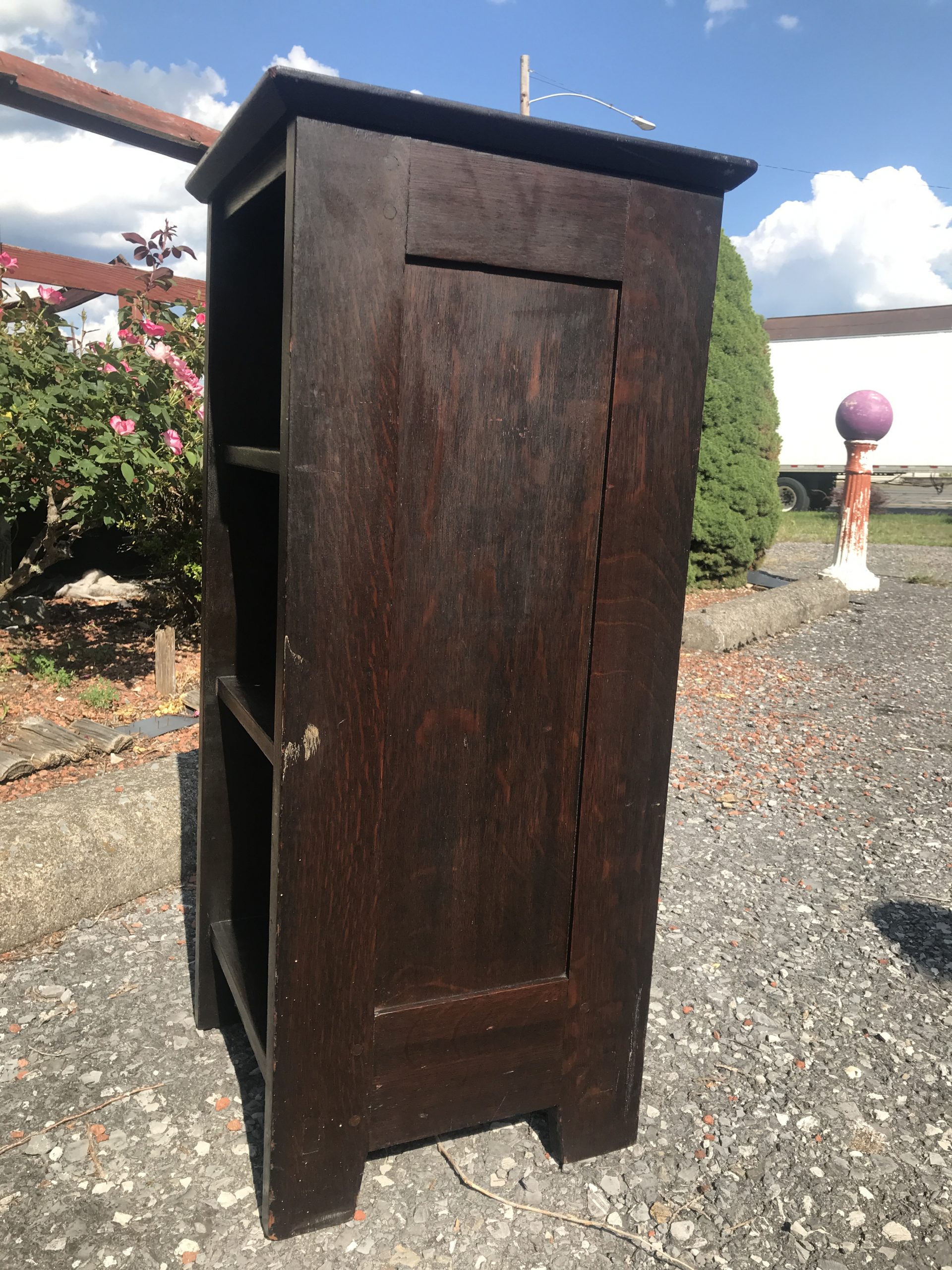 This is an important piece of work by Gustav Stickley circa 1901. It is a magazine stand or bookcase. It is constructed with flush through tenant construction and double pinned all around and panel sides, as pictured. The stand is with original fumed black finish with minor wear and without any overcoat. Over the years, we have sold only a few of this model, because it is very rare. This one has the best original fumed black finish that we have ever found.