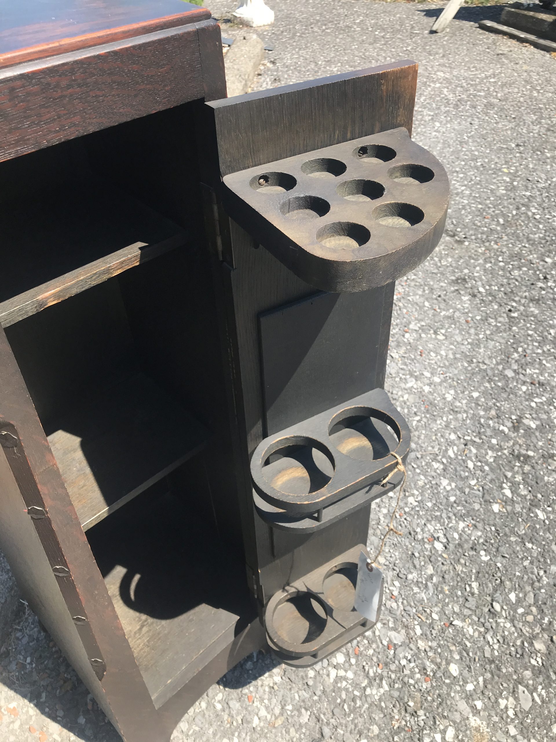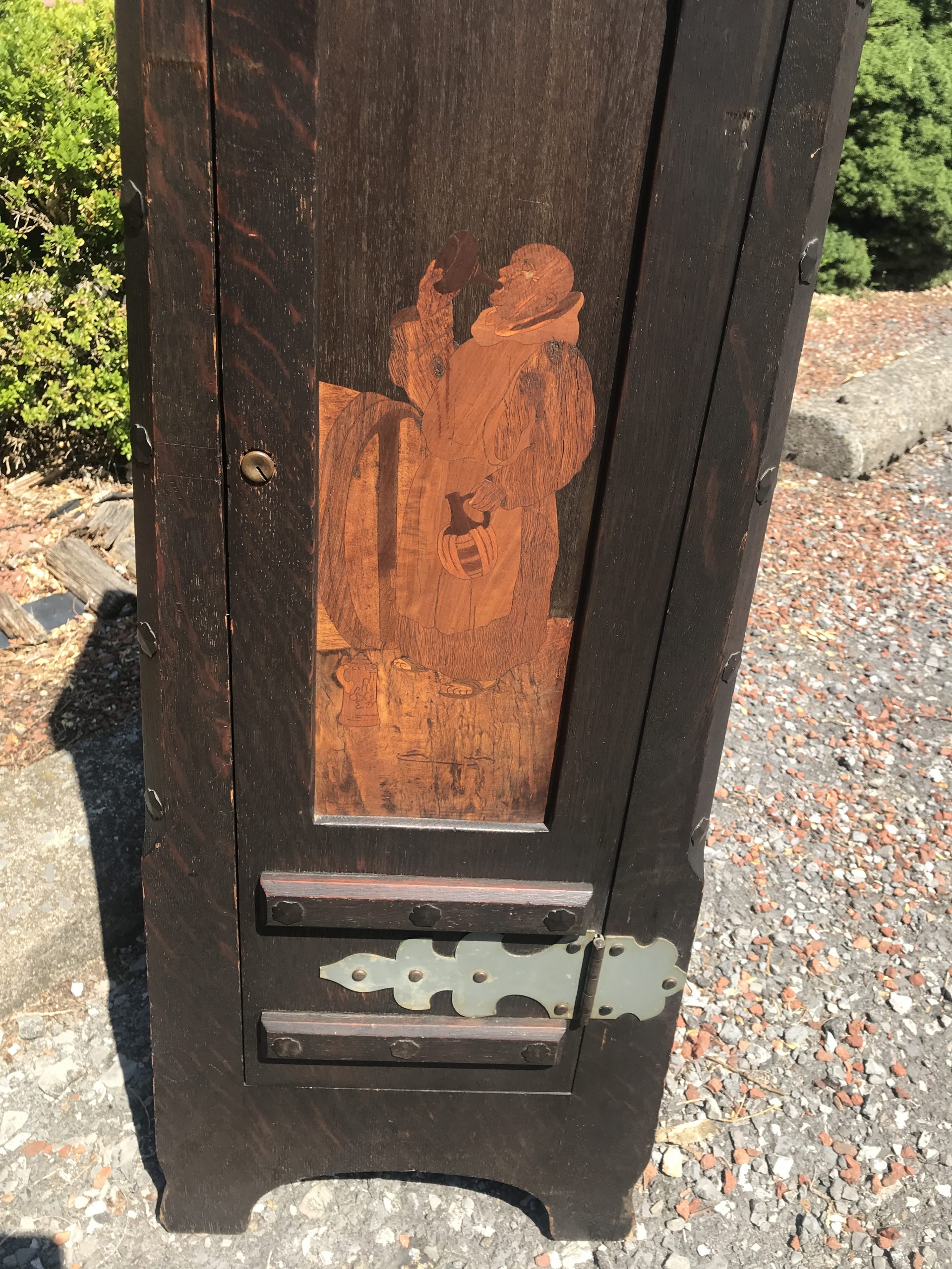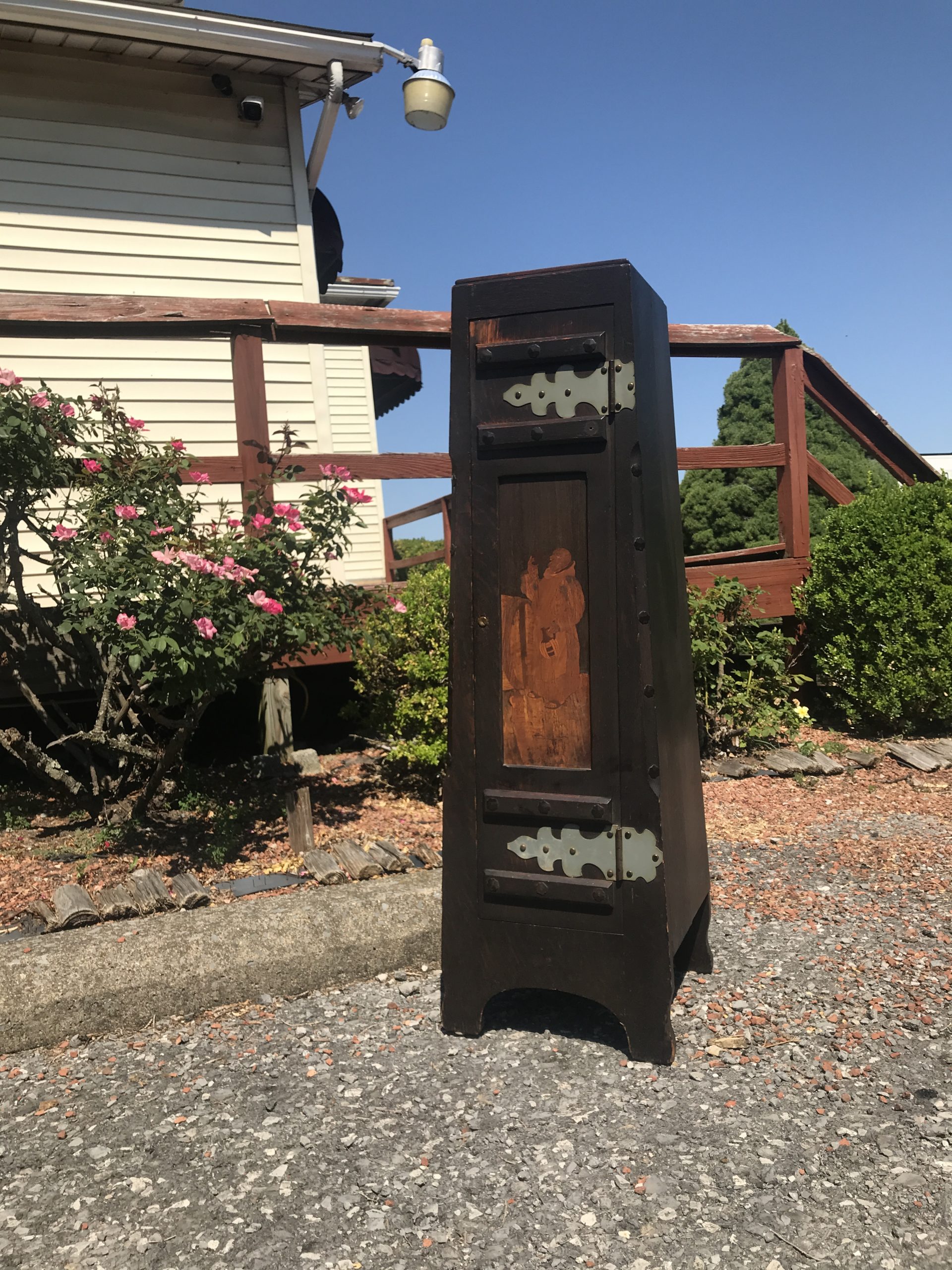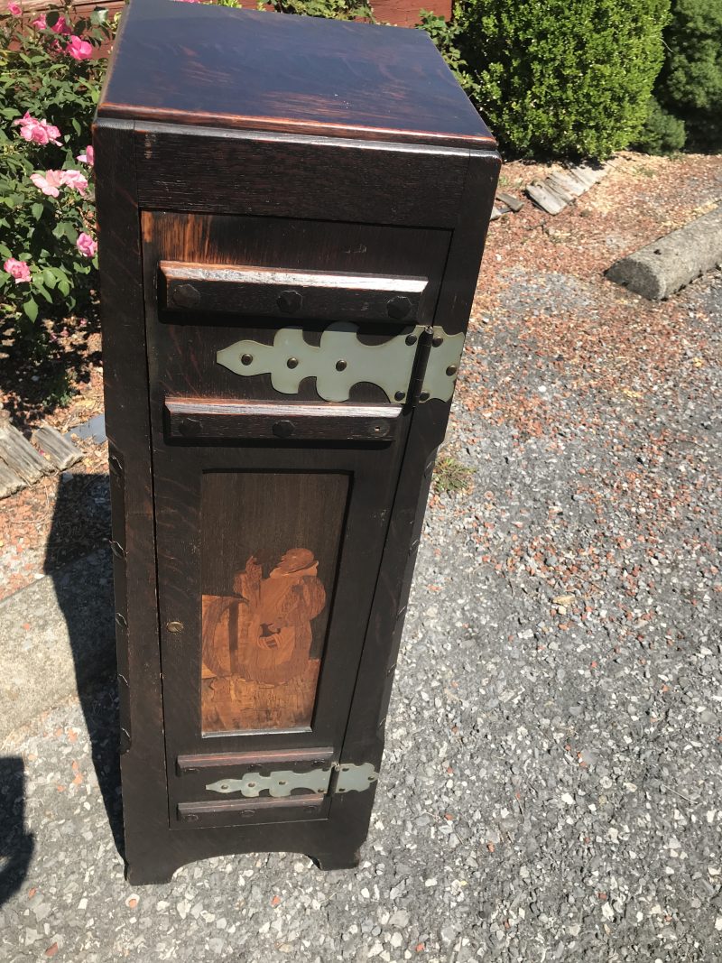 This is an antique Shop of the Crafter decorated cellaret made in the early 1900’s by Shop of the Crafter in Cincinnati, Ohio. The cellaret inside is complete. It has a beautiful hammered zinc decoration and inlay on the front in perfect shape. There is a wear spot about 1 inch squared that we can add color to so you will not see it.
