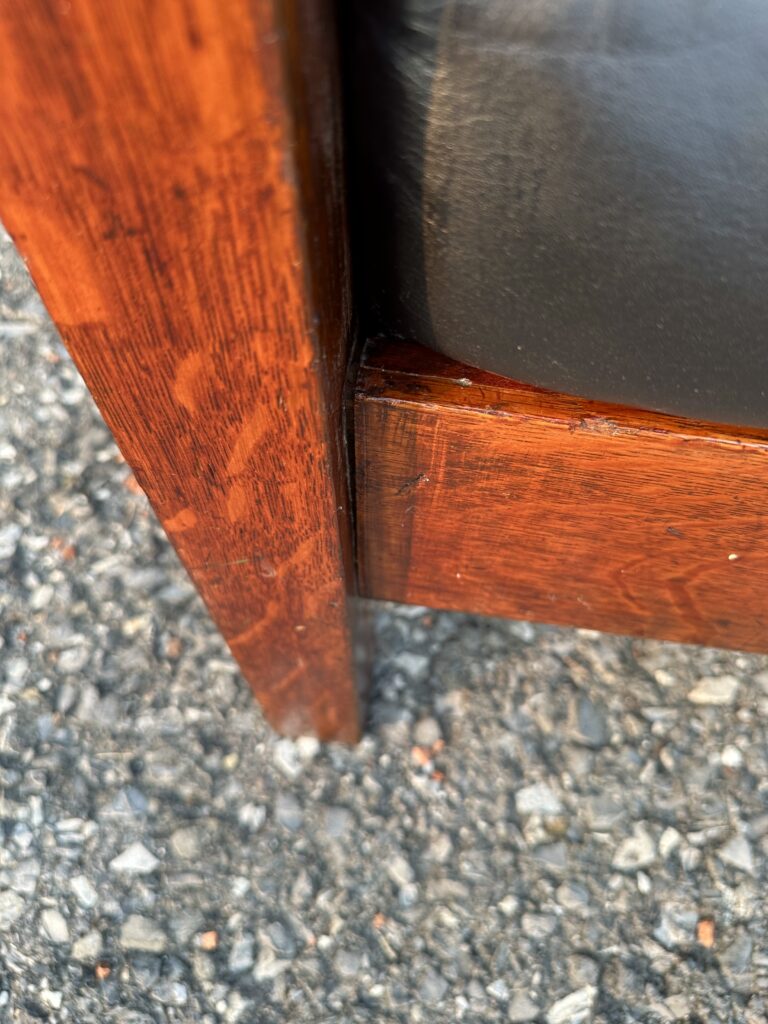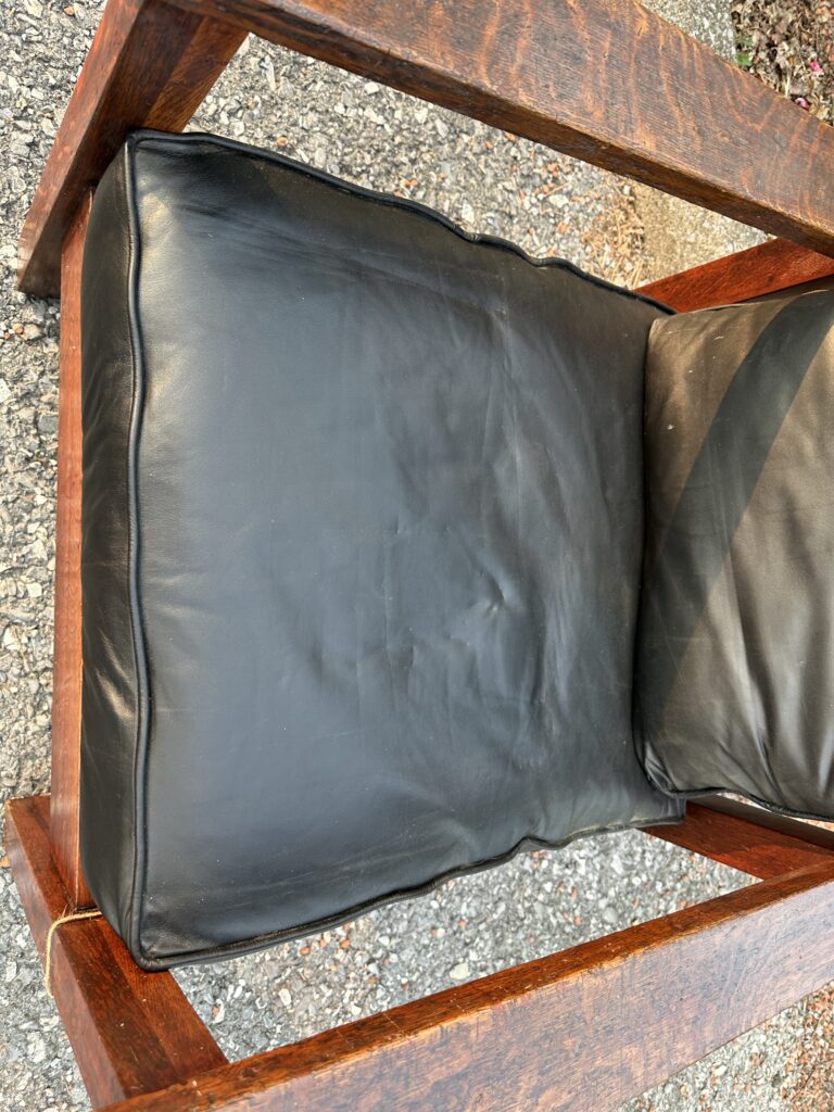 THIS IS AN ANTIQUE MORRIS CHAIR FROM THE EARLY 1900S BY BROOKS ITS MADE WITH OAK WITH SLOTS TO THE SIDE WITH ORIGINAL FINISH WITH REAL TRUE TENNON CONSTRUCTION WITH ORIGINAL PINS AS WELL GREAT ORIGINAL FINISH WITH GREAT SELECTION OF QUARTERSTONE OAK ITS UPHOLSTRY IS NEW WITH HANDSPUN LEATH AND THE SEAT AND BACK CUSHION ARE FILLED WITH HAIR AND COTTON LIKE ORIGINALLY IN THE 1900S STURDY AND STRONG AND READY TO USE IN YOUR HOME ITS PINNED ALL AROUND