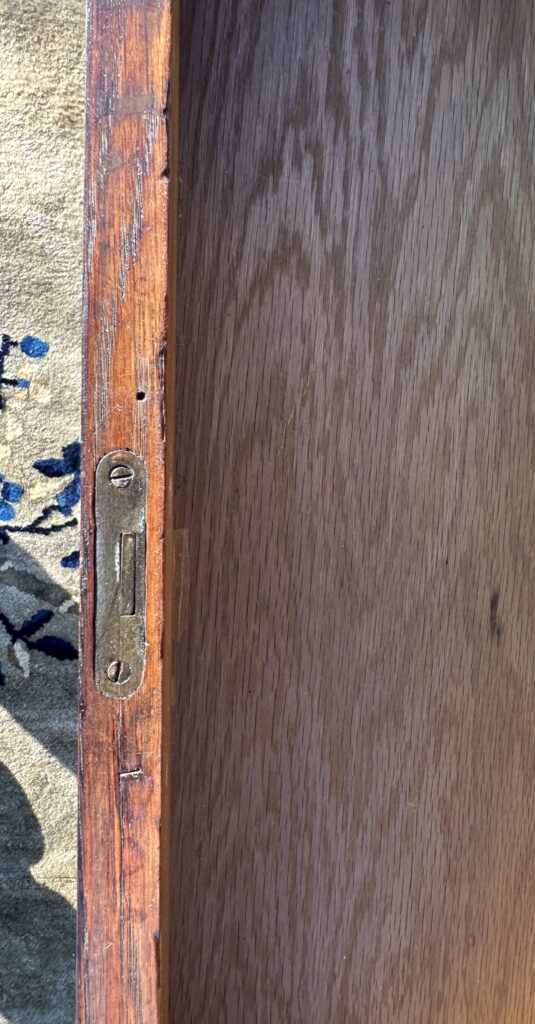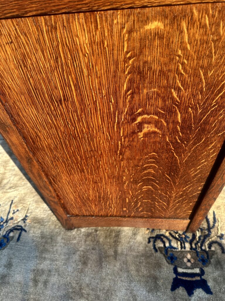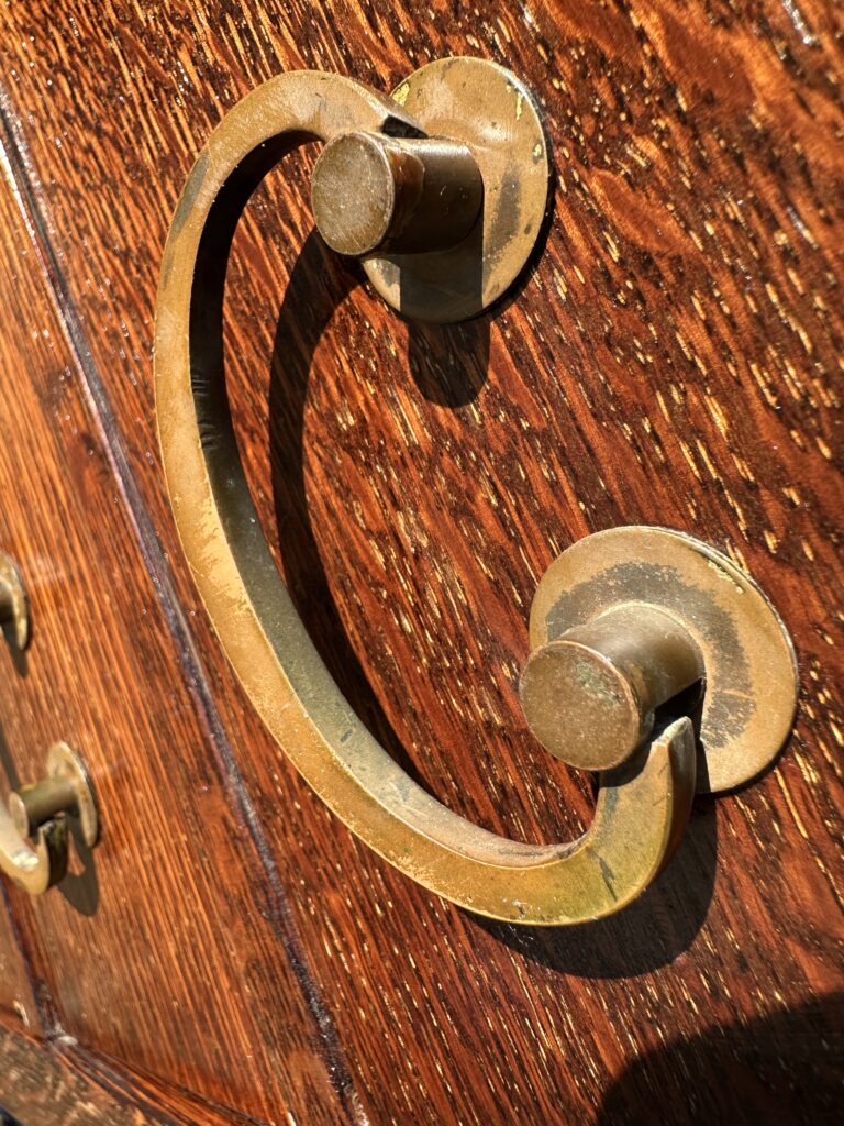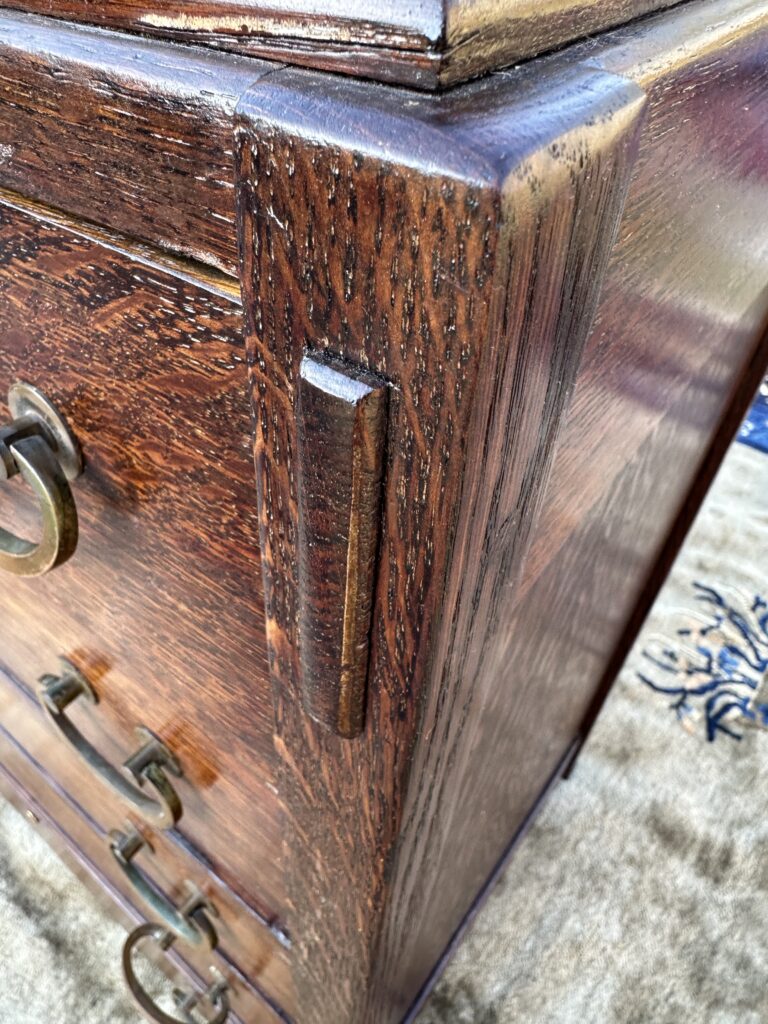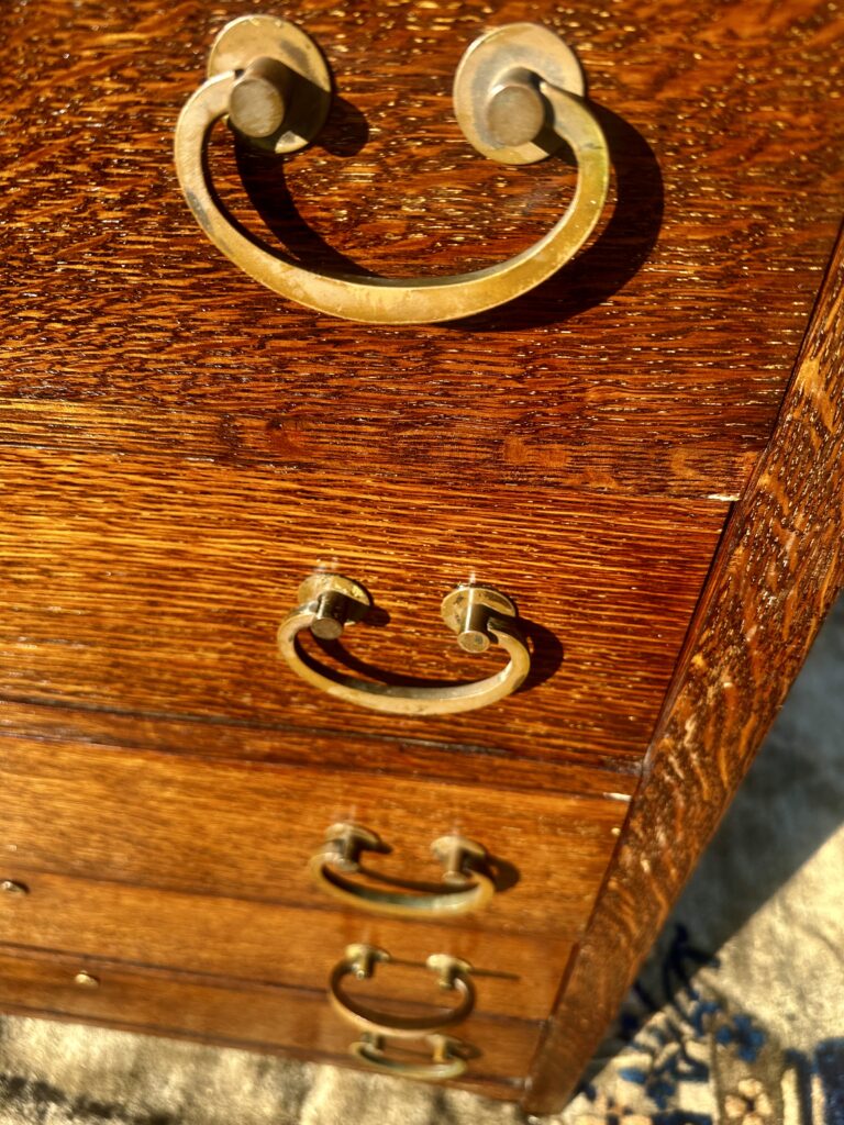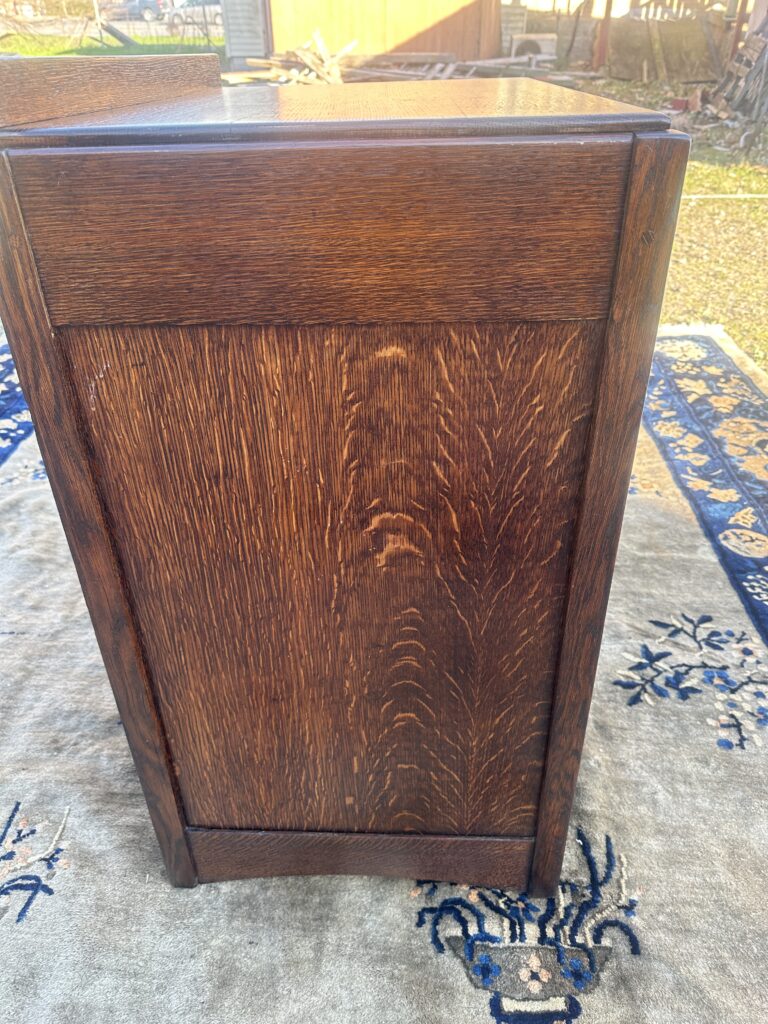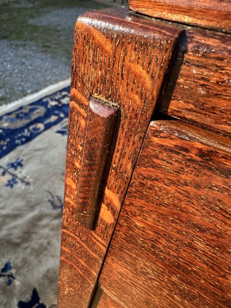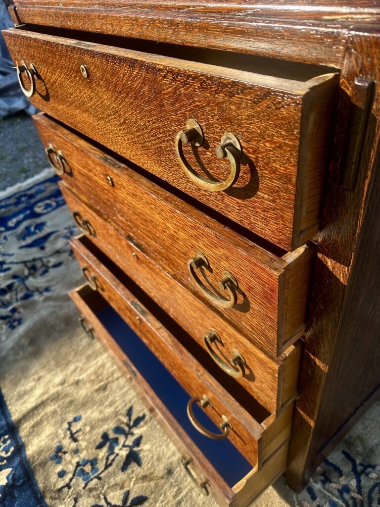 This is an antique Charles Limbert chest of drawers made in the early 1900s, this one was made in likely 1910, the chest is refinished from a while back and is made out of fantastic selection of quarter stone oak, it comes with original tan brass pull and constructed with authentic true tenon construction as pictured on the top on each side and it is pinned all around, we think the back panel is replaced but it looks old to us, it comes with original gallery on the top for your information, Charles Limbert used the same techniques as Gustav Stickley