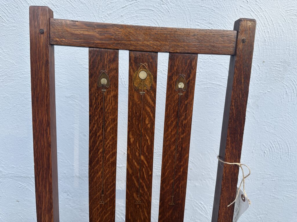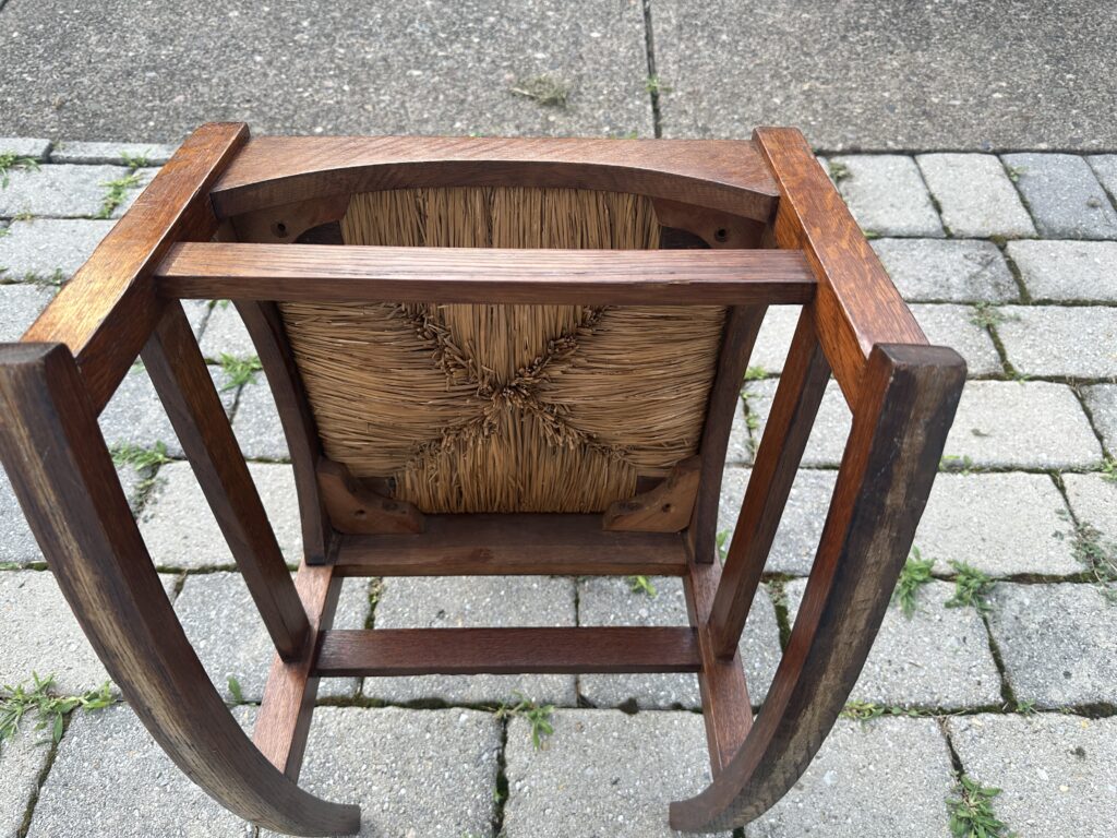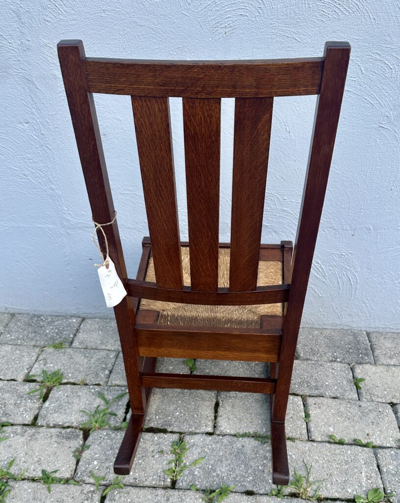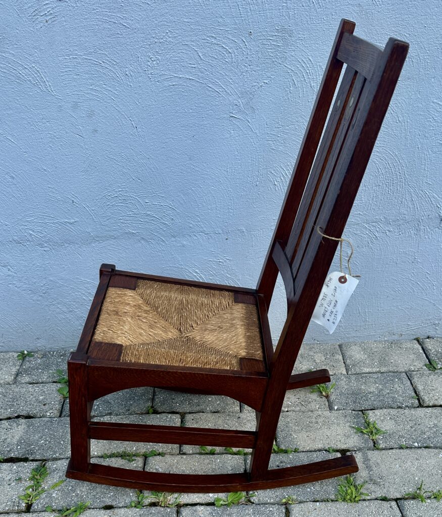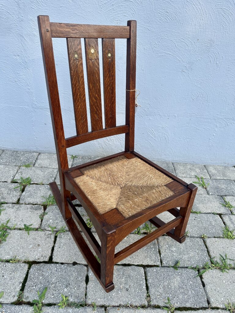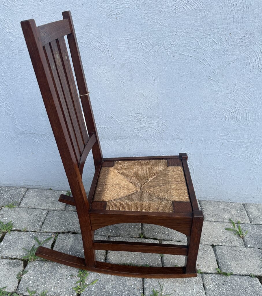 כללי W7885 #1945 ANTIQUE GUSTAV STICKLEY HARVEY ELLIS INLAID ROCKING CHAIR WITH ORIGINAL RUST SEAT FROM 1901 $1950 Alon9090 April 13, 2026 THIS IS A RARE GUSTAV STICKLEY ROCKING CHAIR WITH INLAID FROM 1901 WITH ORIGINAL INLAID IN EXCELLENT CNDITION WITH GREAT ORIGINAL FINISH