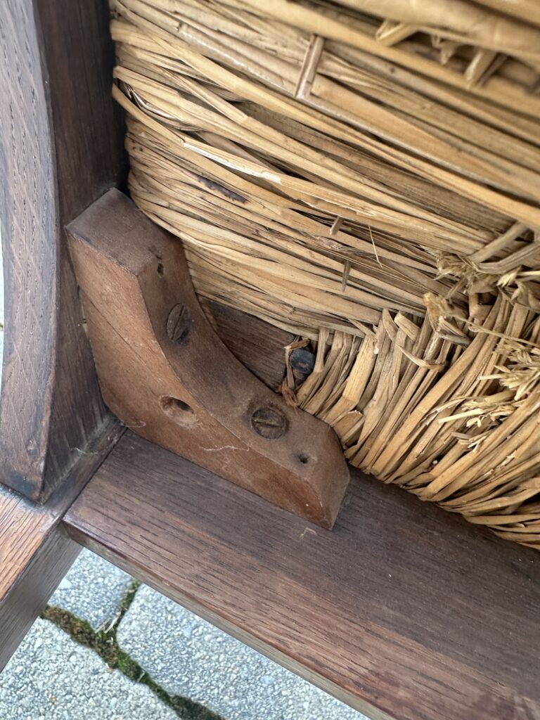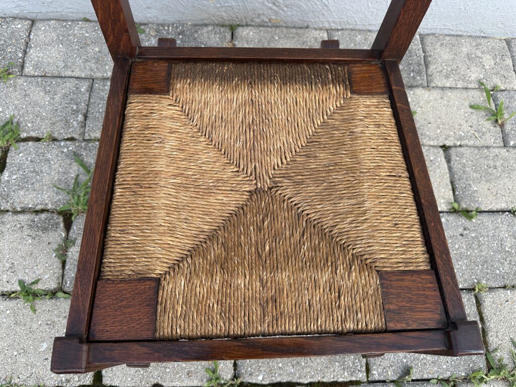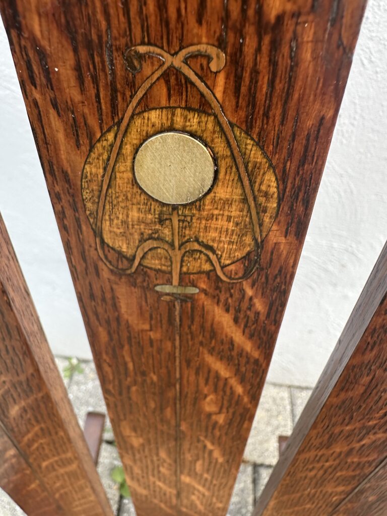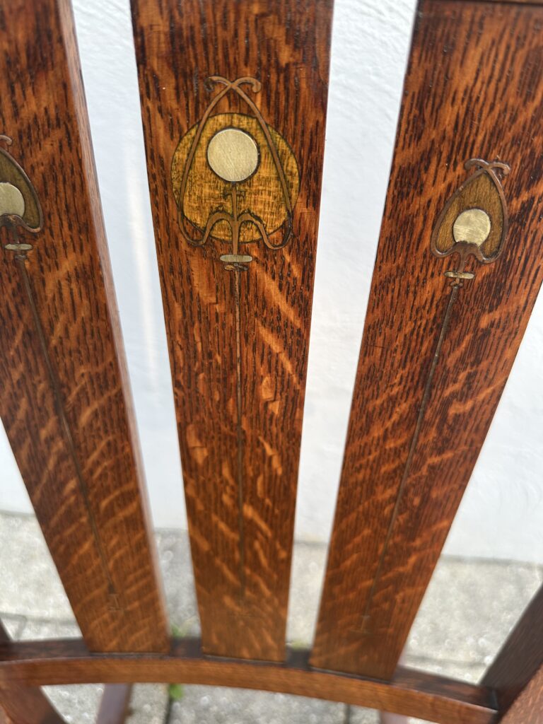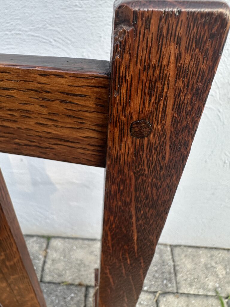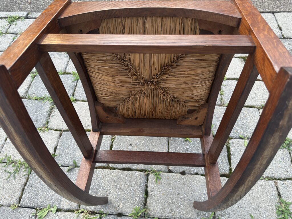 כללי W7885 #1945 ANTIQUE GUSTAV STICKLEY HARVEY ELLIS INLAID ROCKING CHAIR WITH ORIGINAL RUST SEAT FROM 1901 $1950 Alon9090 April 13, 2026 THIS IS A RARE GUSTAV STICKLEY ROCKING CHAIR WITH INLAID FROM 1901 WITH ORIGINAL INLAID IN EXCELLENT CNDITION WITH GREAT ORIGINAL FINISH