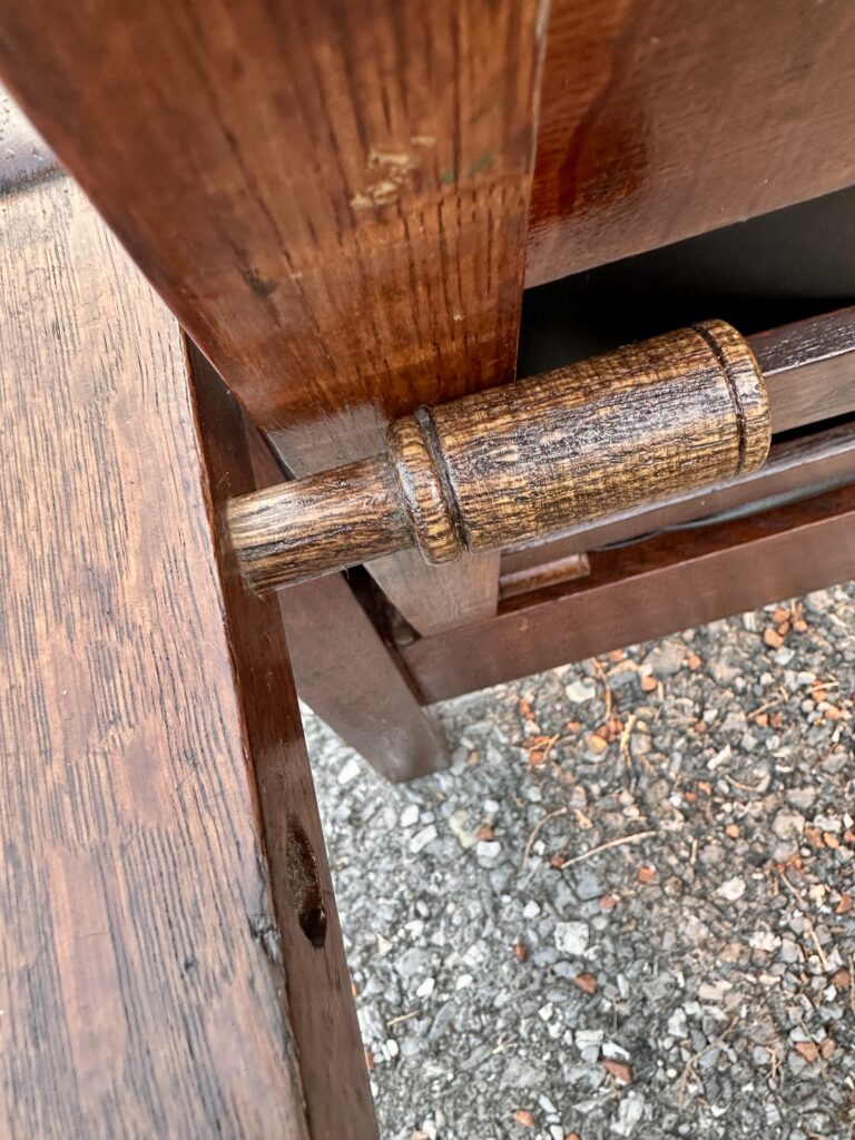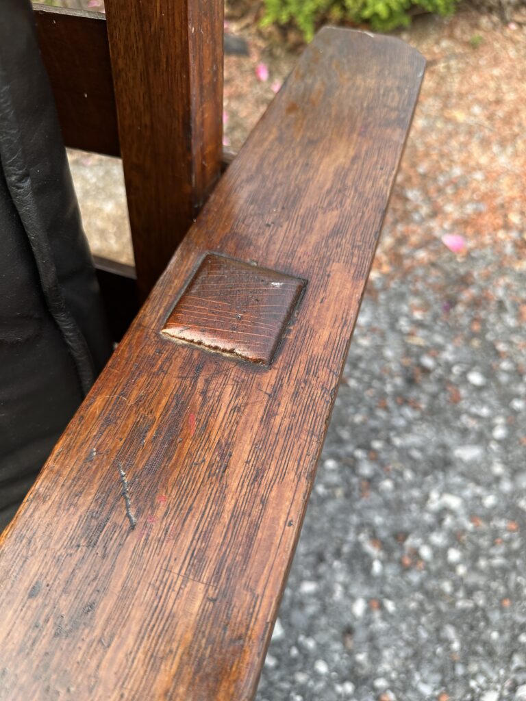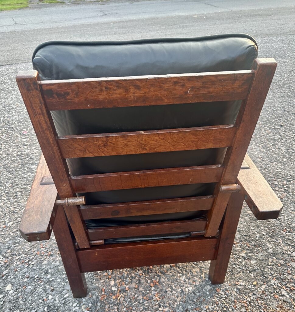 ANTIQUE STICKLEY BROS MORIS CHAIR MODEL #64 FROM 1910 MADE OUT OF OAK WOOD WITH ORIGINAL FINISH WITH NEW UPHOLSTRY BLACK LEATHER HAND-SPUN LEATHER TOP QUALITY WITH ORIGINAL BACK AND SIDE PINS AS PICTURED AND THE FILLING IS ALL COTTON AND HAIR THE SAME WAY STICKLEY MADE IT IN THE EARLY 1900S